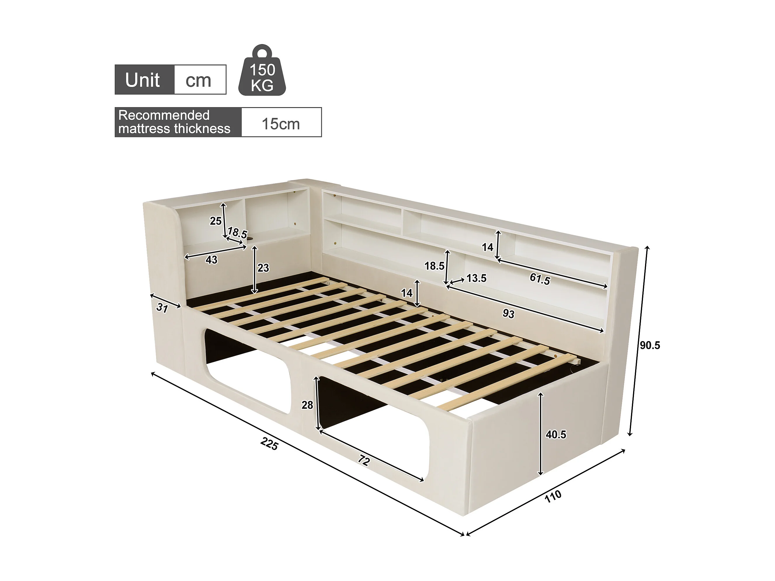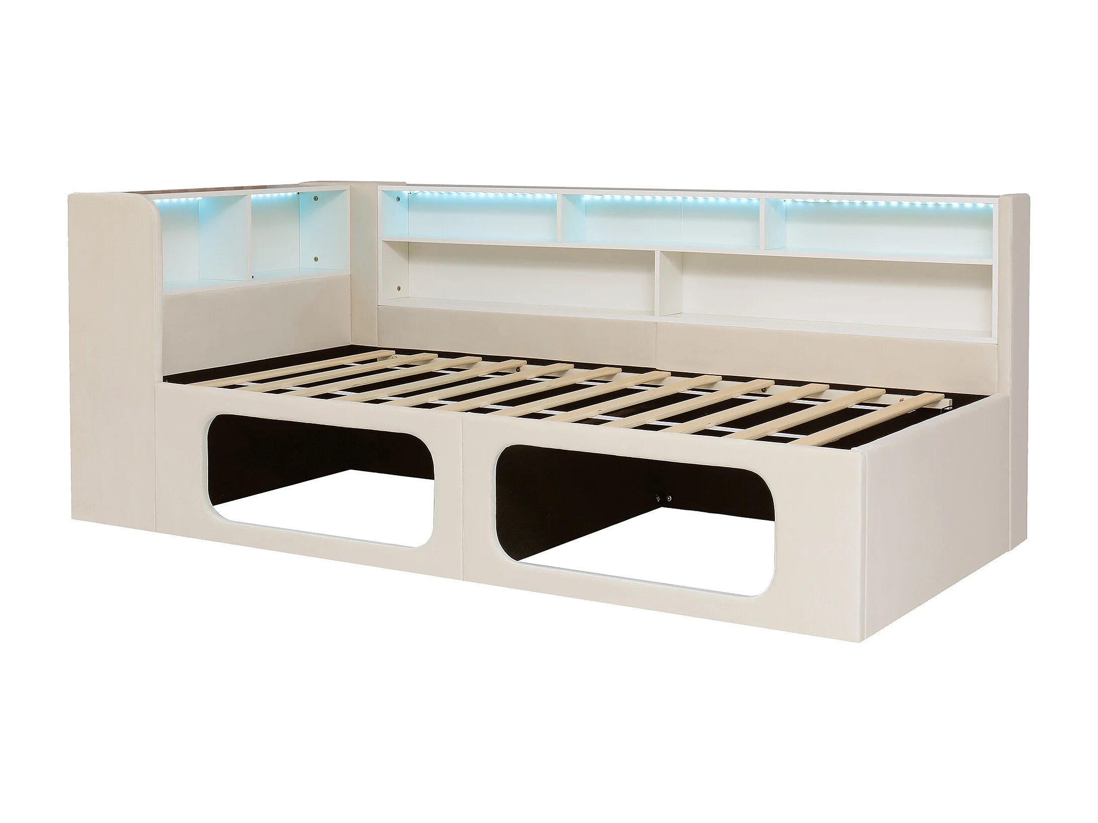 Divano letto imbottito 90x200 cm - con nicchie per animali domestici - LED, porta USB e scomparti di riporre - Velluto - Beige