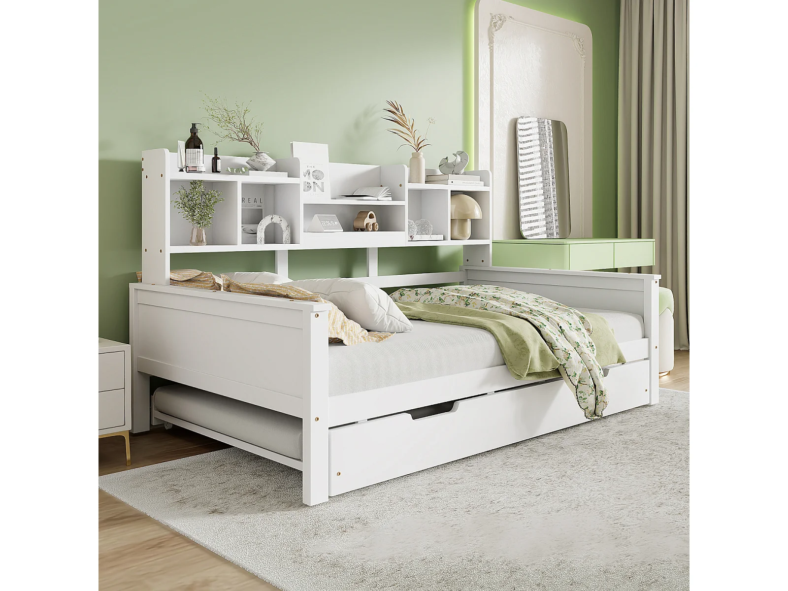 Letto estraibile 90x200cm+90x190cm, divano letto con testiera contenitore e porta di ricarica USB, bianco