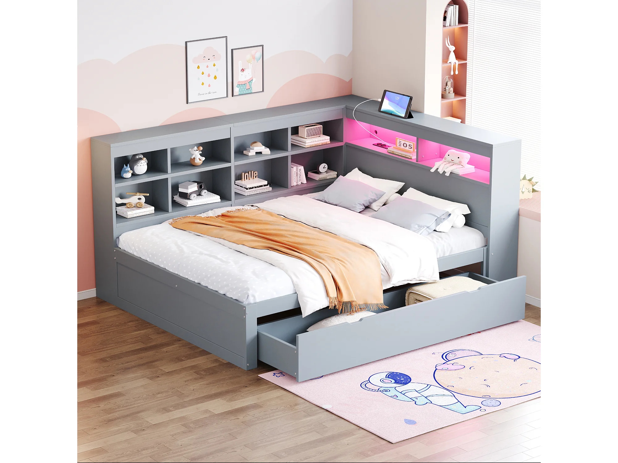 Divano letto multifunzionale 140x200 cm in legno massello grigio, ampi cassetti, LED e porta USB, ripiani – Letto matrimoniale pratico ed elegante