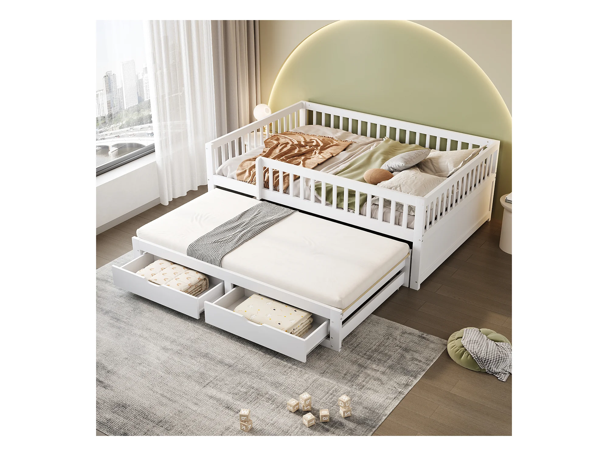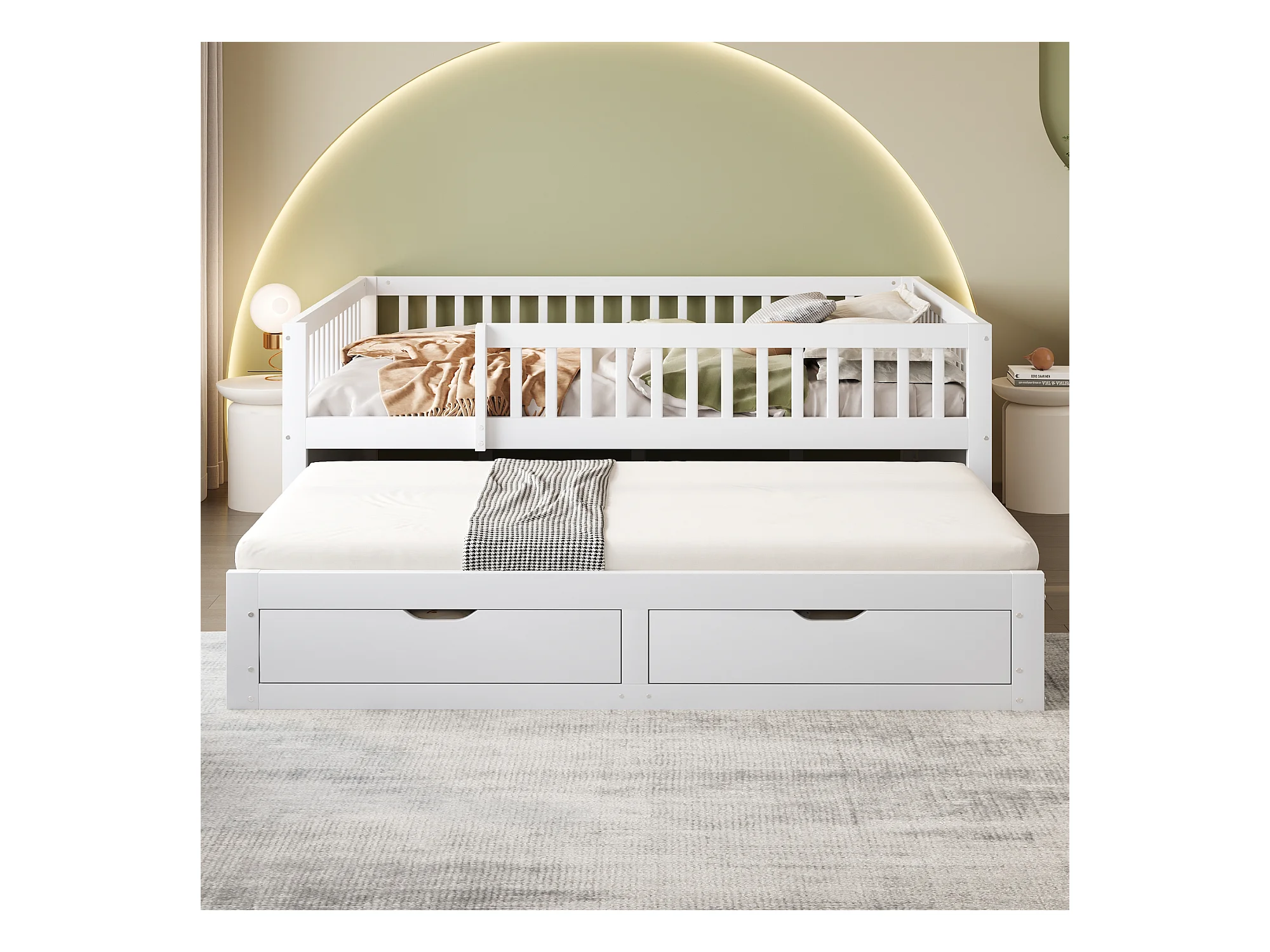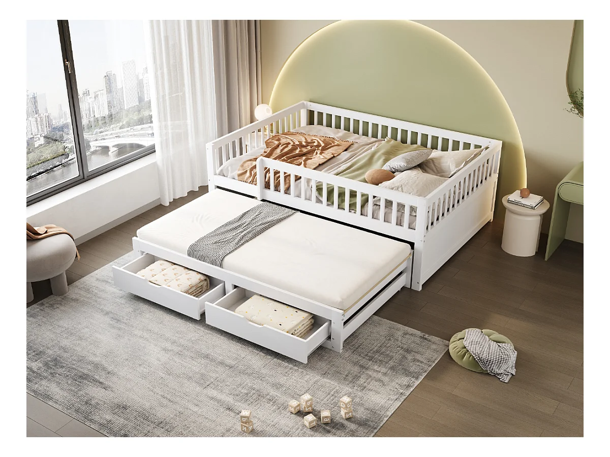 Divano letto per bambini - 140 x 200 cm + 90 x 190 cm - barriera di sicurezza - letto estraibile con 2 cassetti - legno - bianco