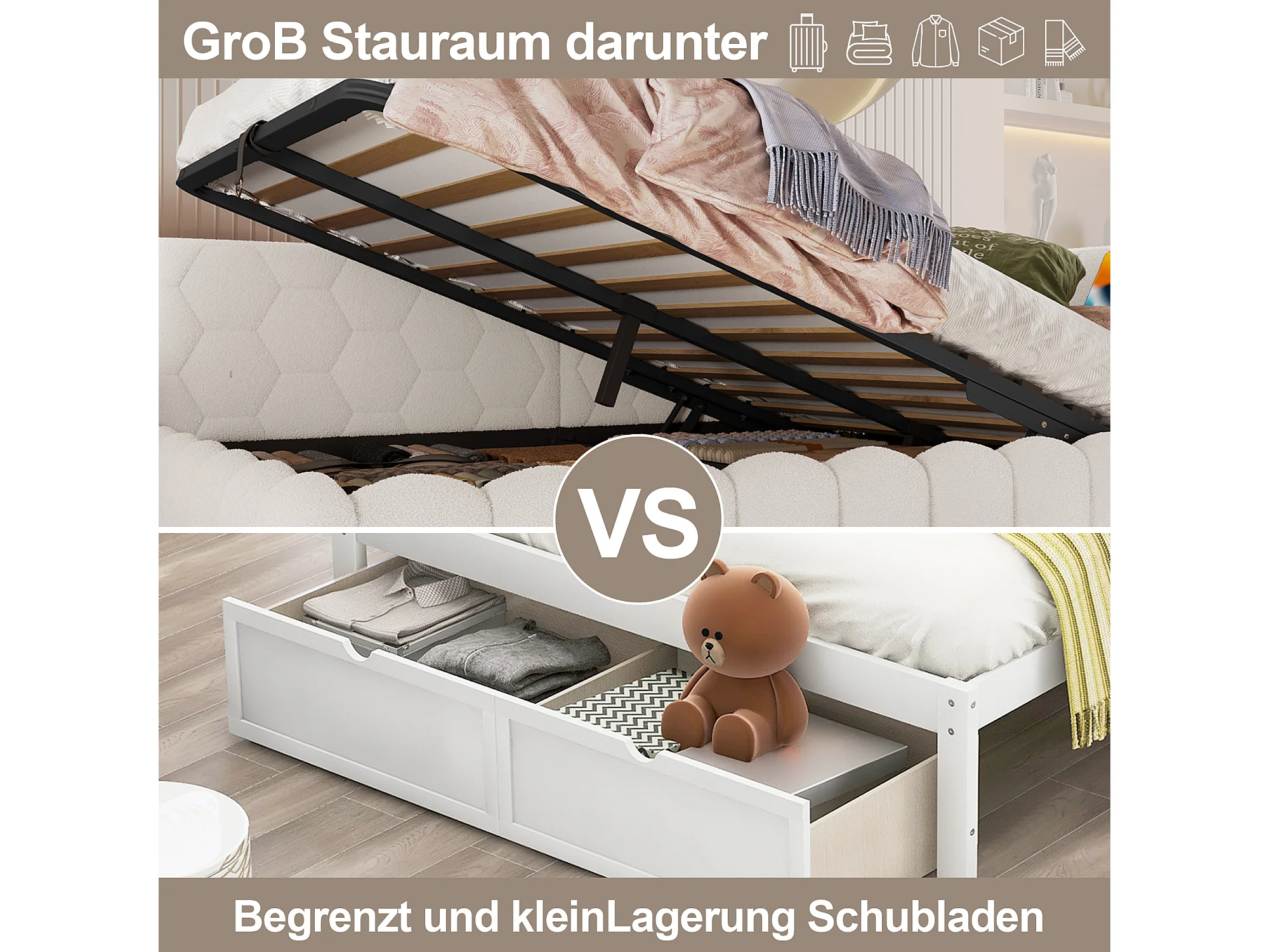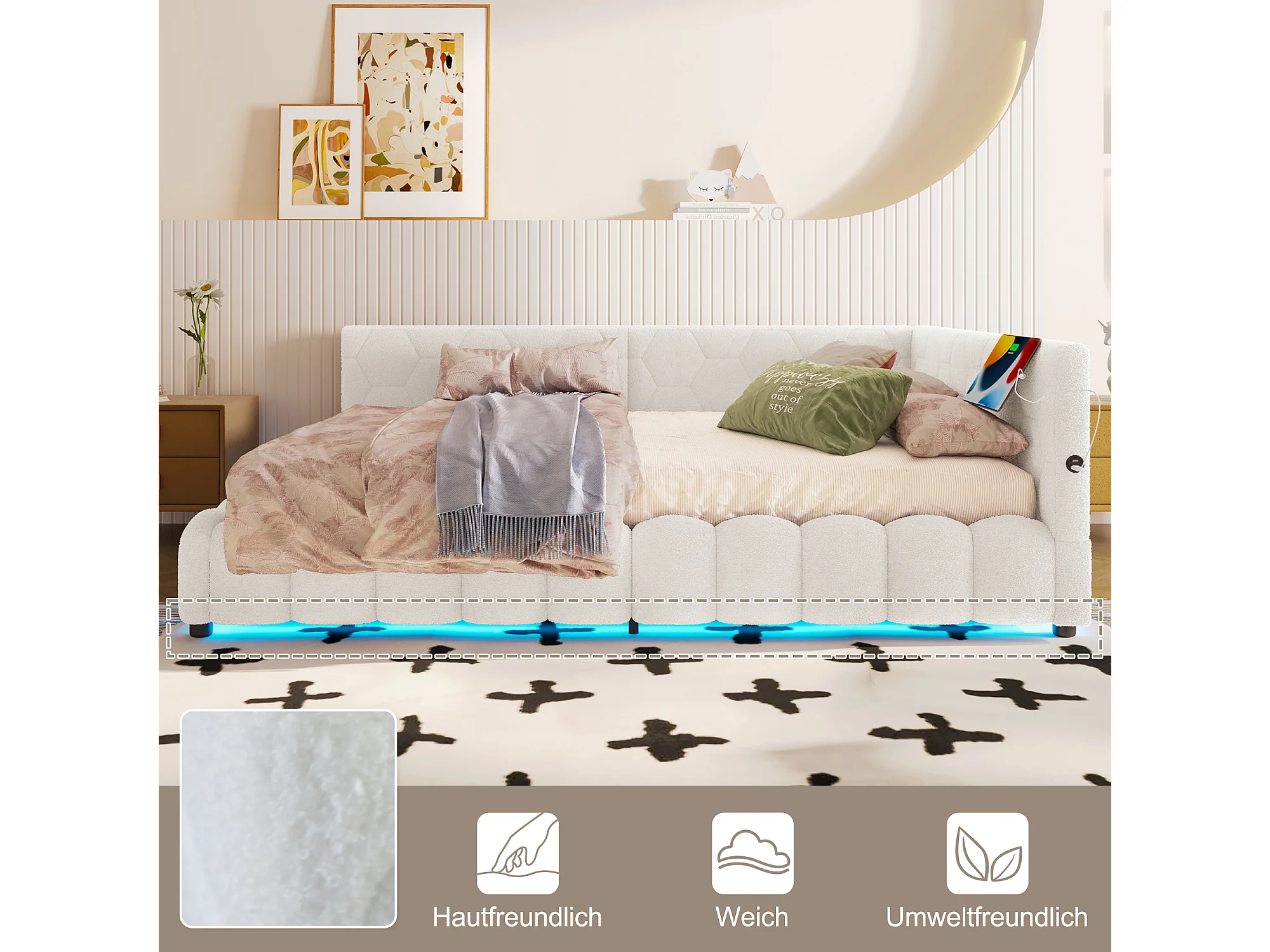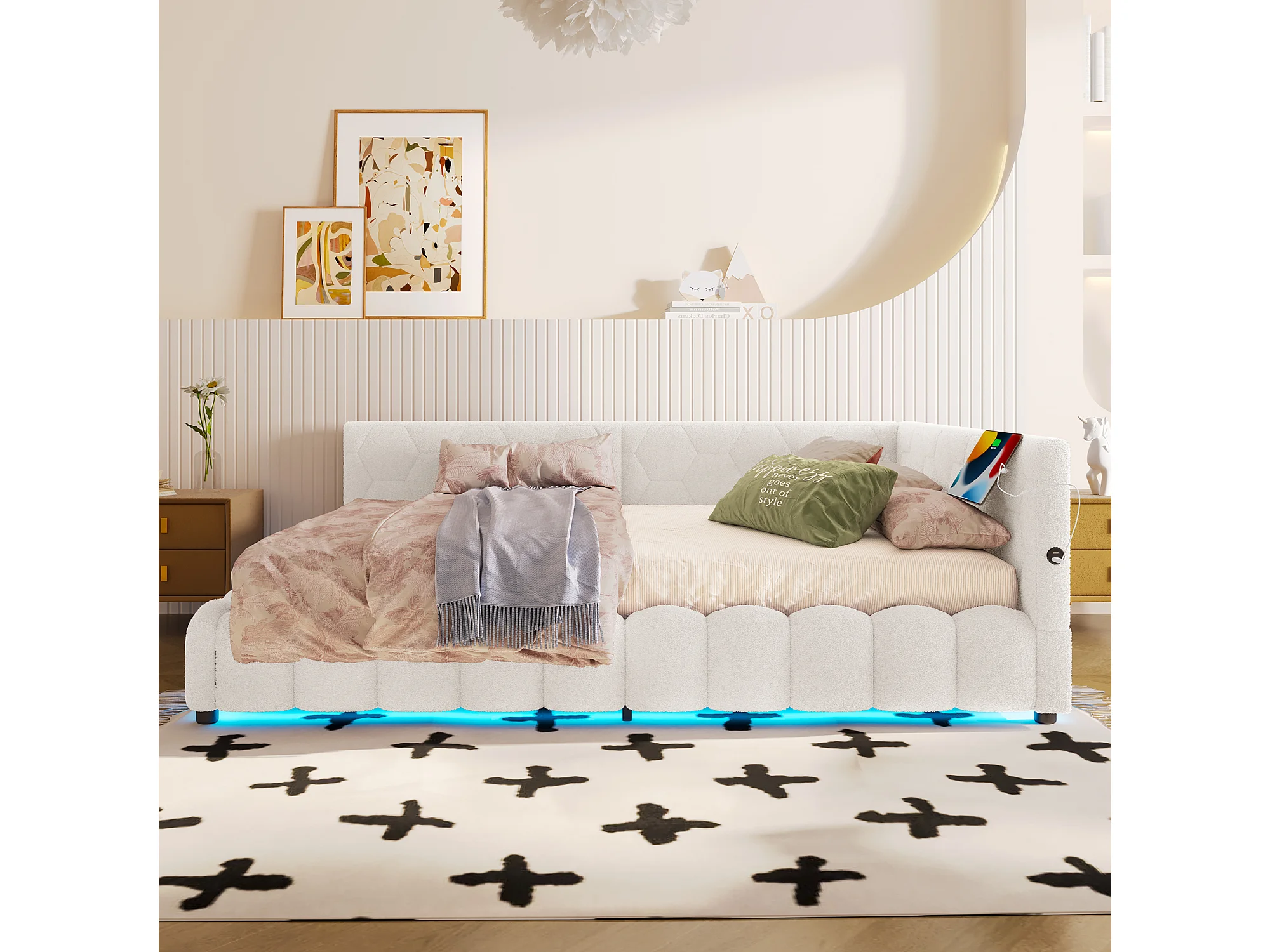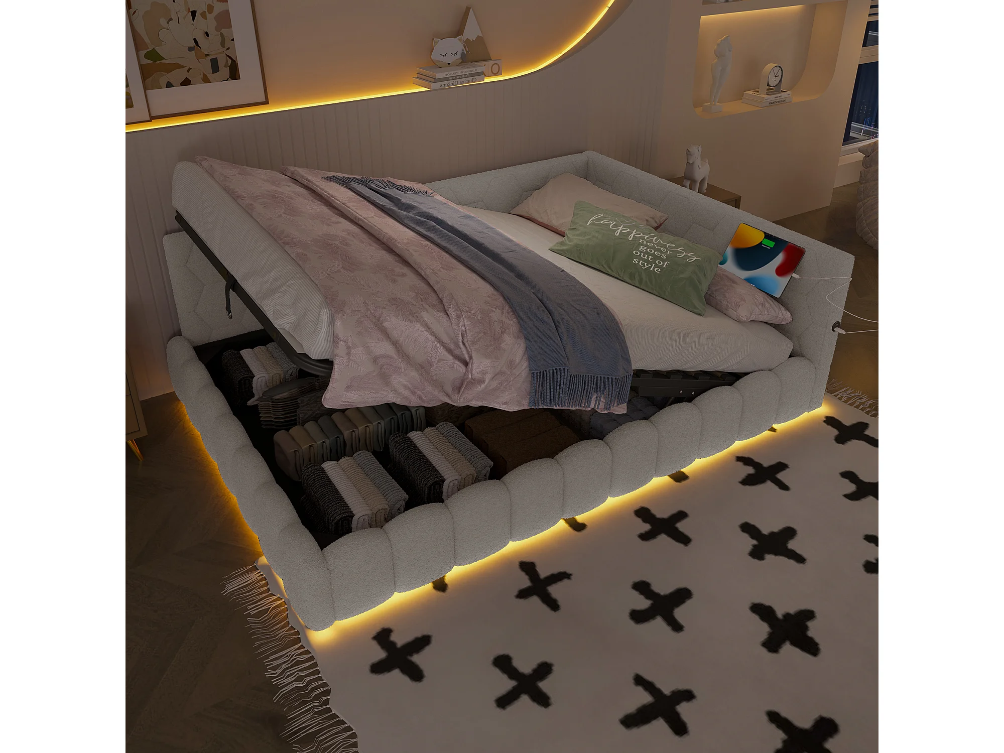 Divano letto per bambini - 140 x 200 cm - con LED + contenitore idraulico + USB - velluto - bianco