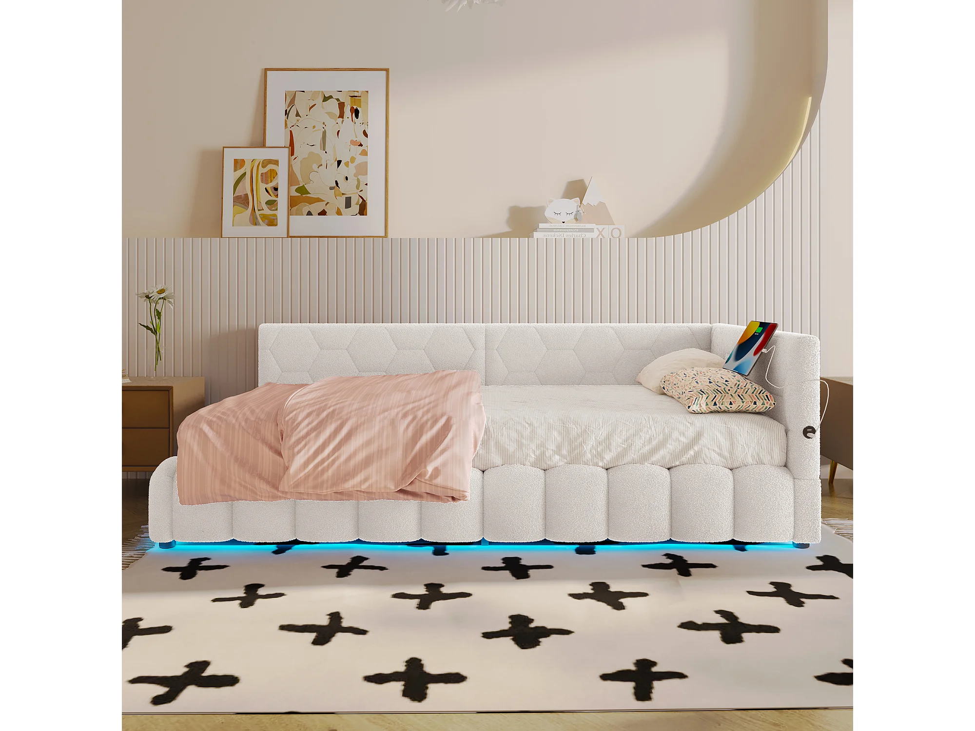 Divano letto per bambini - 90 x 200 cm - con LED + contenitore idraulico + USB - velluto - bianco