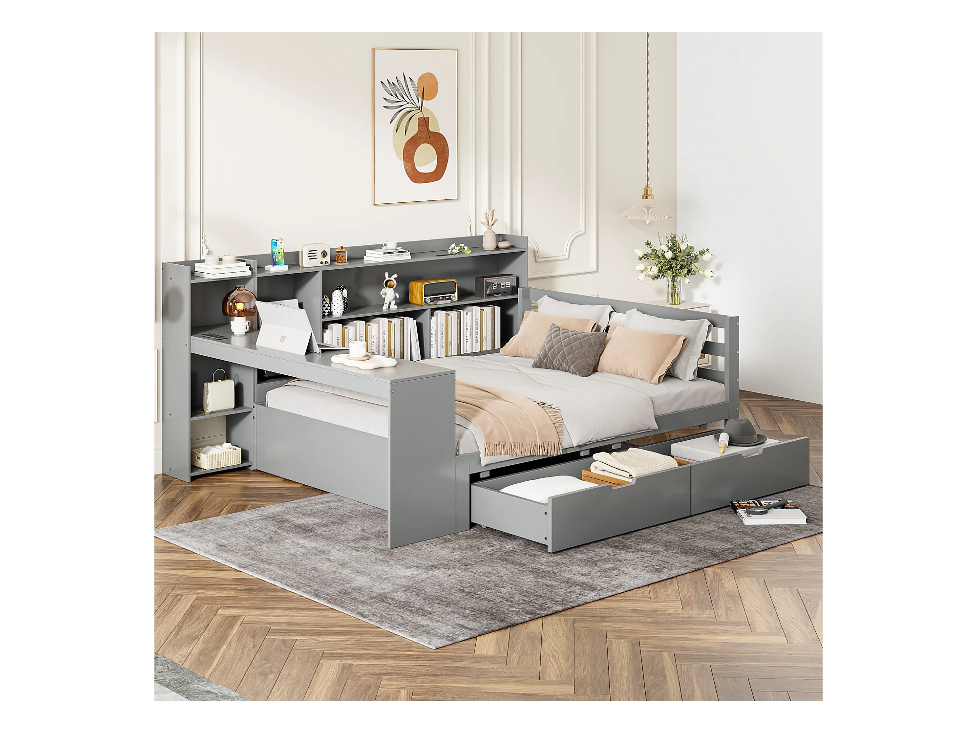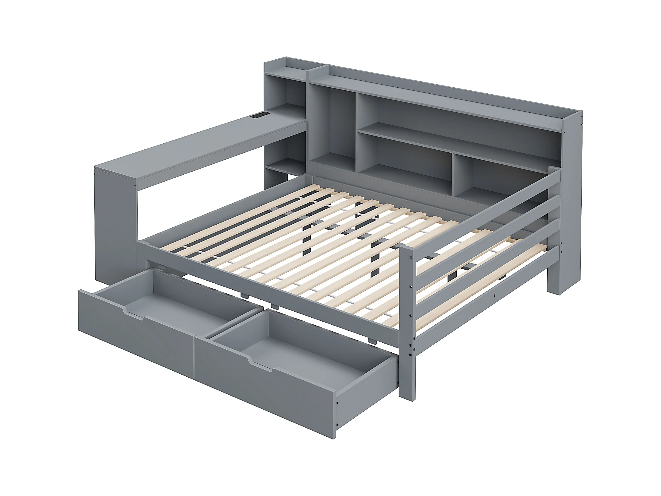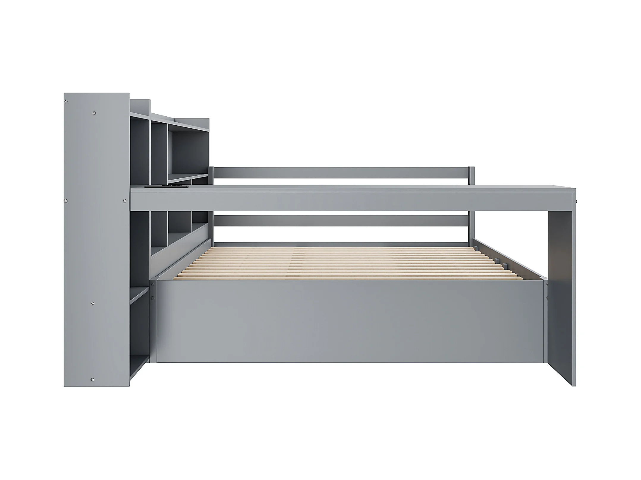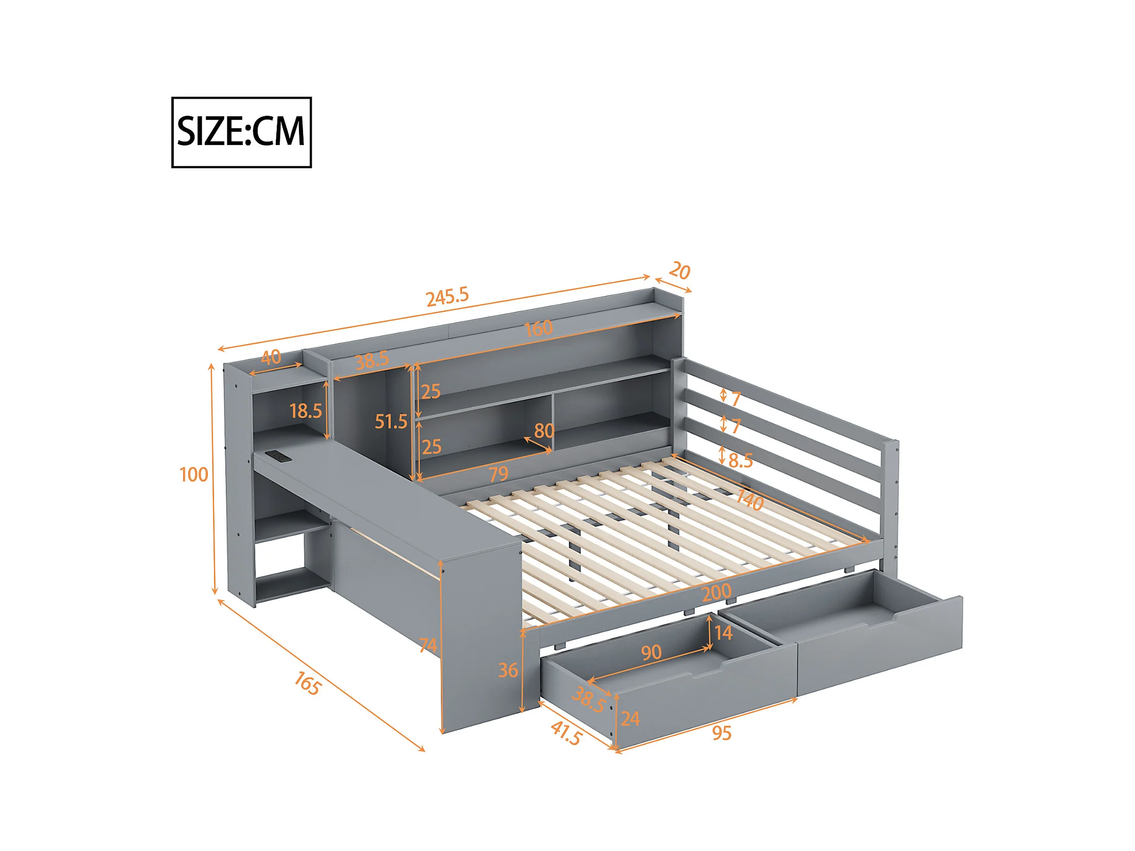 Divano letto in legno massello, 140x200 cm, con scrivania, ripiani, prese elettriche e letto a scomparsa sotto il divano, multifunzionale, Grigio (245,5x165x100 cm)