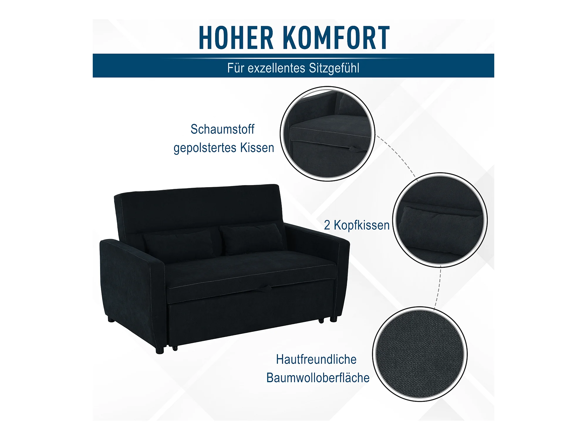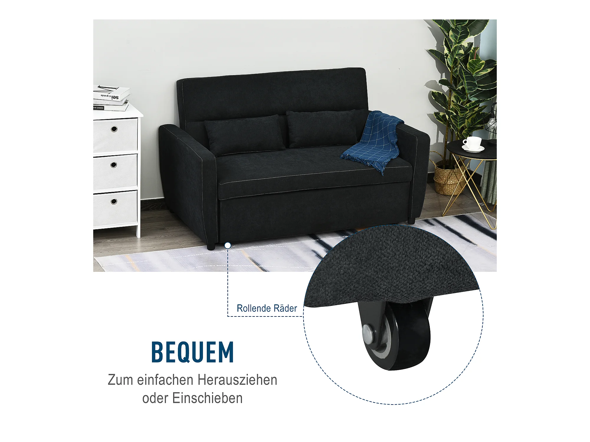 Divano letto trasformabile a 2 posti con schienale reclinabile in 3 posizioni, tessuto nero, 148x82x89 cm, compatto e pratico per il soggiorno