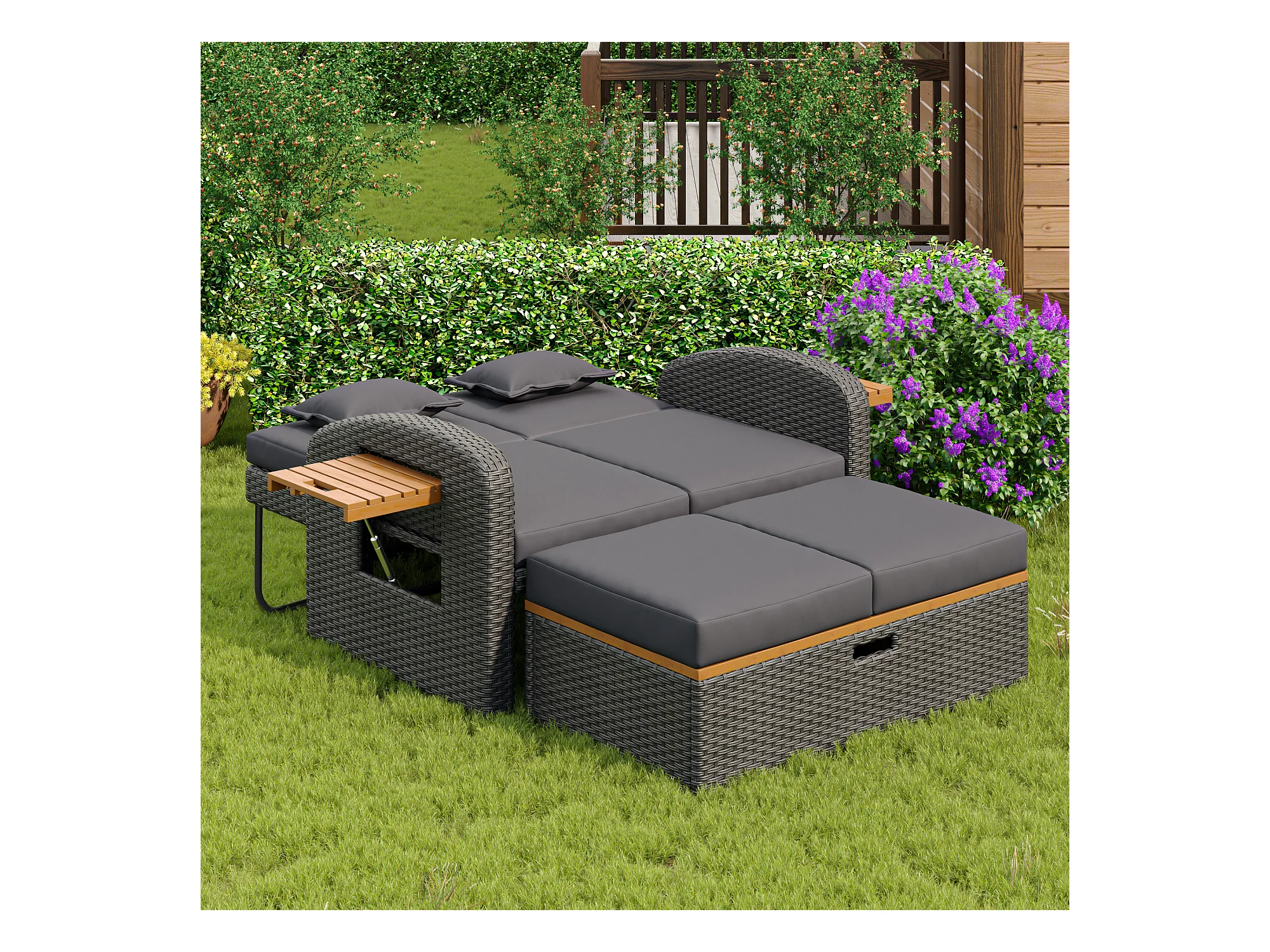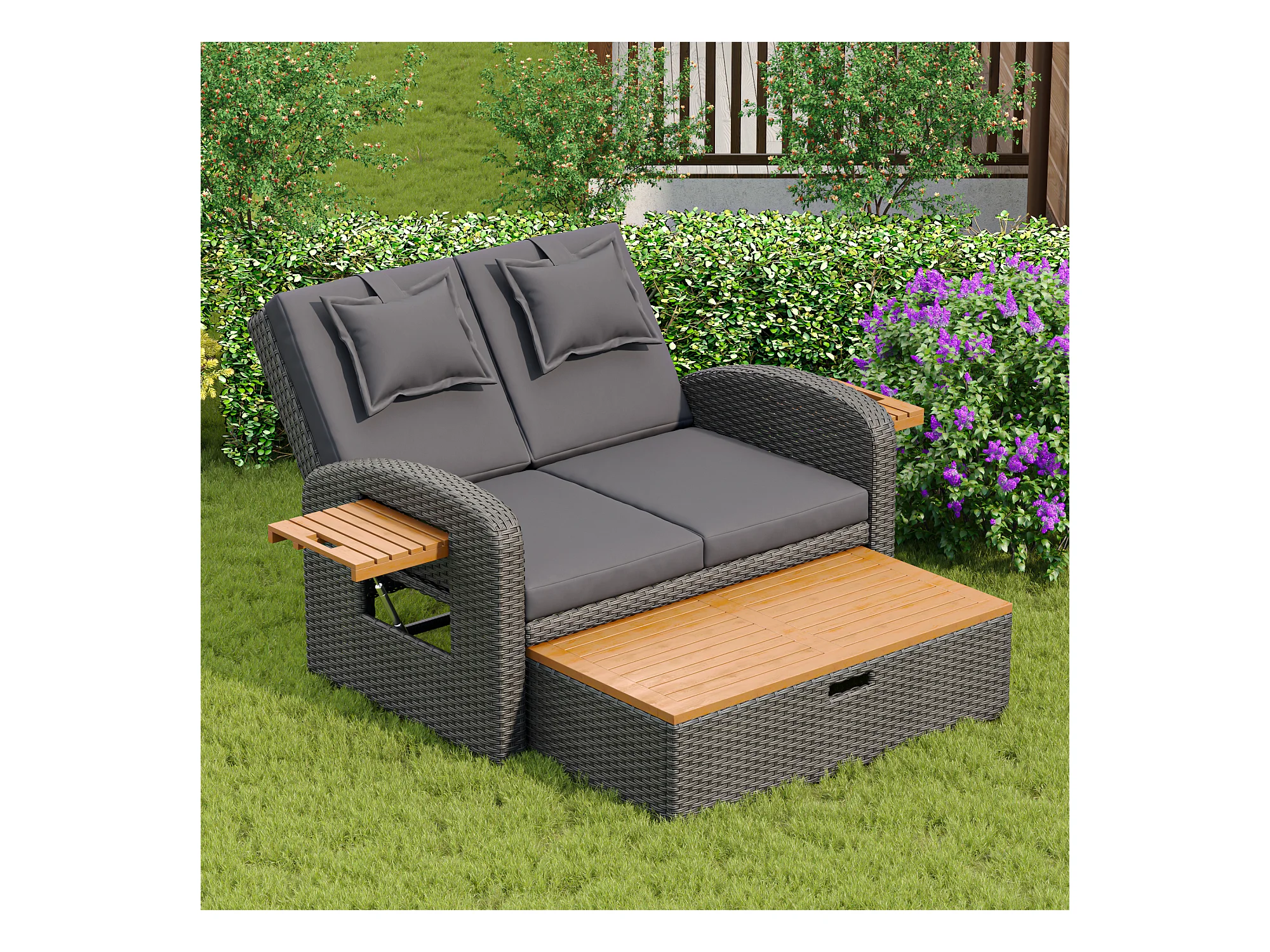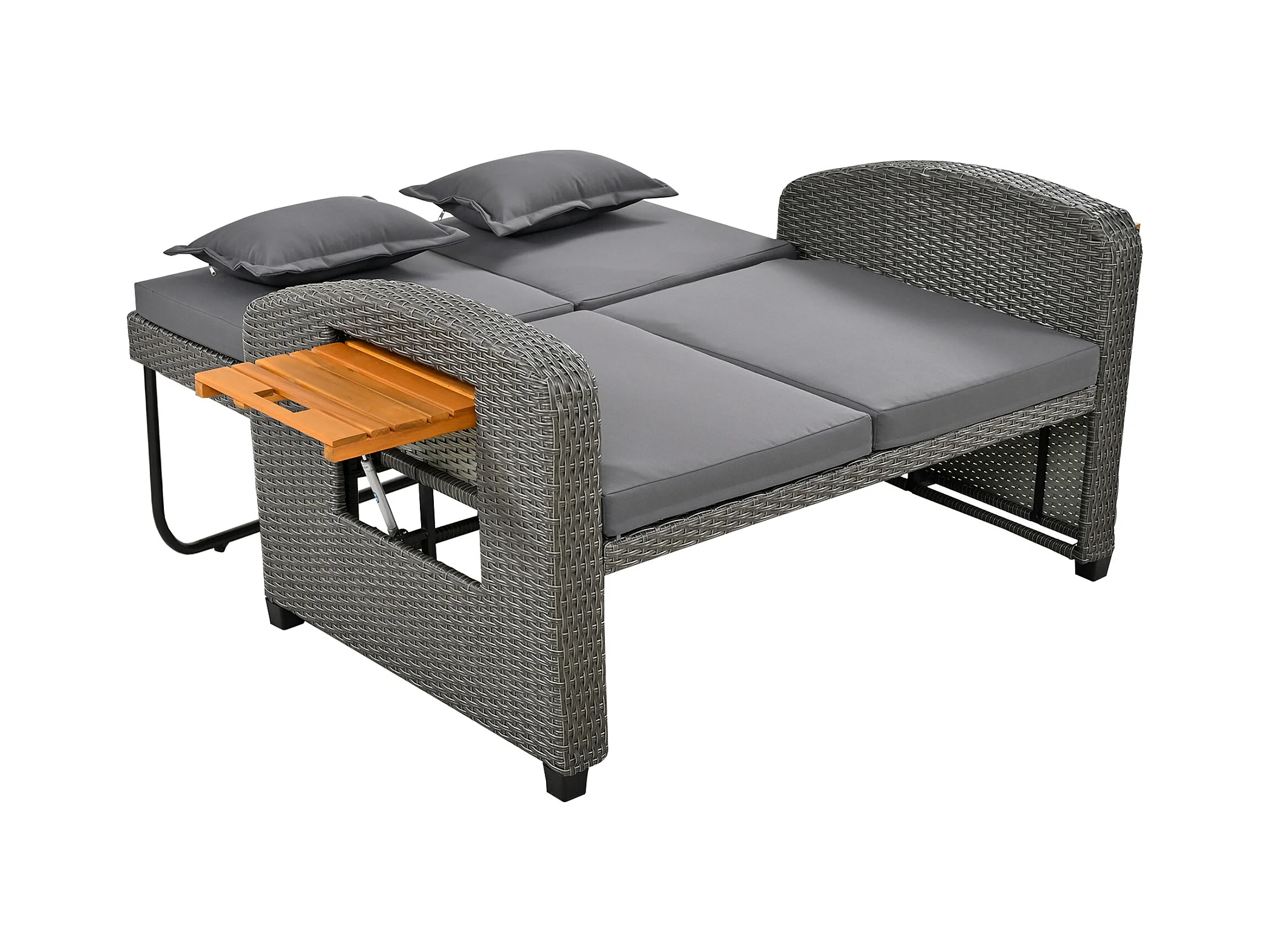 Divano letto trasformabile da esterno a 2 posti in resina intrecciata - tavolino - chaise longue - grigio