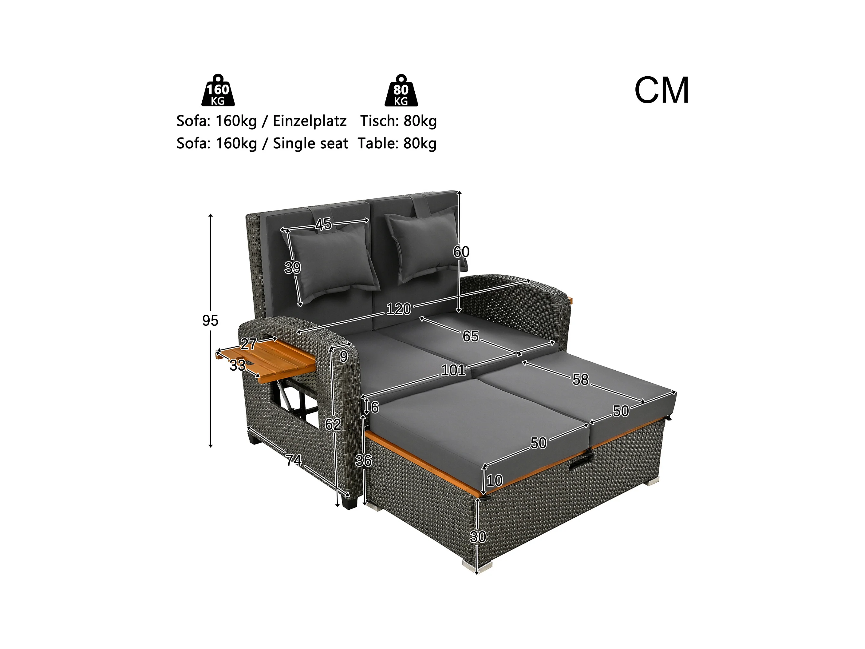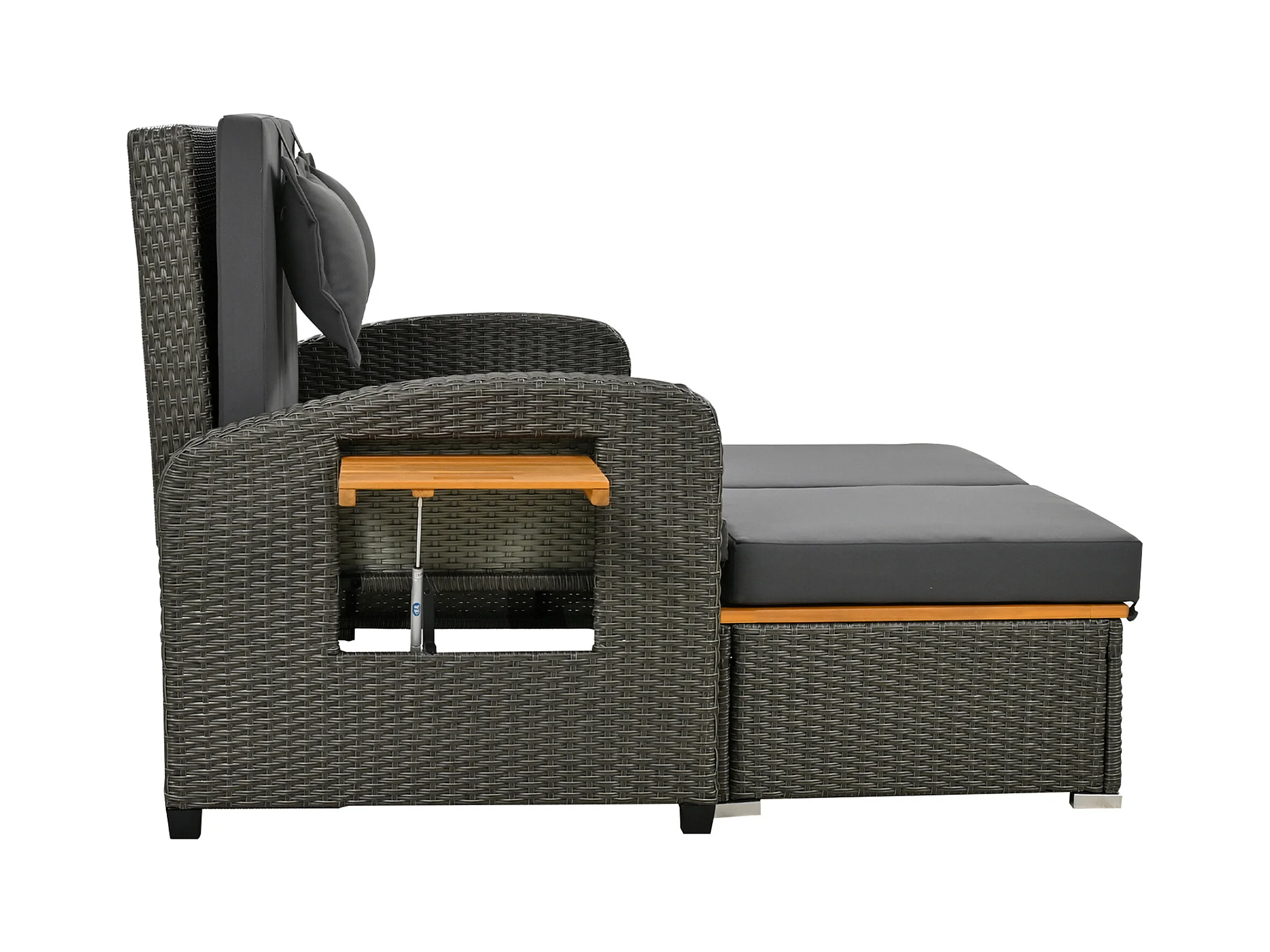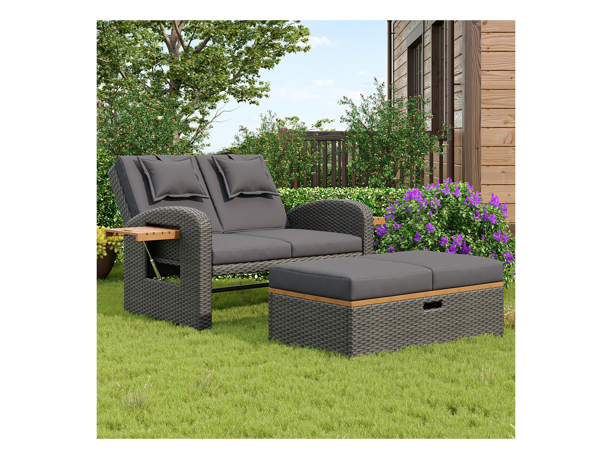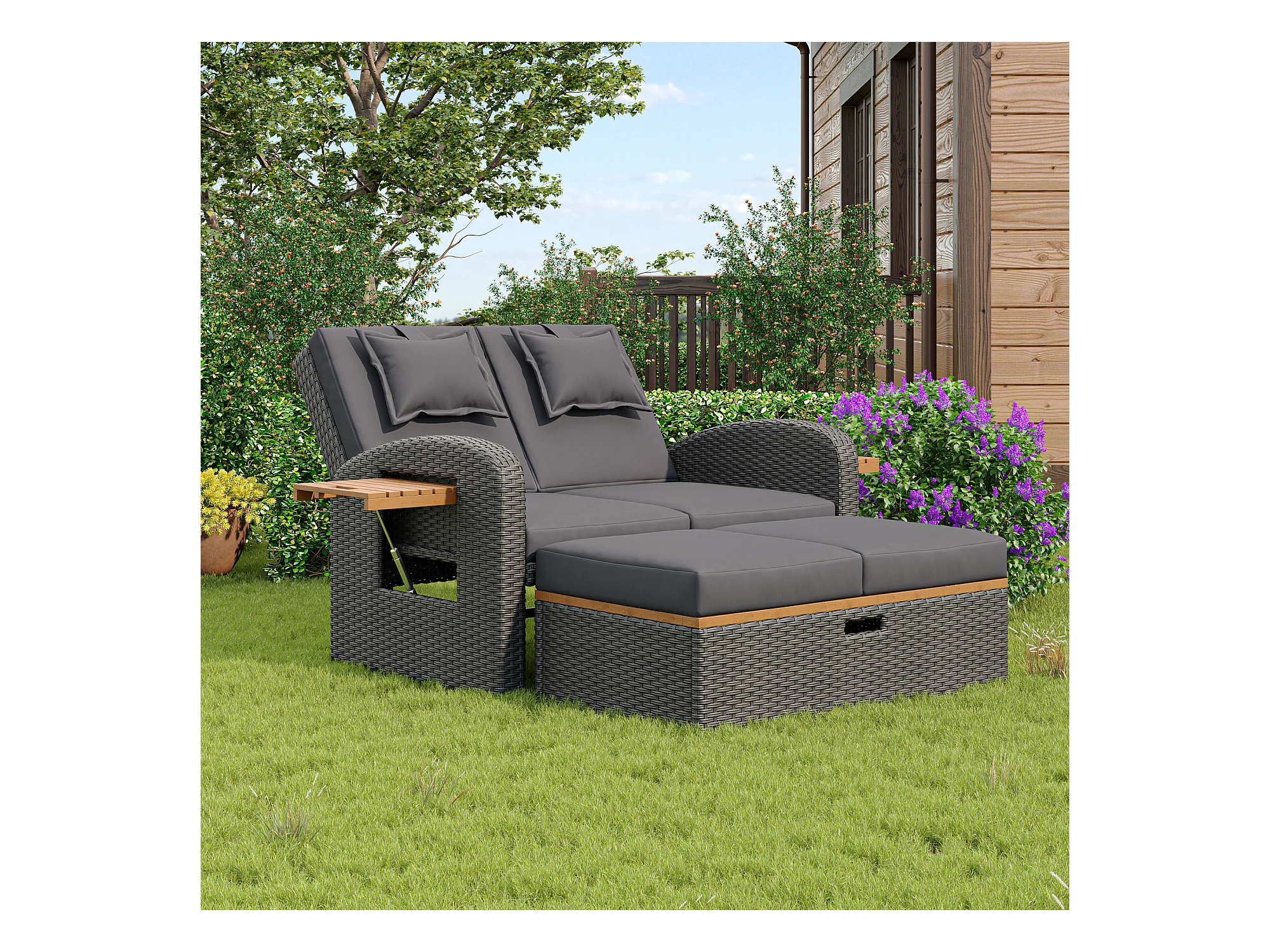 Divano letto trasformabile da esterno a 2 posti in resina intrecciata - tavolino - chaise longue - grigio