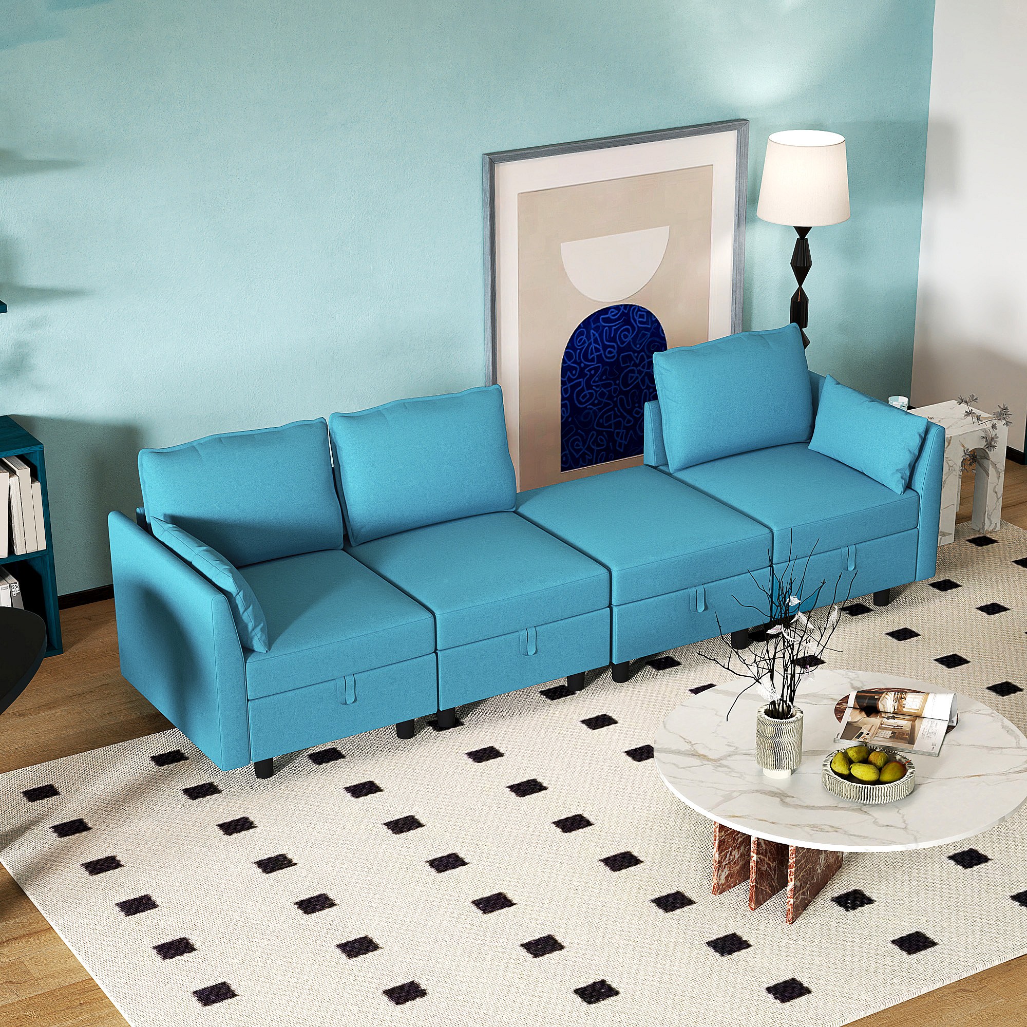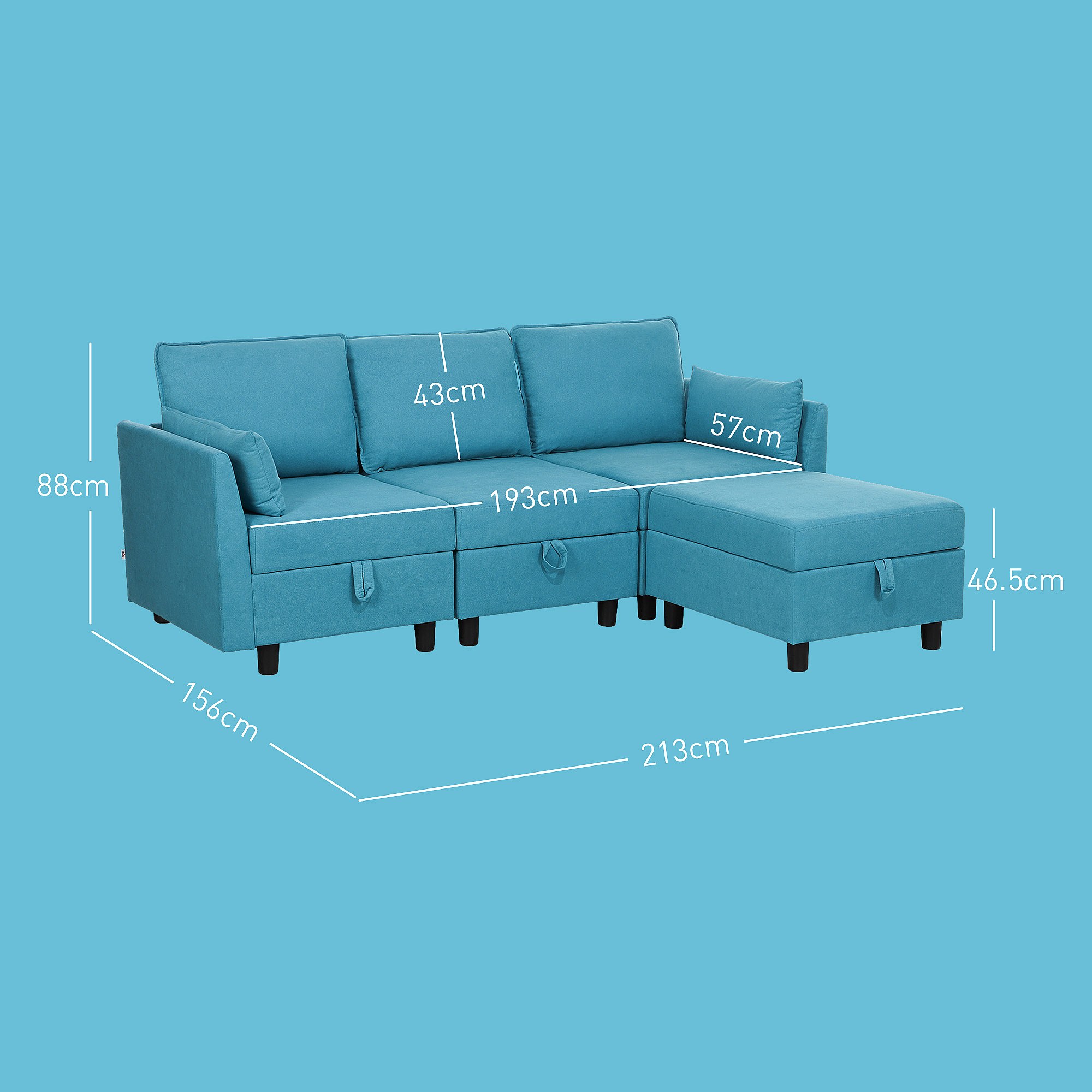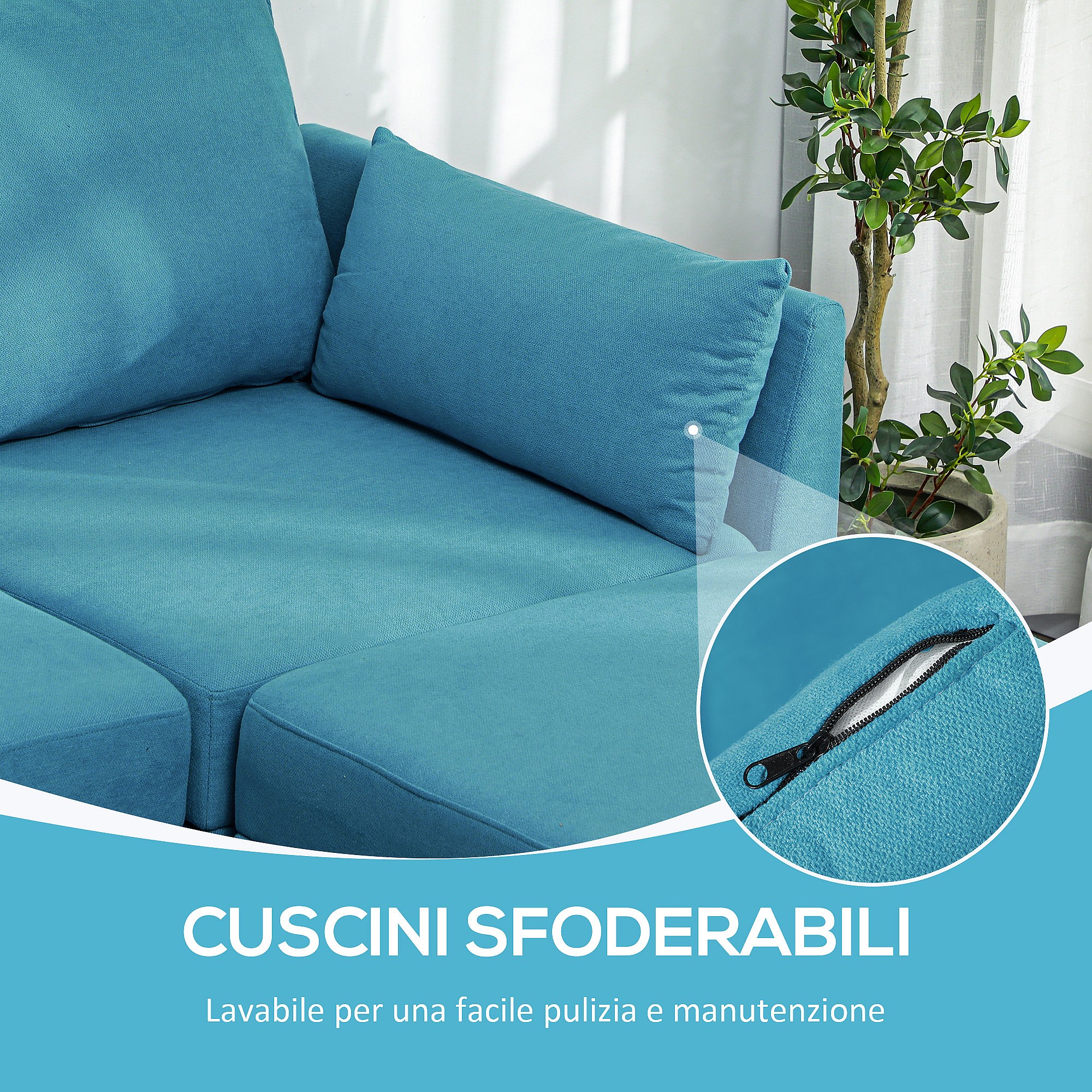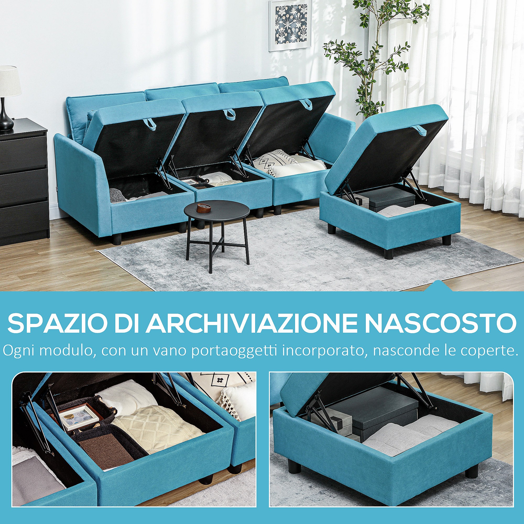 Divano modulare 3 posti con pouf poggiapiedi contenitori blu