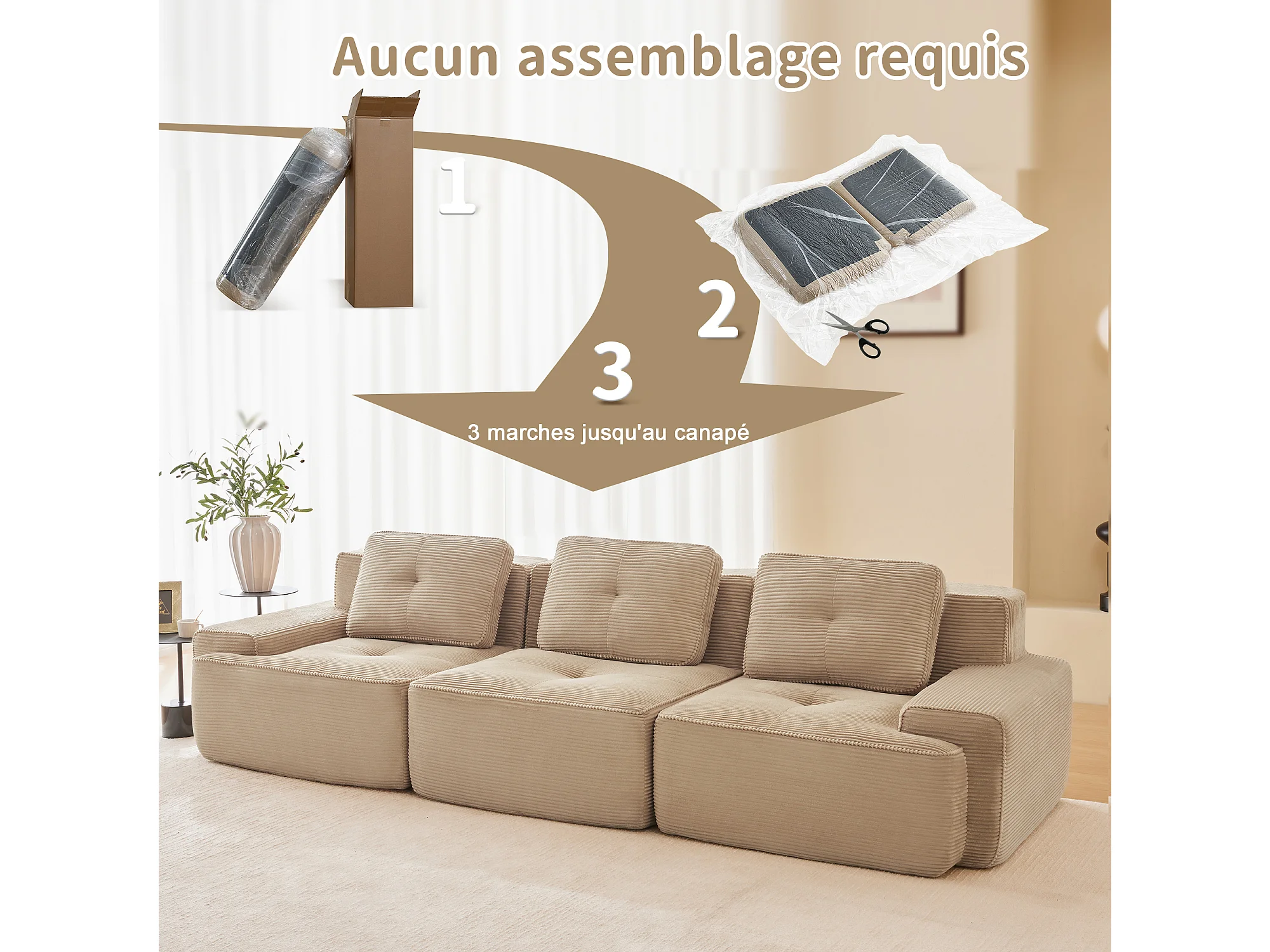 Divano Modulare 3 posti in Velluto costola, con 3 cuscini, seduta extra profonda 74cm, 293x104x69cm, Beige