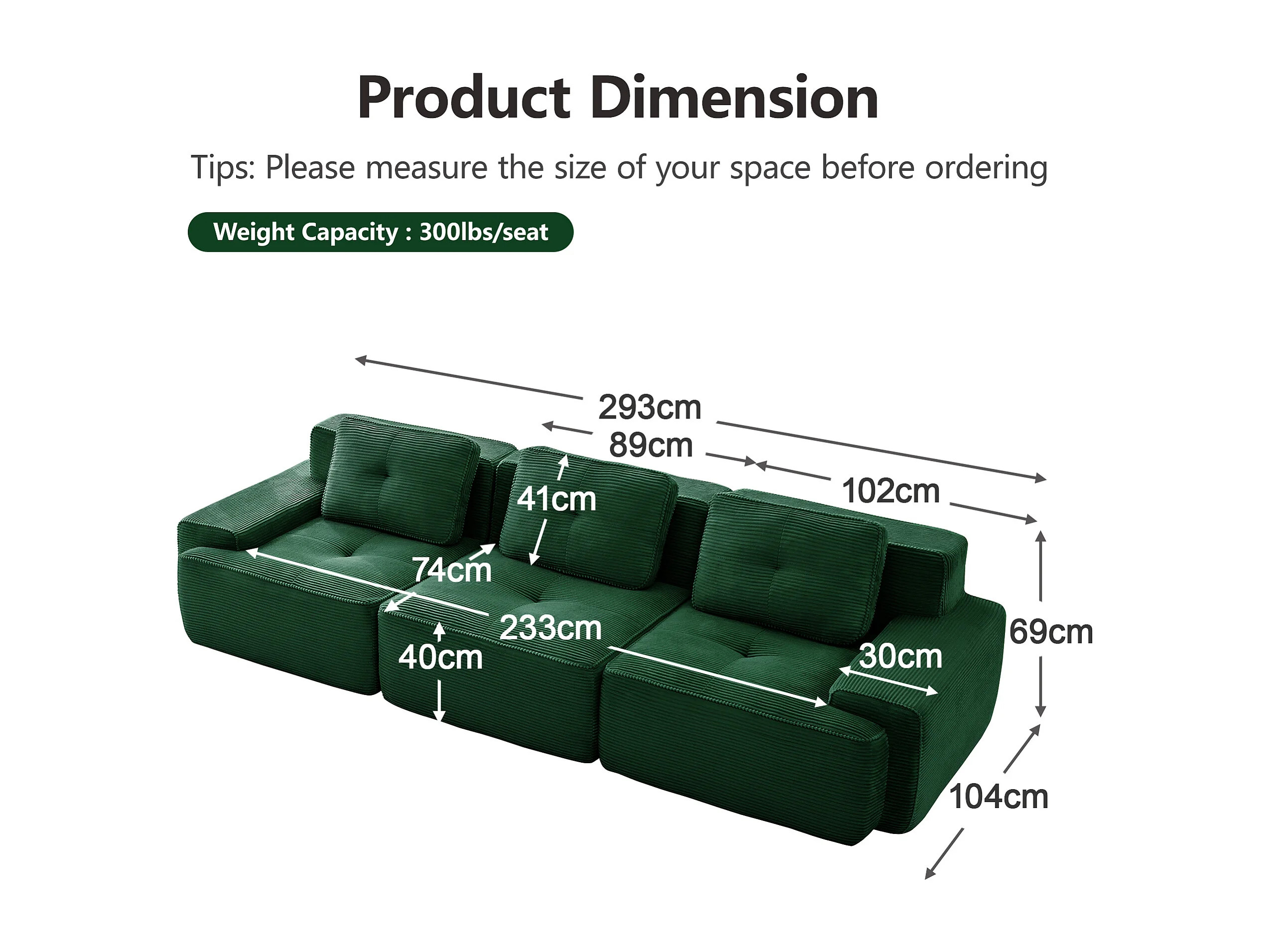 Divano Modulare 3 posti in Velluto costola, con 3 cuscini, seduta extra profonda 74cm, 293x104x69cm, Verde