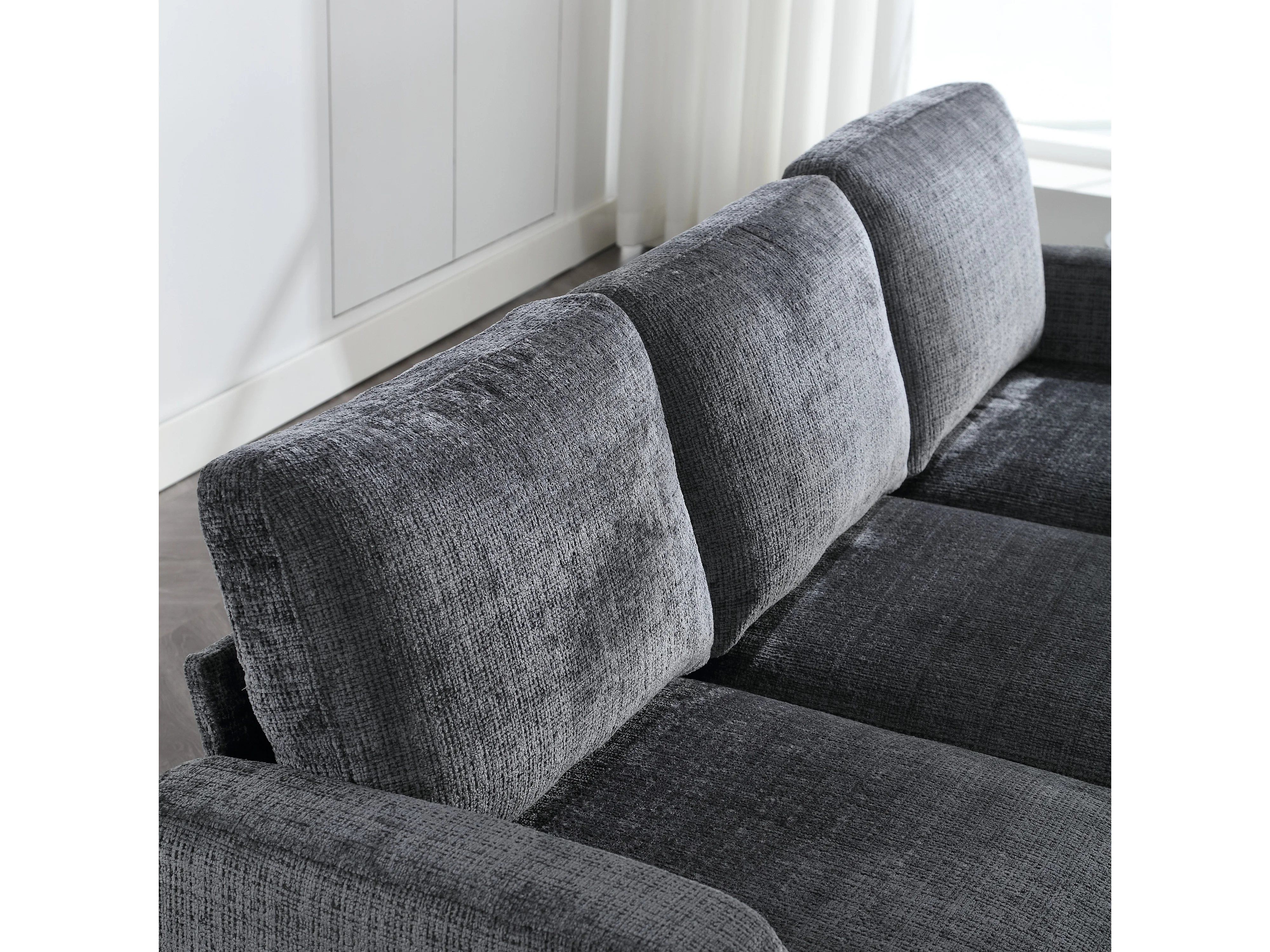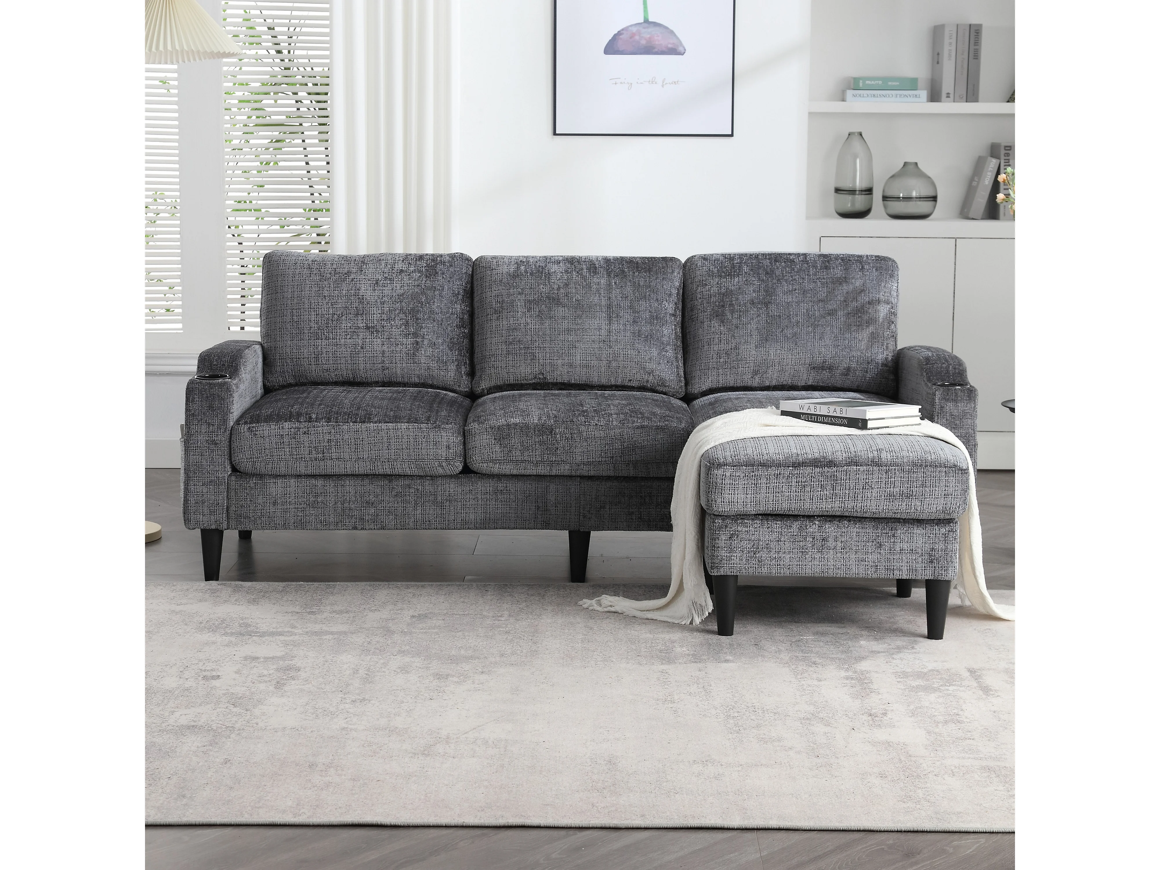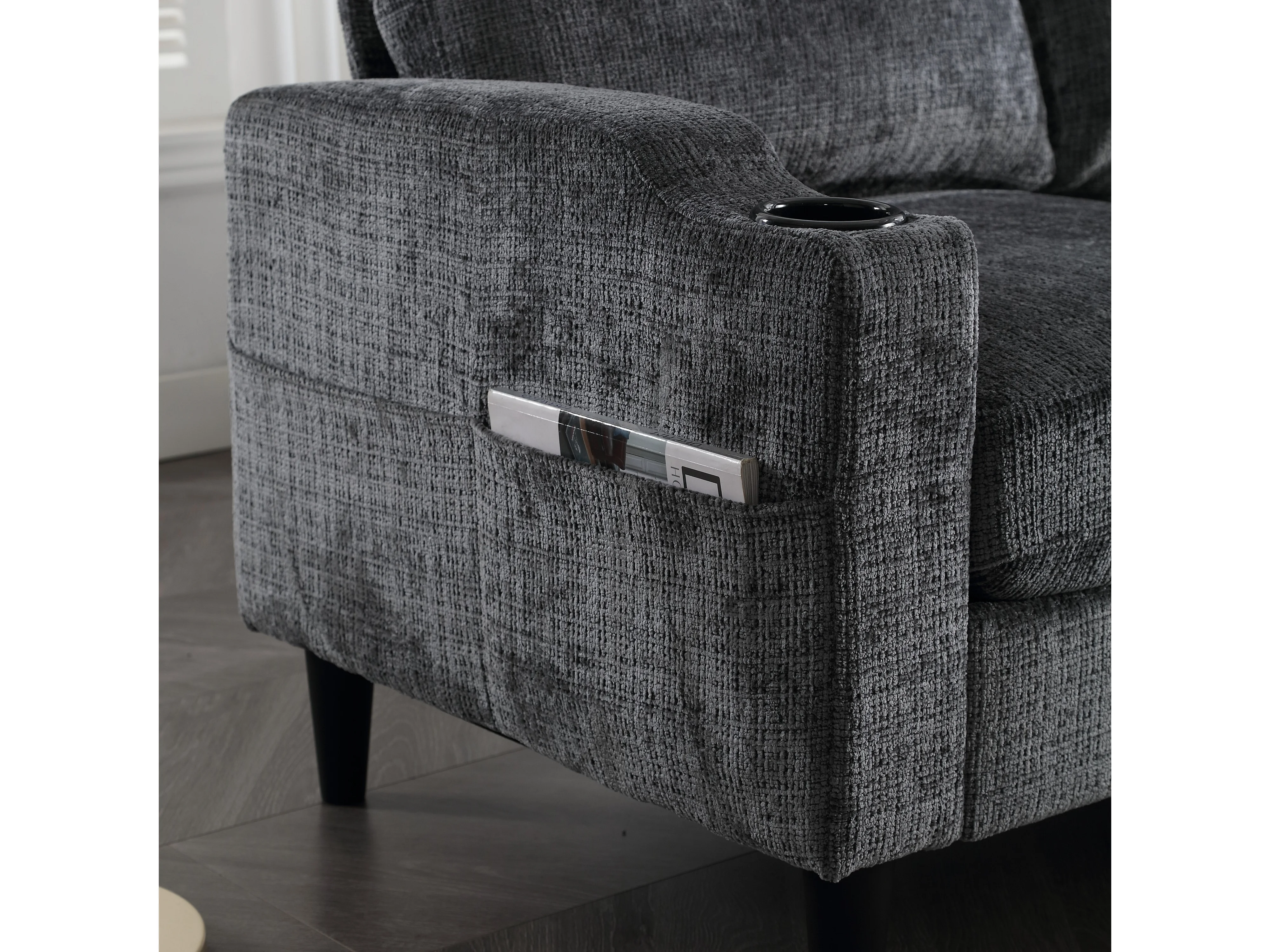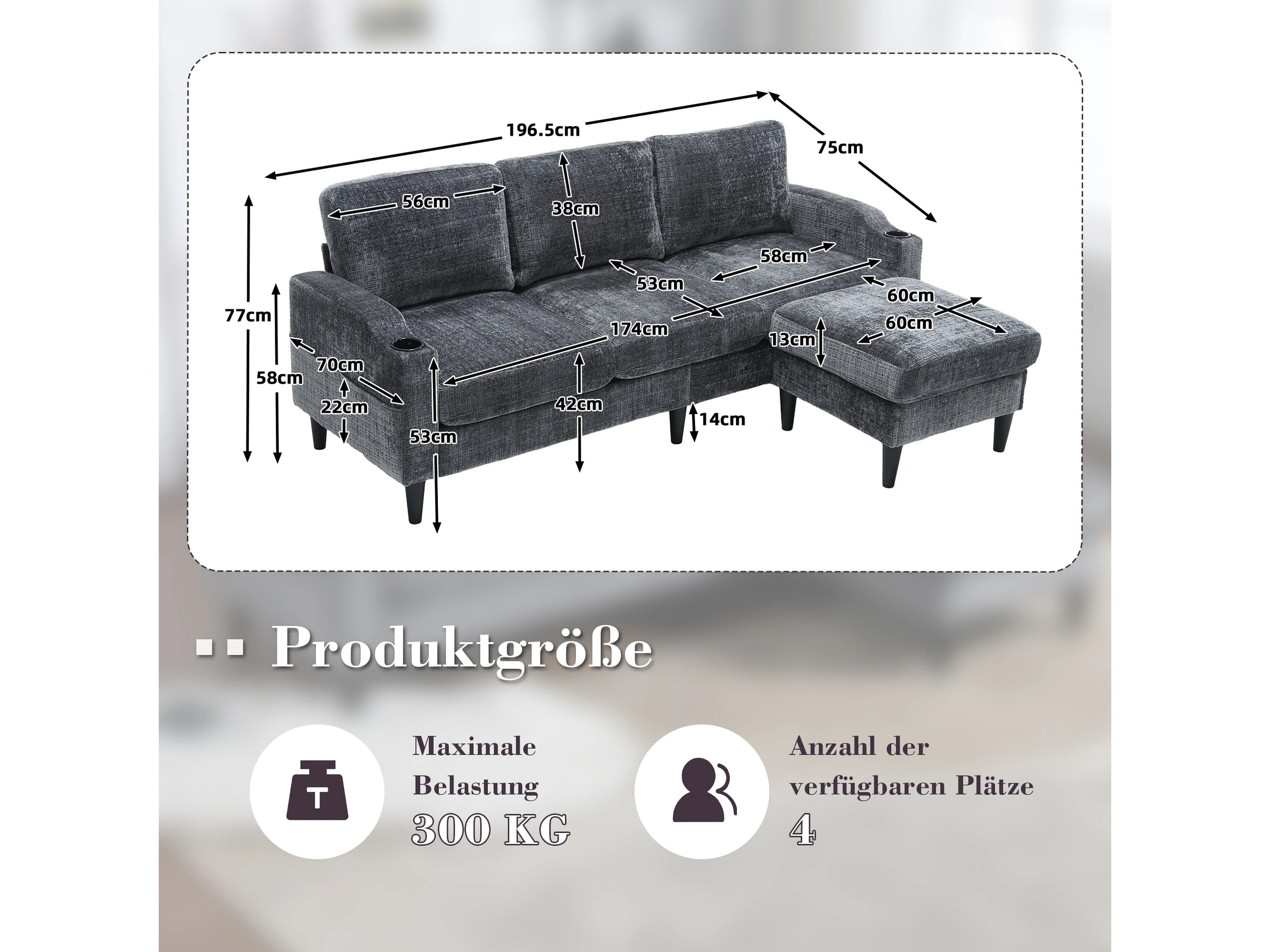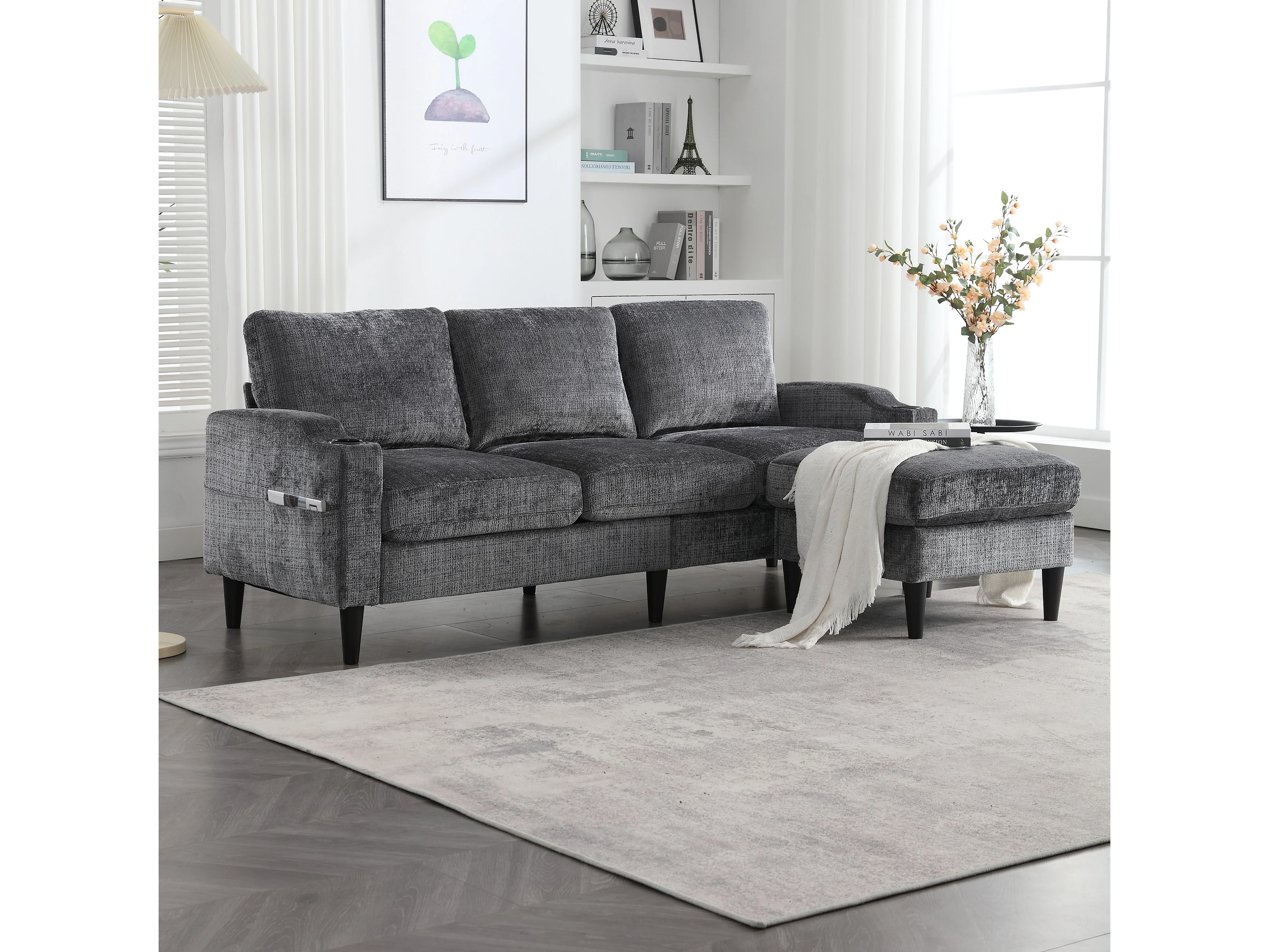 Divano modulare a 4 posti in ciniglia grigia con pouf contenitore, portabicchieri e tasche laterali - per soggiorno