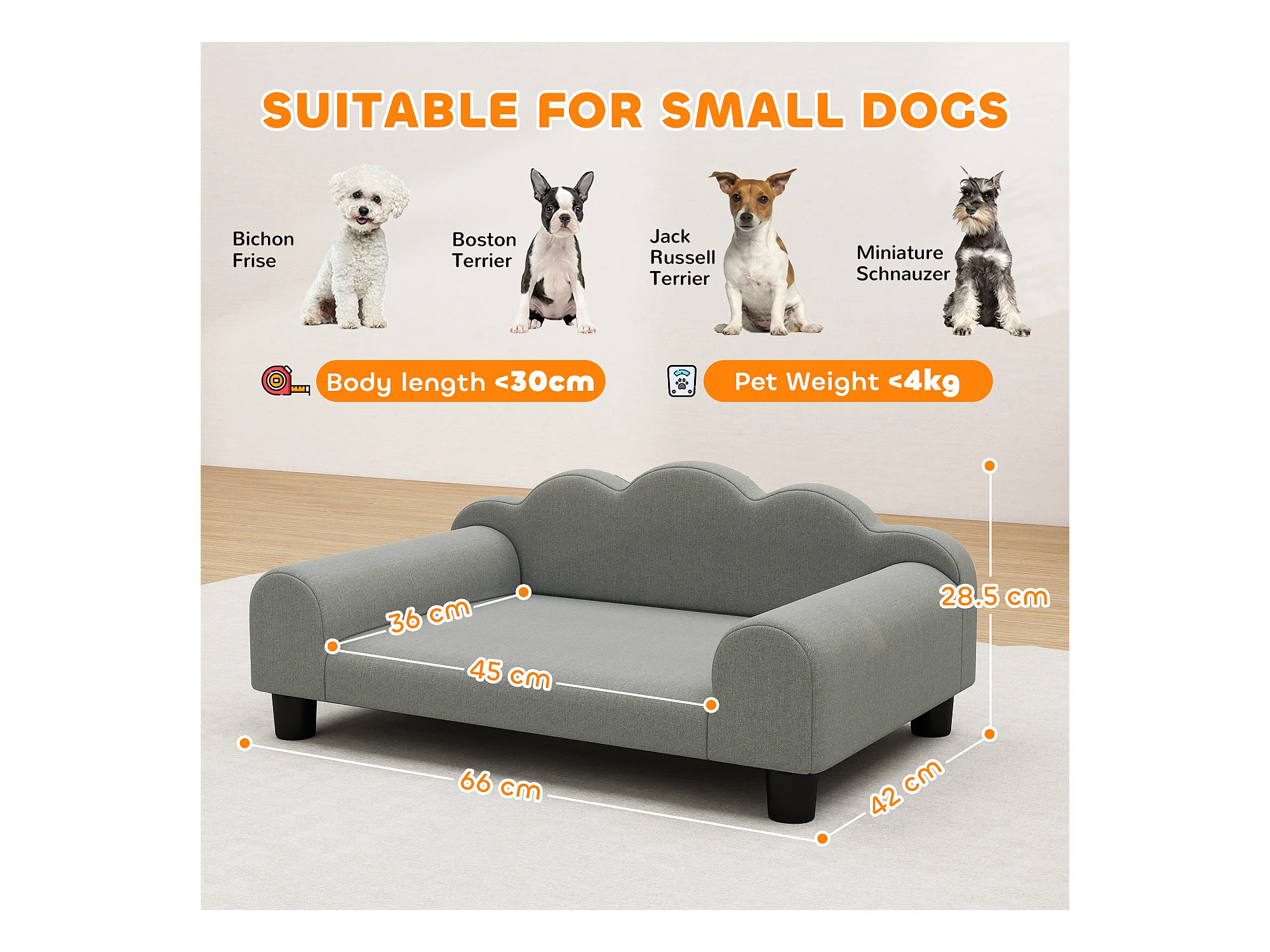 Divano per cani morbido con braccioli di supporto in tessuto grigio