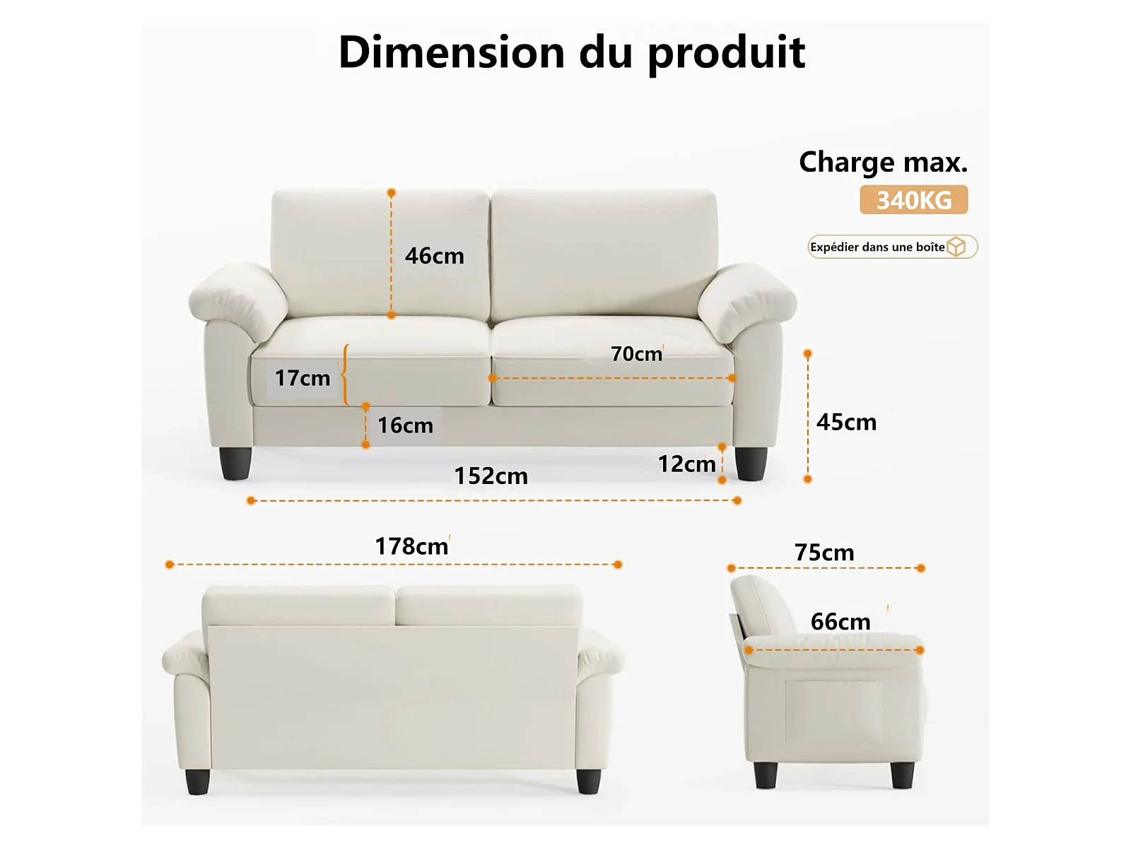 Divano soggiorno 2 posti in tessuto Chenille, divano moderno a metà del secolo, con sacchetto di stoccaggio, 178x75x87 cm, Beige