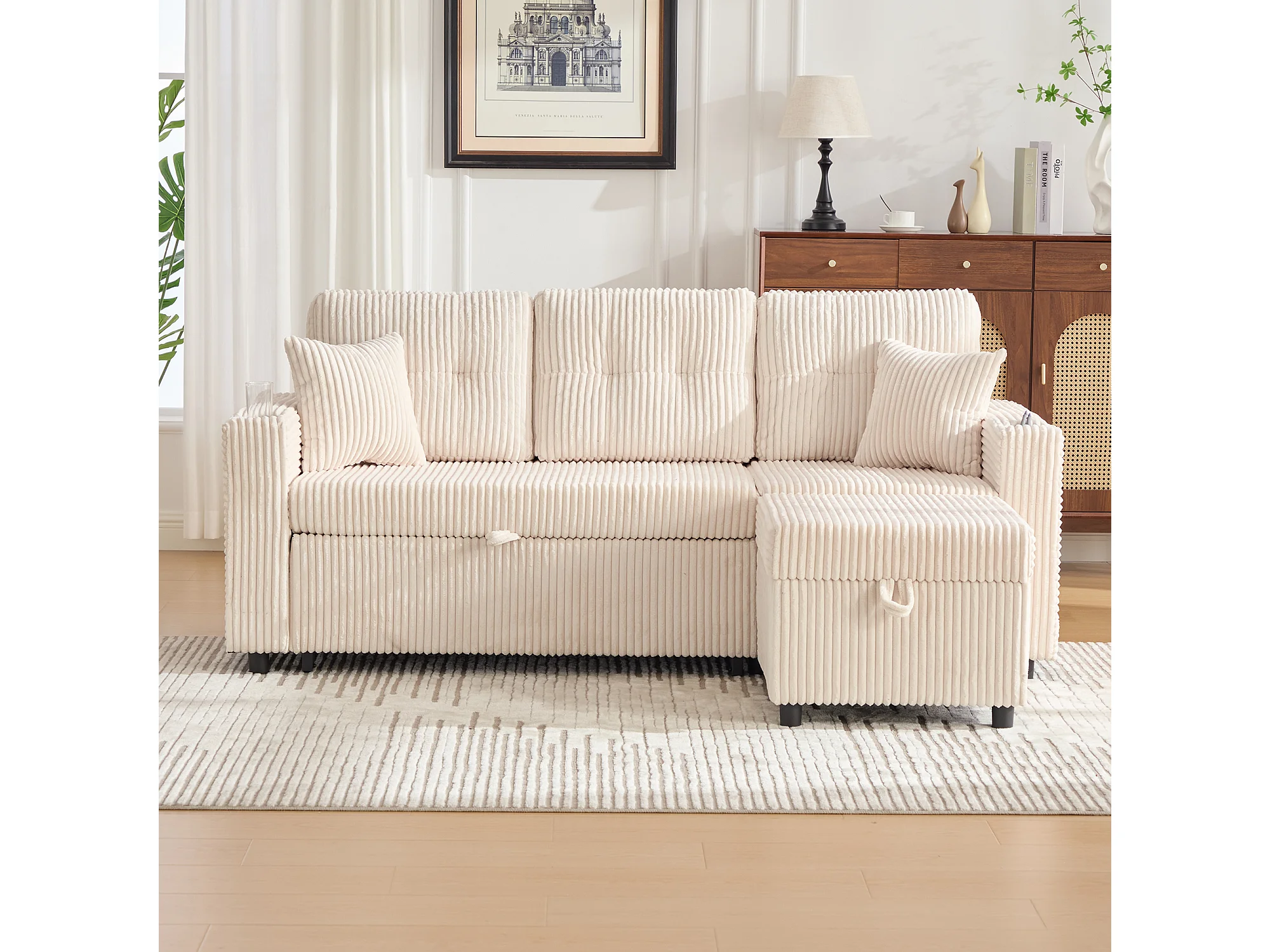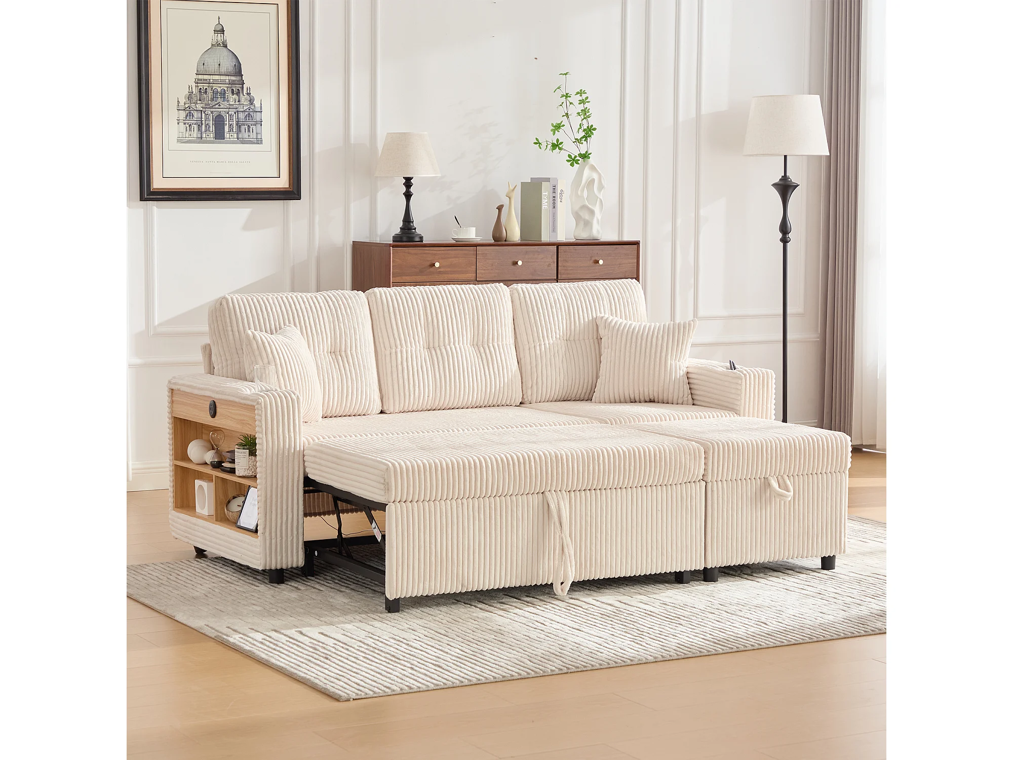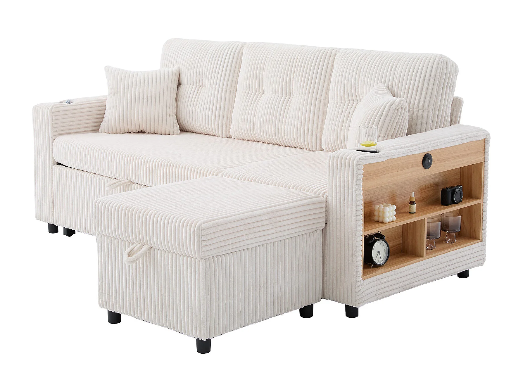Divano trasformabile, divano a 2 posti con luci a LED, porte USB, pouf contenitore e cassetti - velluto a coste beige