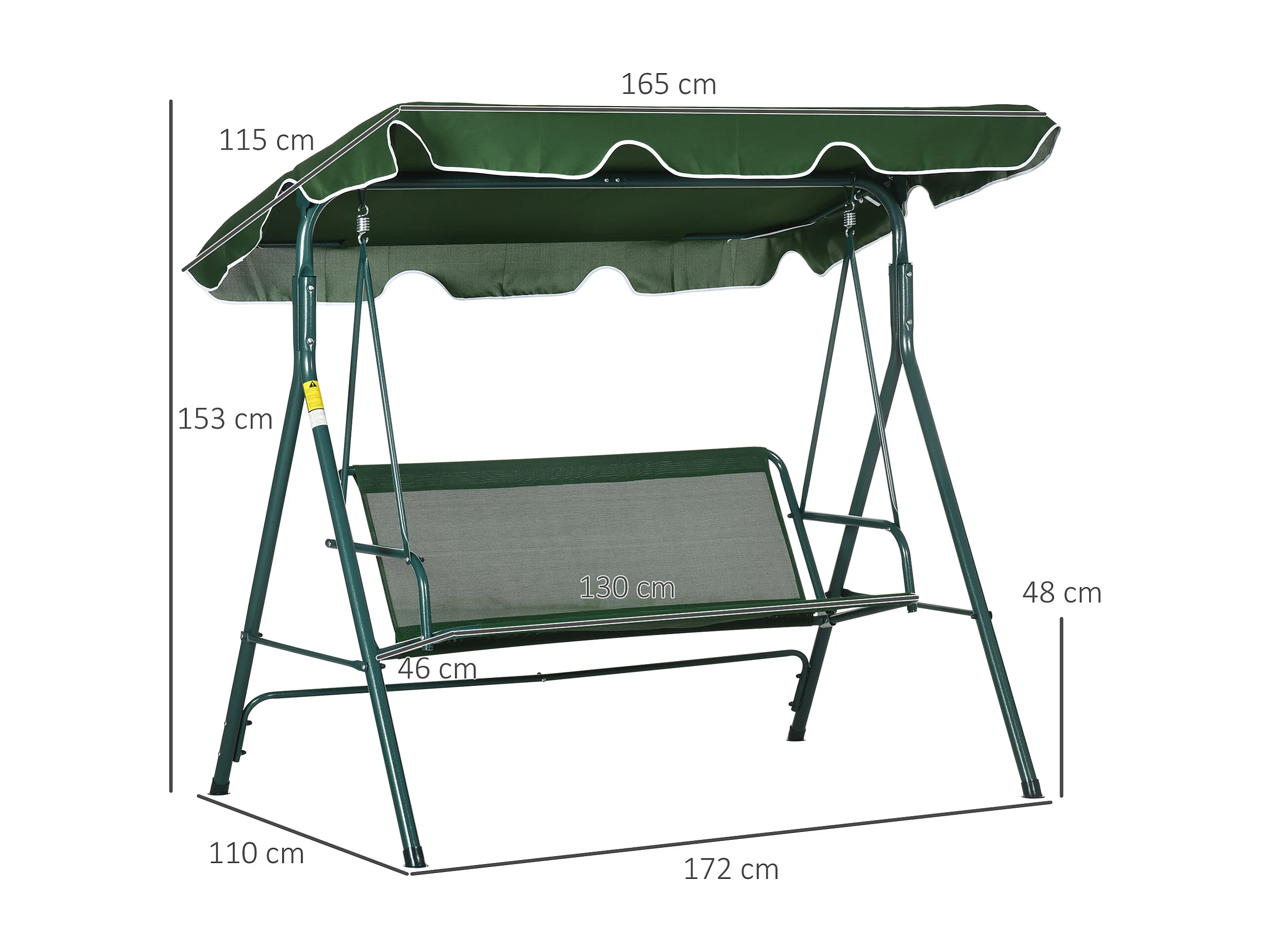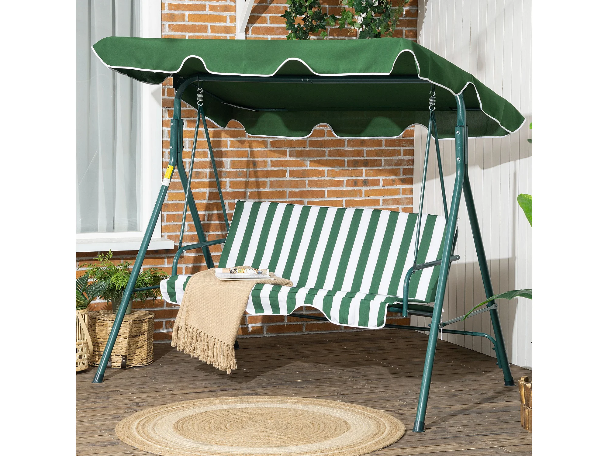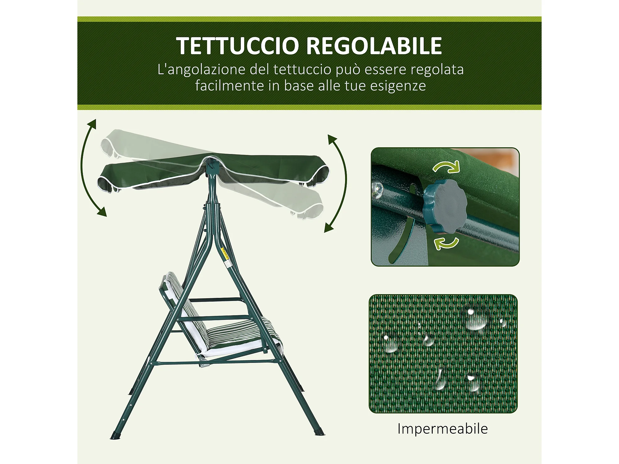 Dondolo 3 posti da terrazzo e giardino con tettuccio verde