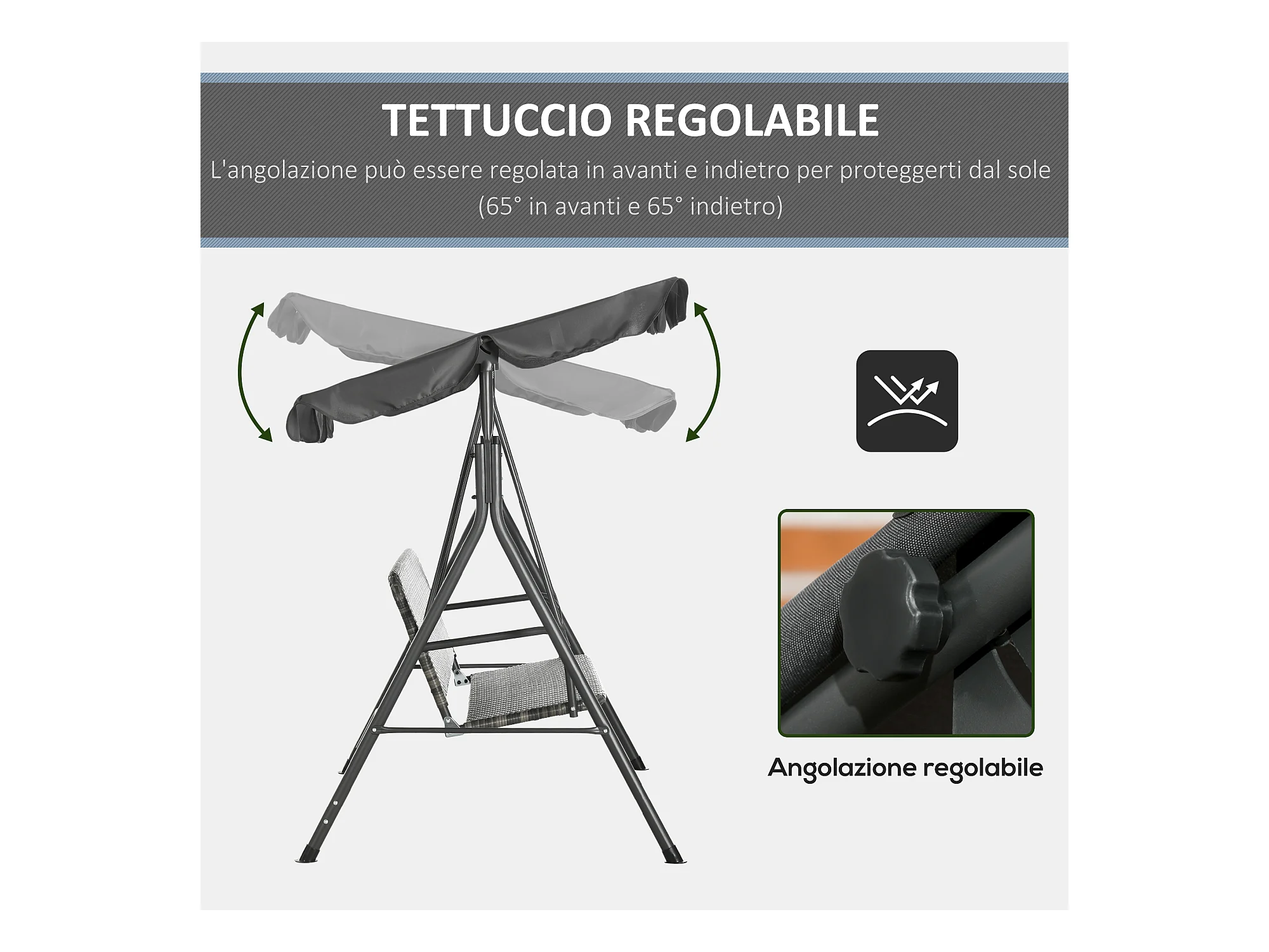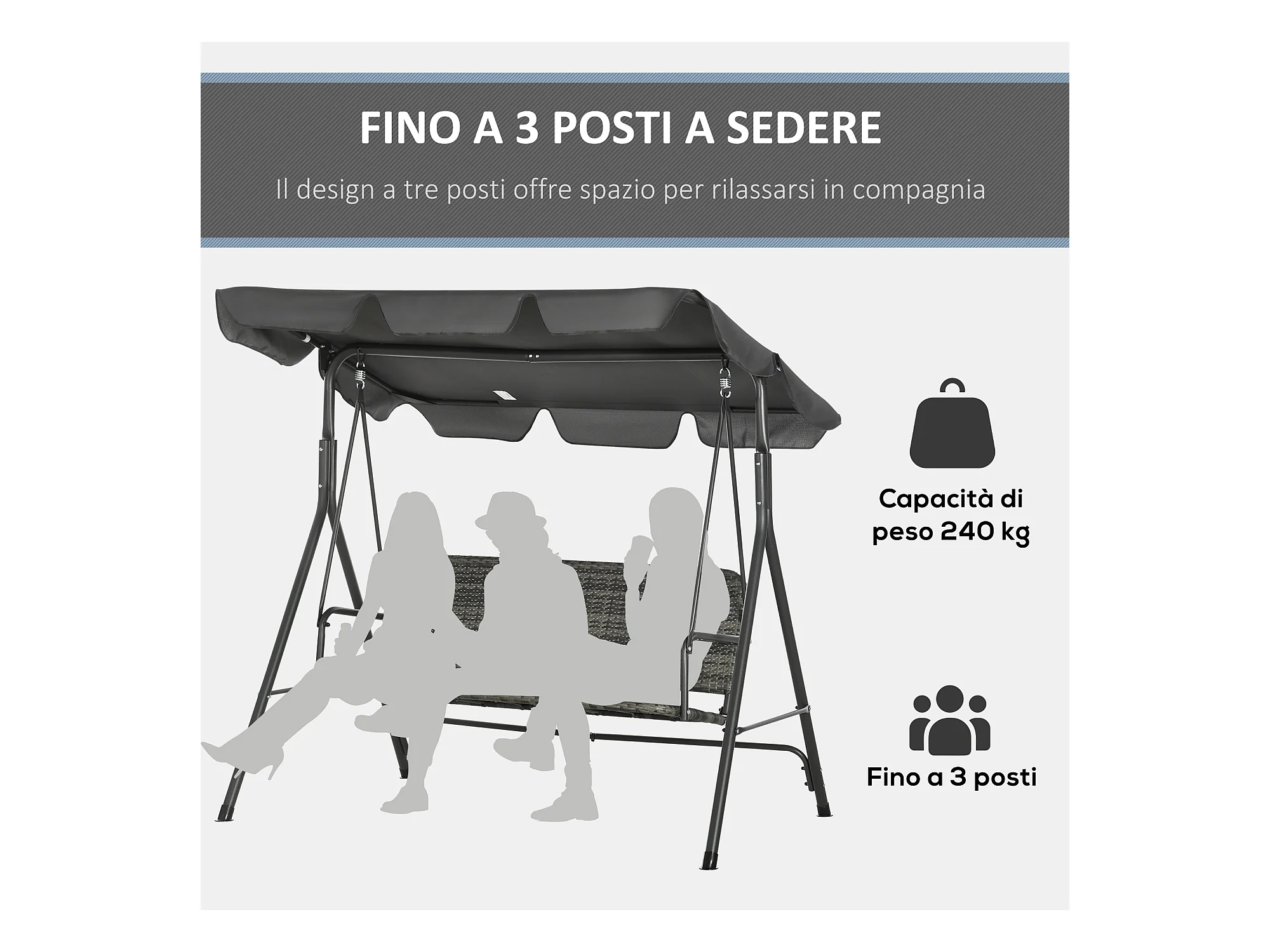 Dondolo da giardino 3 posti con tetto parasole regolabile grigio scuro