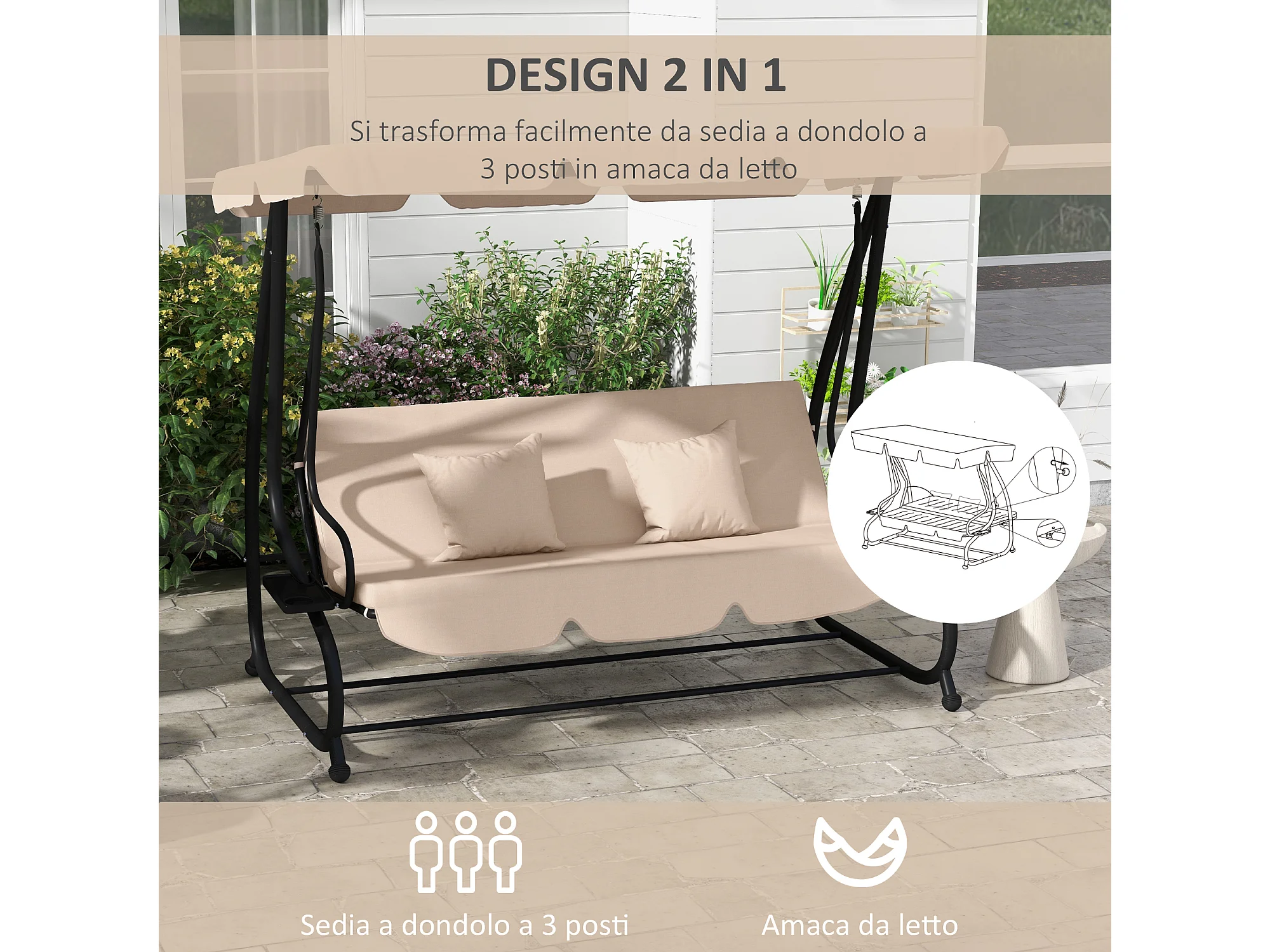 Dondolo letto da giardino 3 posti con tetto regolabile marrone chiaro
