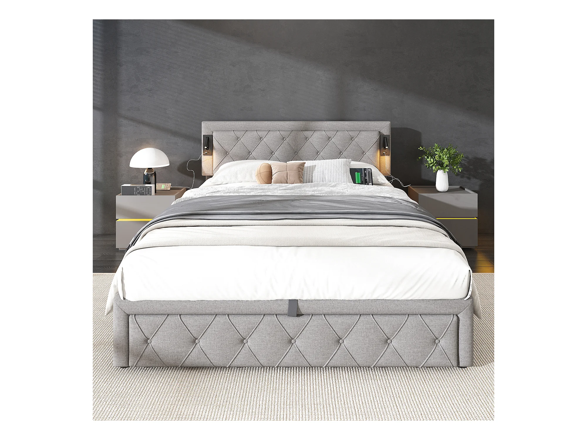 Letto contenitore 160 x 200 cm con testiera ampia - Lampada da lettura e prese USB + Type-C - LED - Tessuto Lino - Grigio (senza materasso)