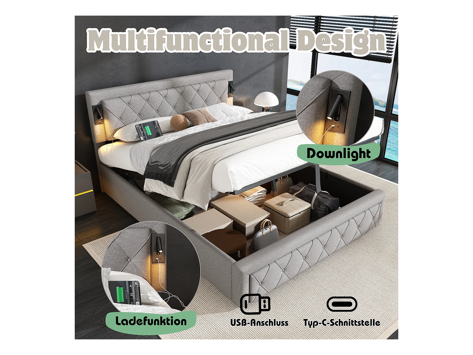 Letto contenitore imbottito 160x200cm - con portabicchieri nascosto - con porte USB e Tipo-C - con rete a doghe - Lino - Grigio (senza materasso)