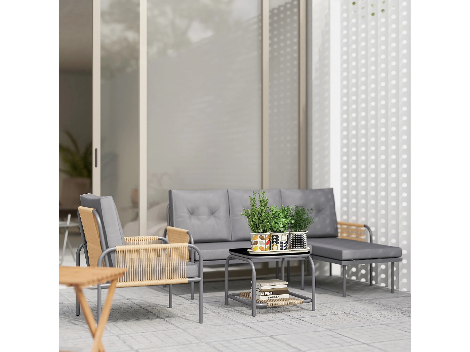 EasyComfort Salotto da Giardino 4 Pezzi in Rattan con Divano, Chaise Longue, Poltrona e Tavolino con Cuscini, Grigio