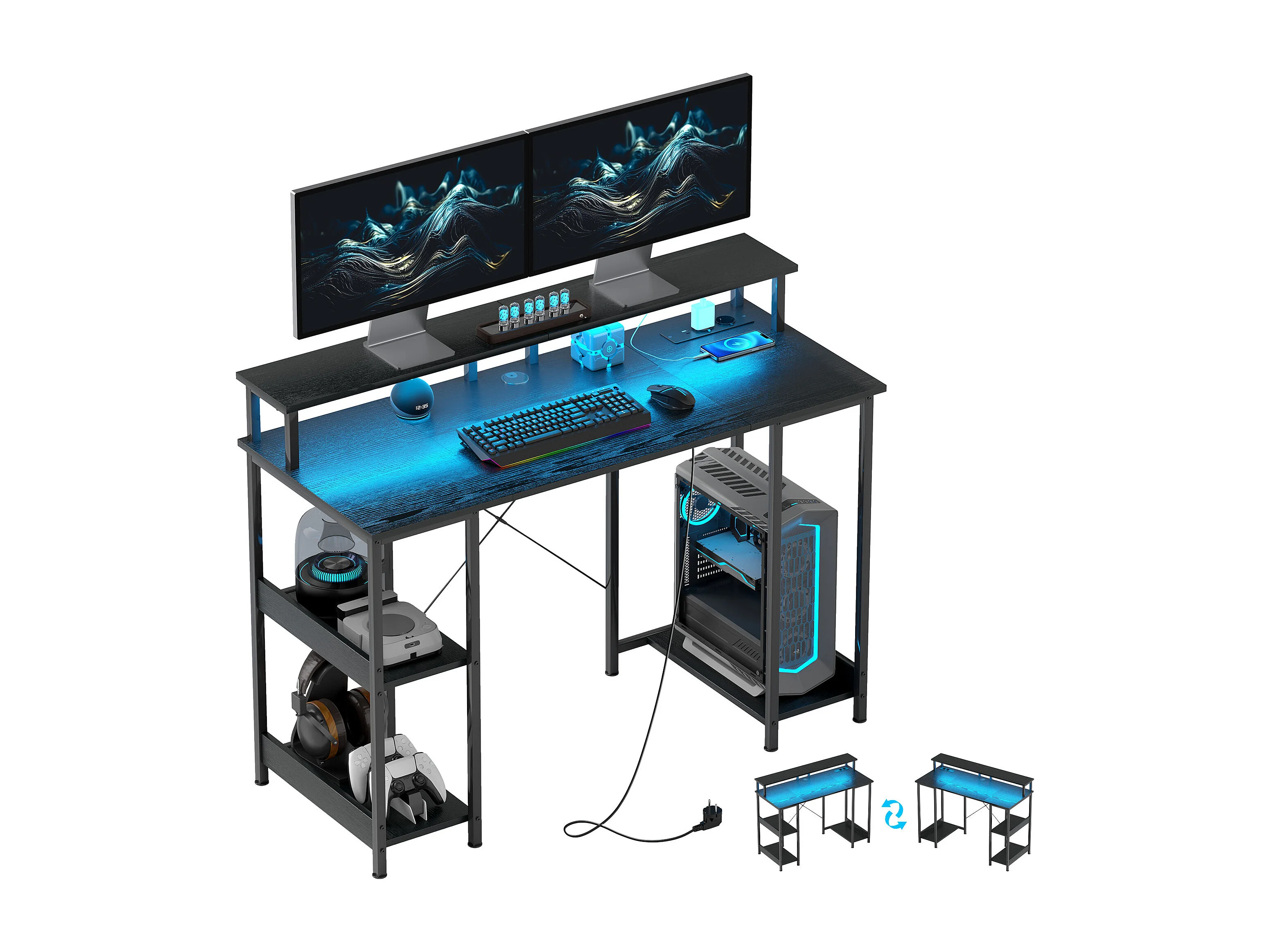 EasyComfort Scrivania per PC Reversibile con Prese Elettriche, Luci, Supporto Monitor e Scaffale, 120x50cm, Nero