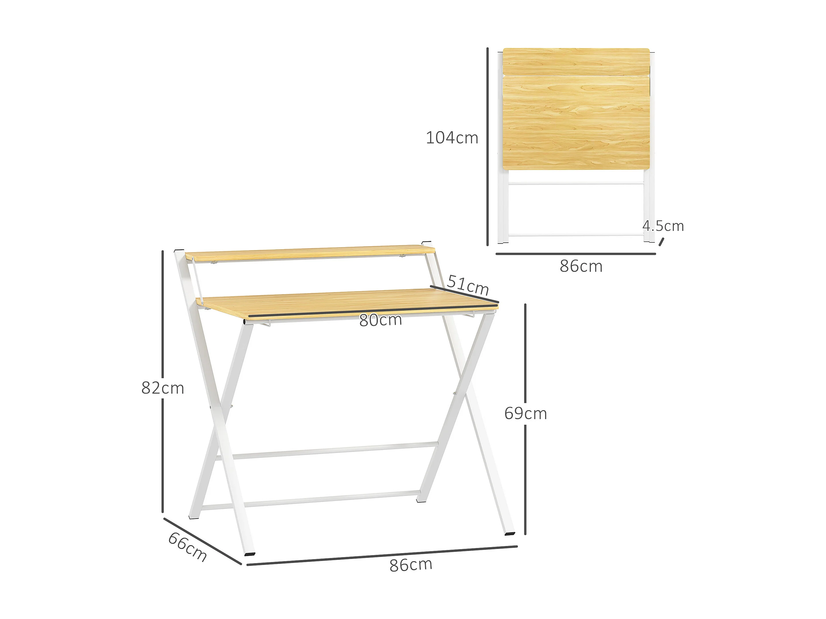 EasyComfort Scrivania Pieghevole con Ripiano Rialzato e Gambe a X, in Legno e Acciaio, 86x66x82 cm, Bianco e color Legno