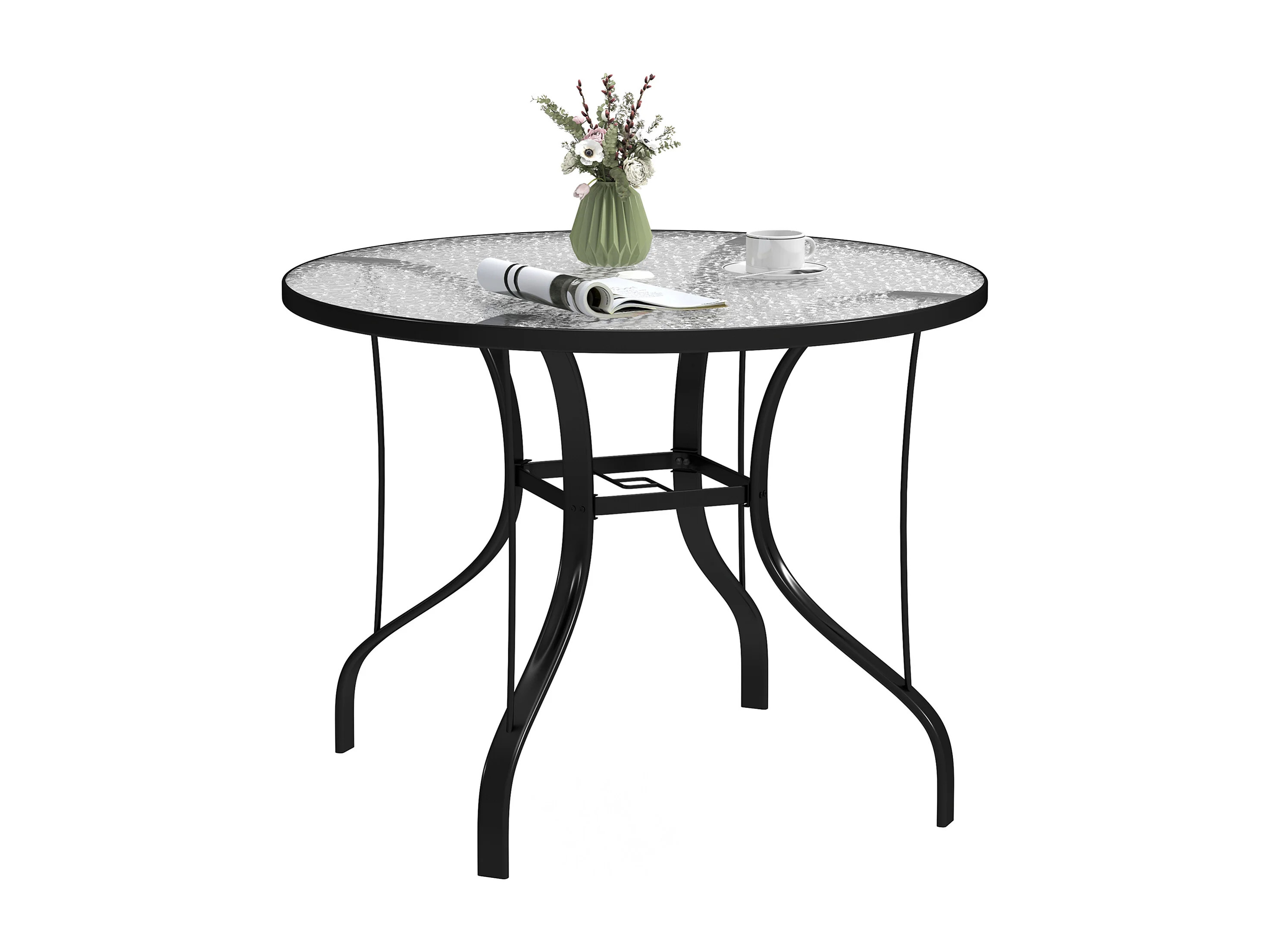 EasyComfort Tavolino da Giardino Rotondo con Foro per Ombrellone, in Metallo e Vetro Temperato, Ø96.5x71 cm, Nero