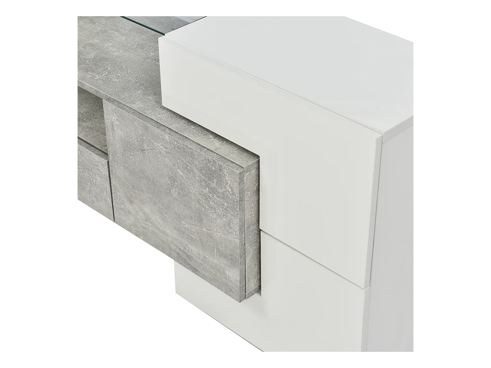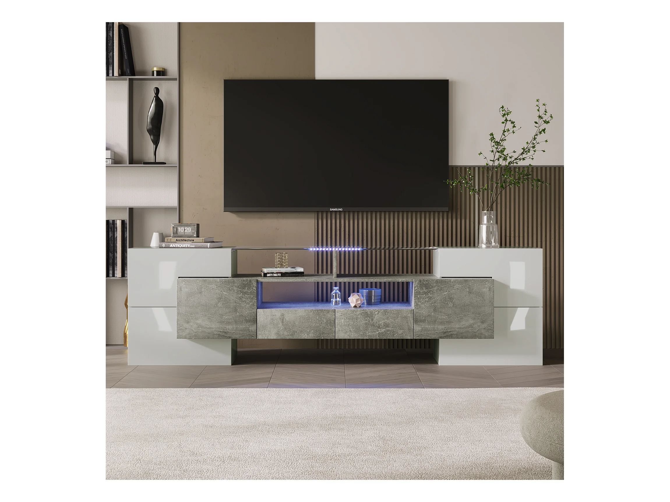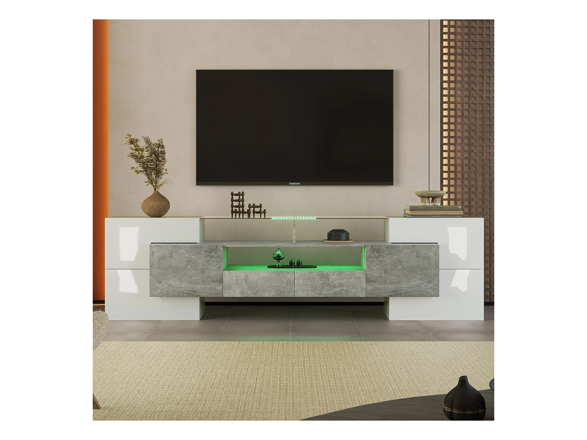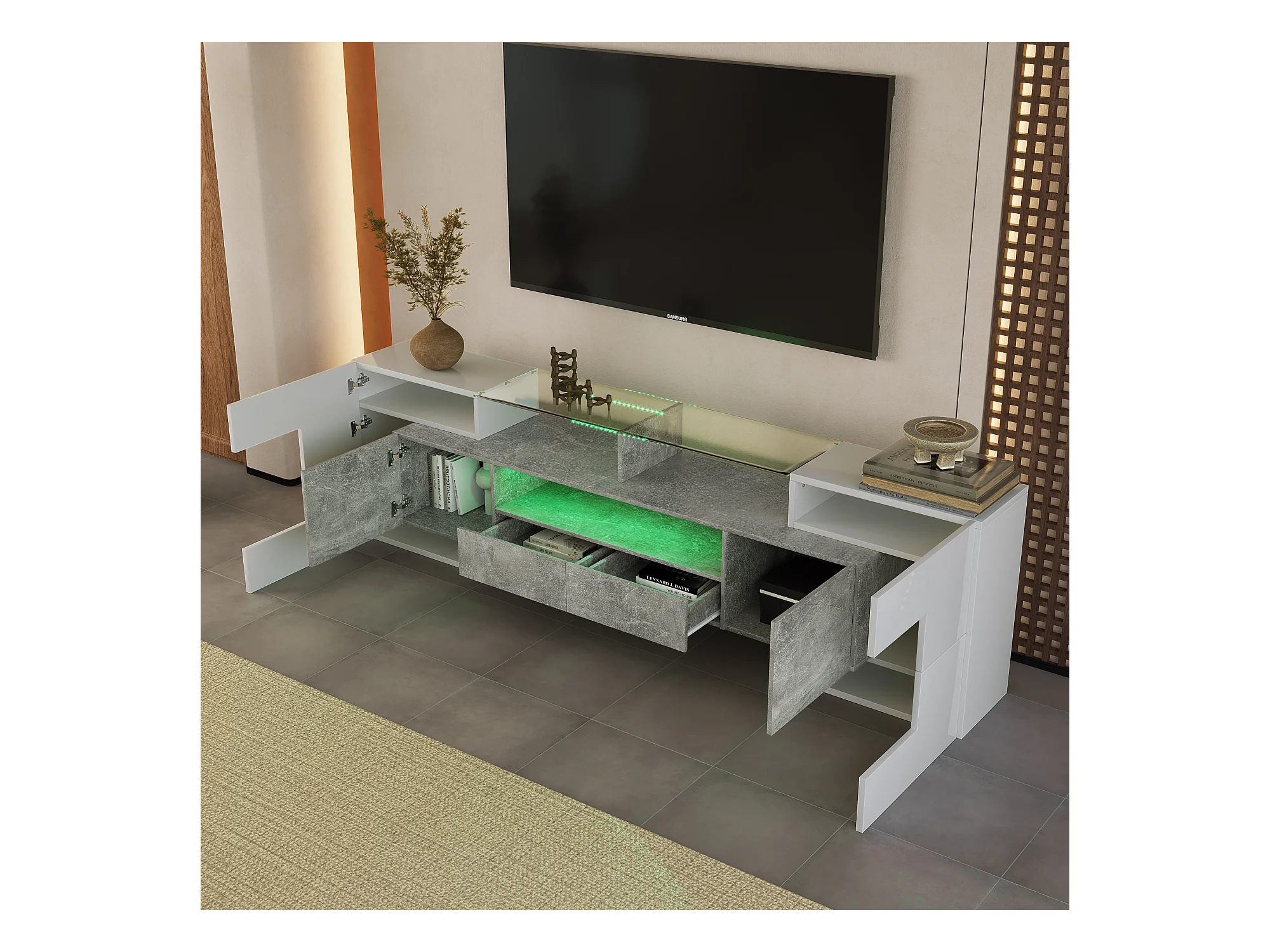 Elegante mobile porta TV, 200 cm, laccato bianco, illuminazione a LED