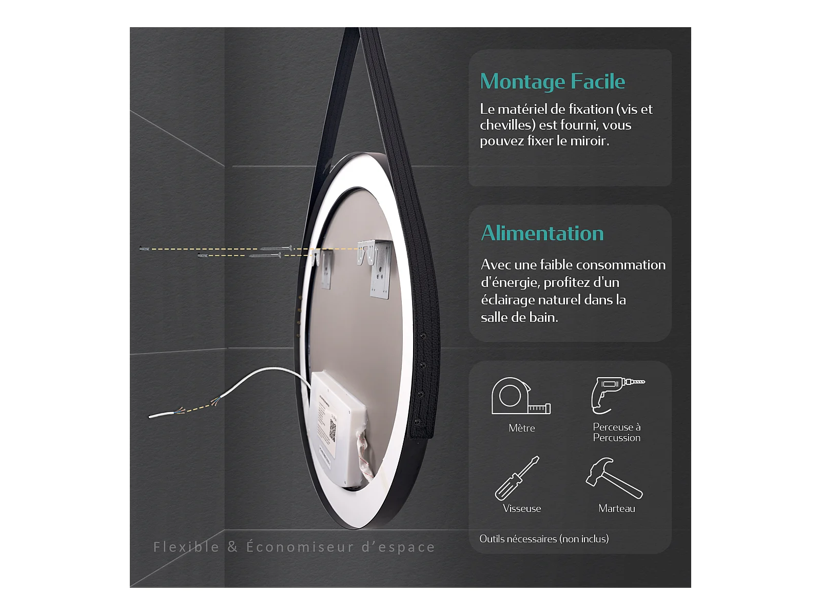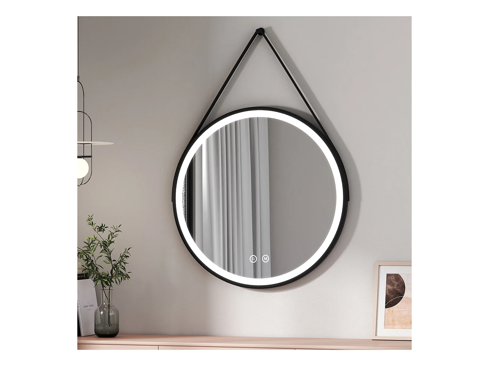 EMKE LED Specchio da bagno rotondo con cornice nera e tracolla regolabile Interruttore a sfioramento - Diametro 50cm | Luce bianca fredda