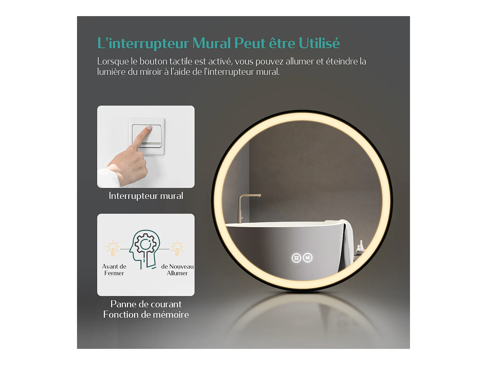 EMKE Specchio da bagno a LED Specchio con antiappannamento, dimmerabile, funzione memoria, luce neutra, diametro 80 cm Cornice nera