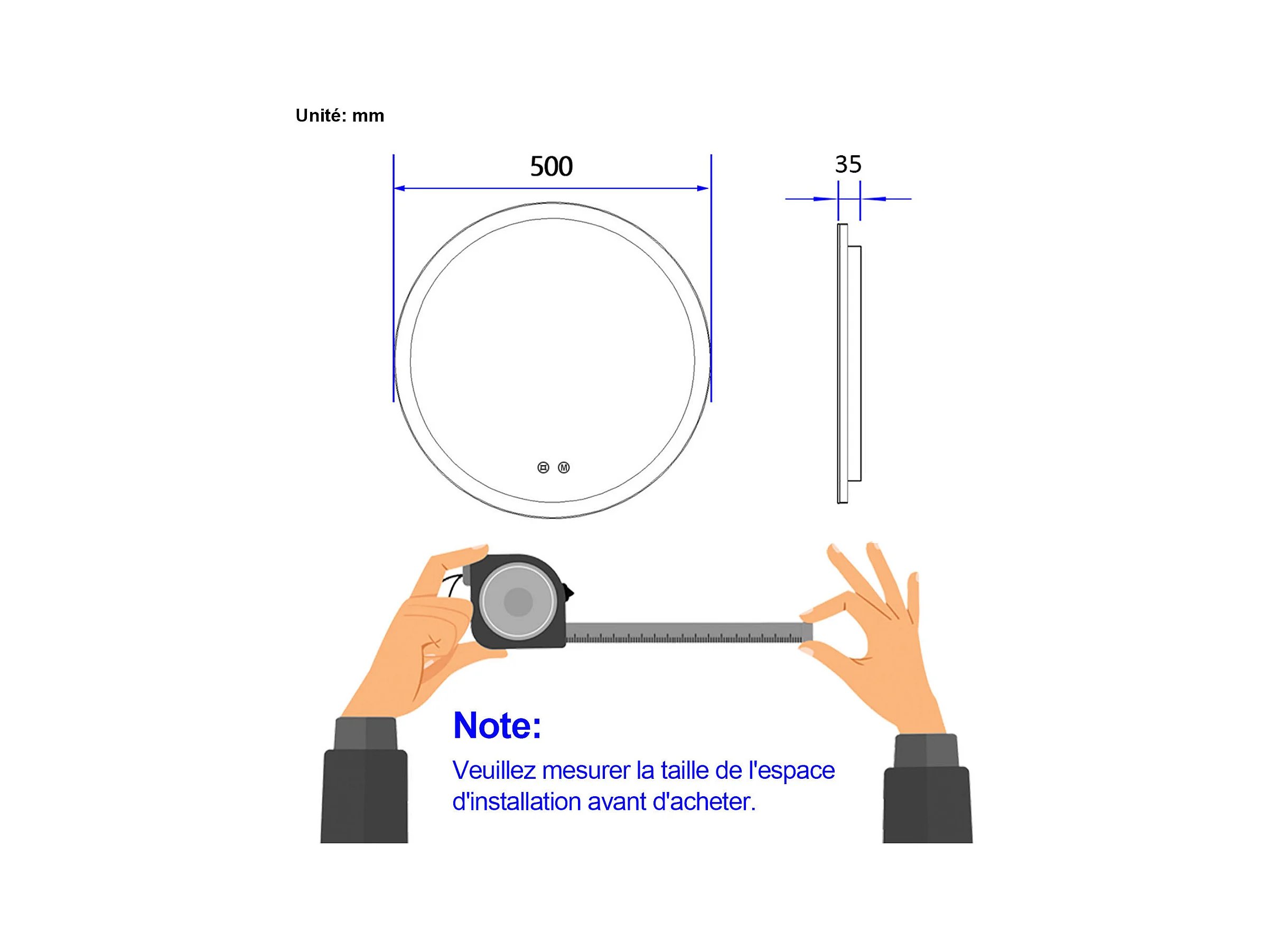 EMKE Specchio da bagno rotondo a LED con retroilluminazione senza cornice Interruttore a sfioramento - Diametro 50 cm | Luce bianca fredda