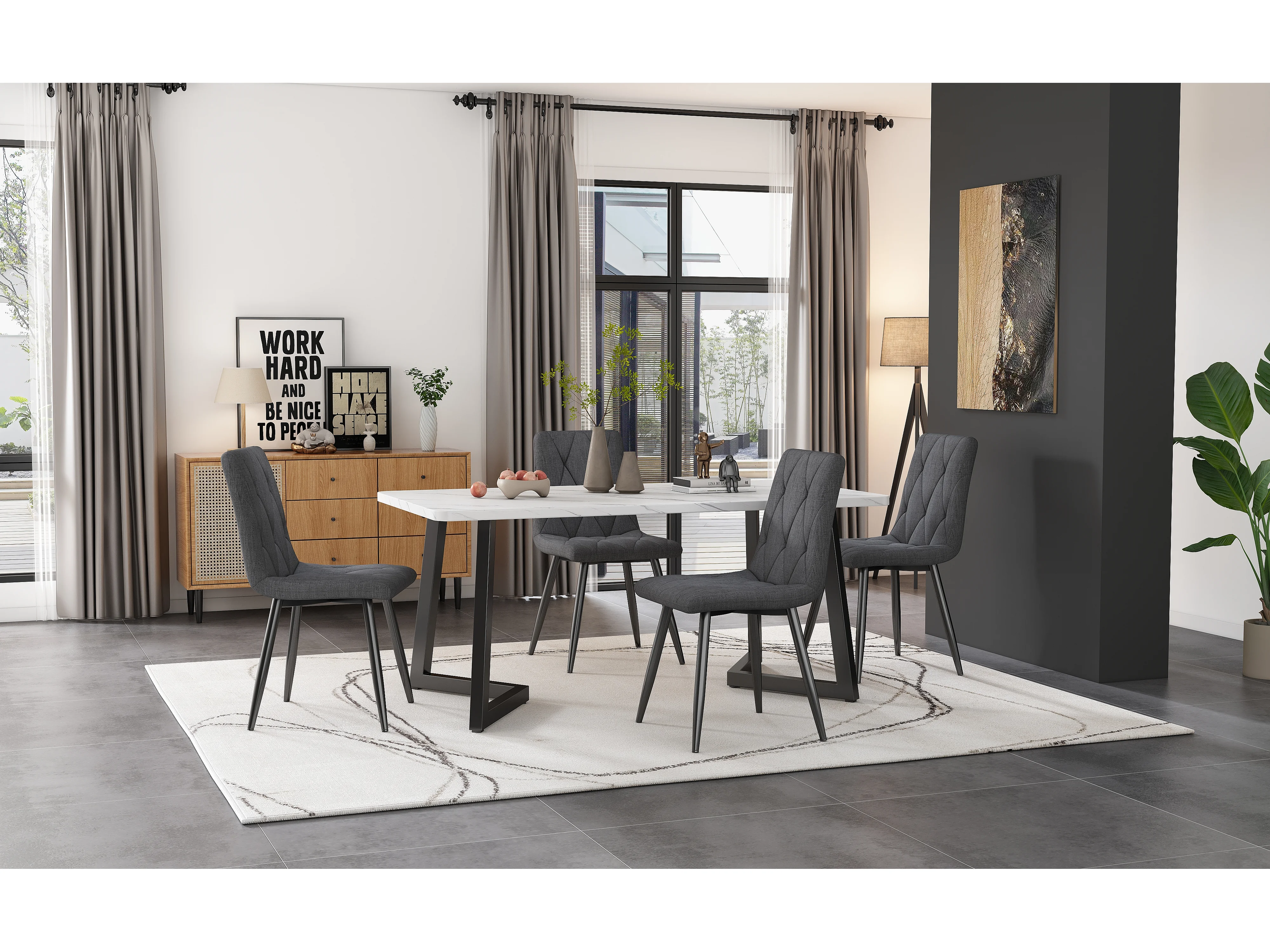 Ensemble Salle à Manger 5 Pezzi Tavolo 117×68 cm MDF Blanc Marmor Pieds Métal Chaises Lin Gris Foncé