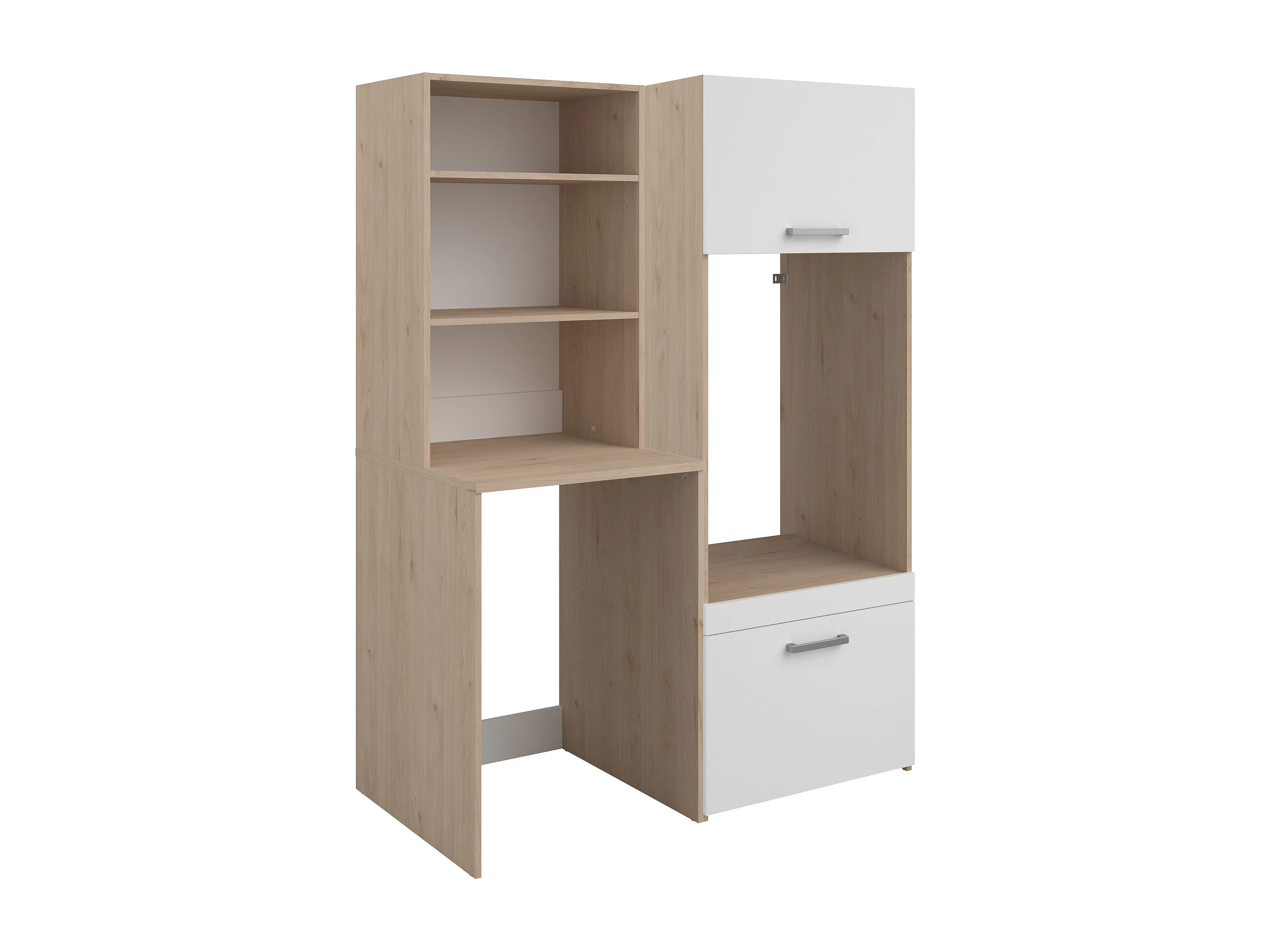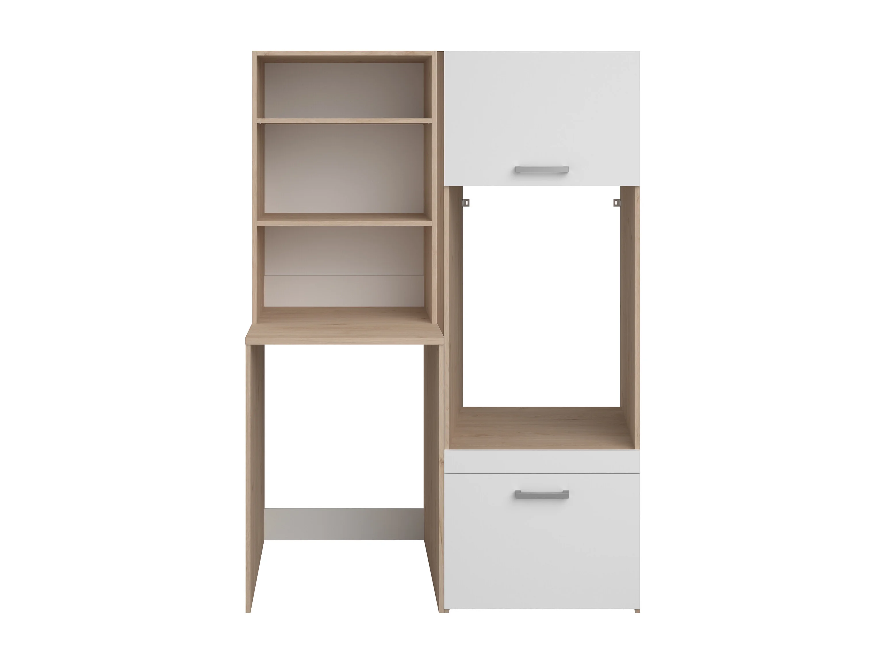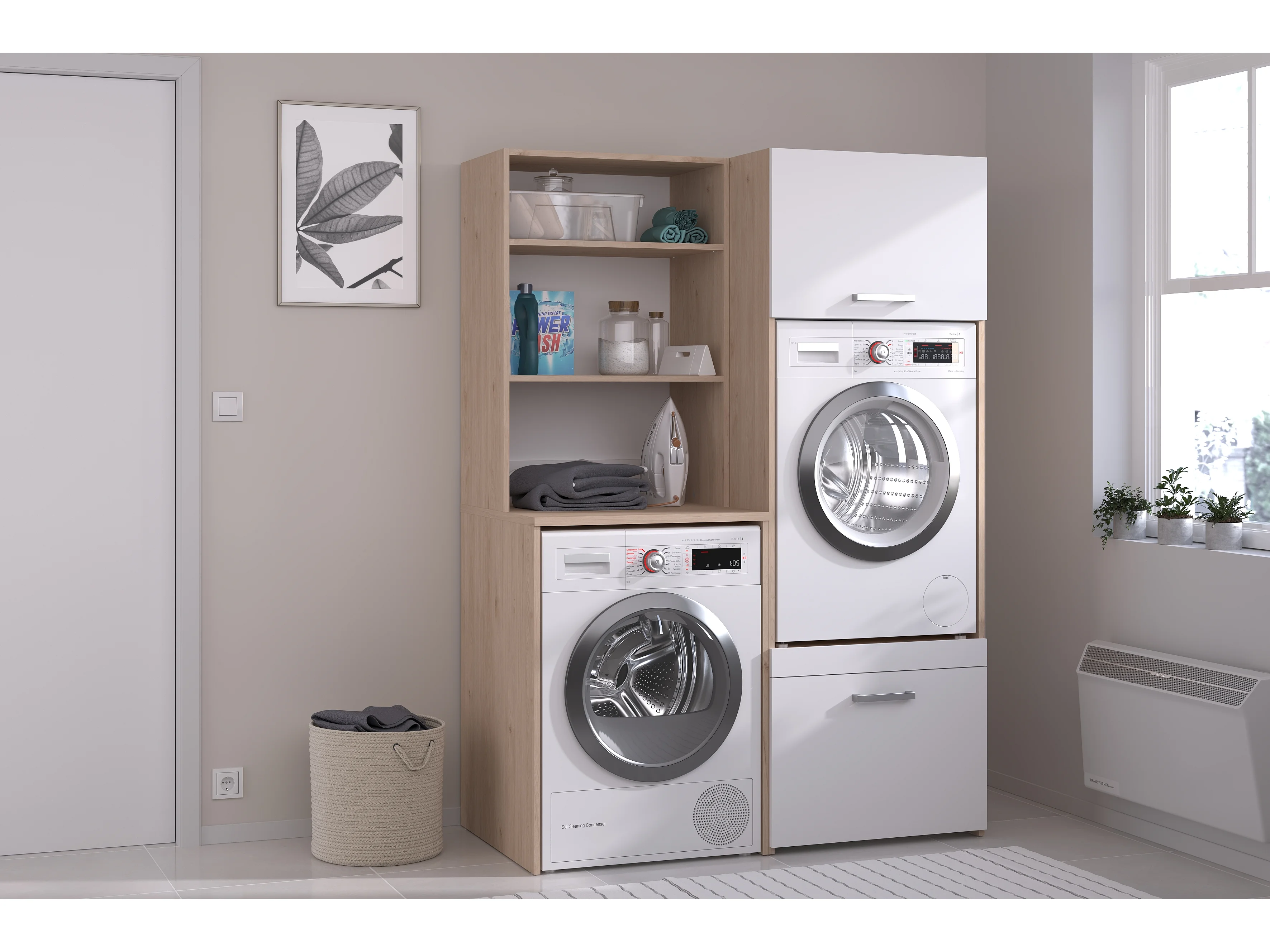 Mobile per 2 lavatrici con ripiani e armadi Naturale chiaro e bianco L128 x H184 – ERKANO