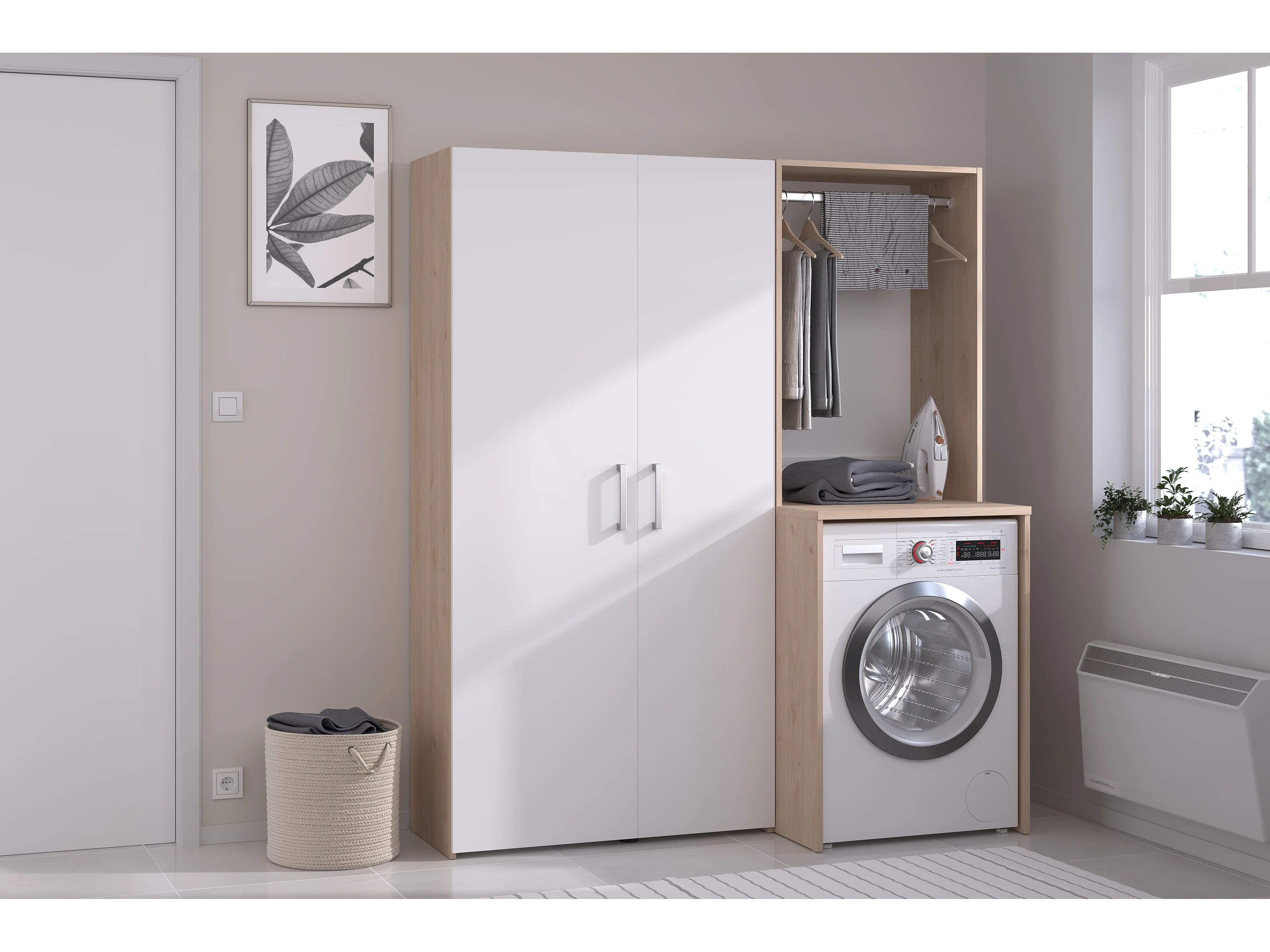 Mobile per lavatrice con armadio e colonna a doppia porta Naturale chiaro e bianco L156 x H184 – ERKANO