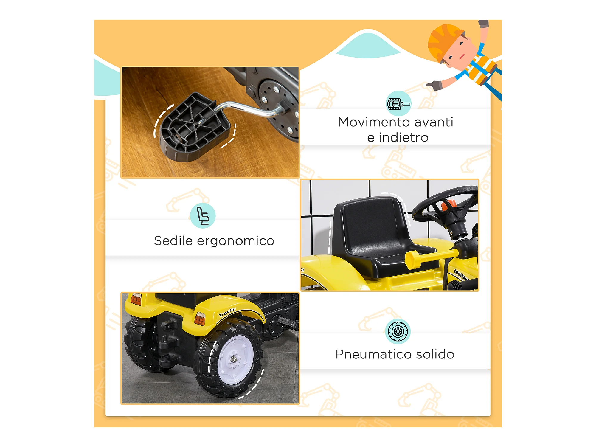 Escavatore a pedali per bambini con ruspa e rimorchio giallo