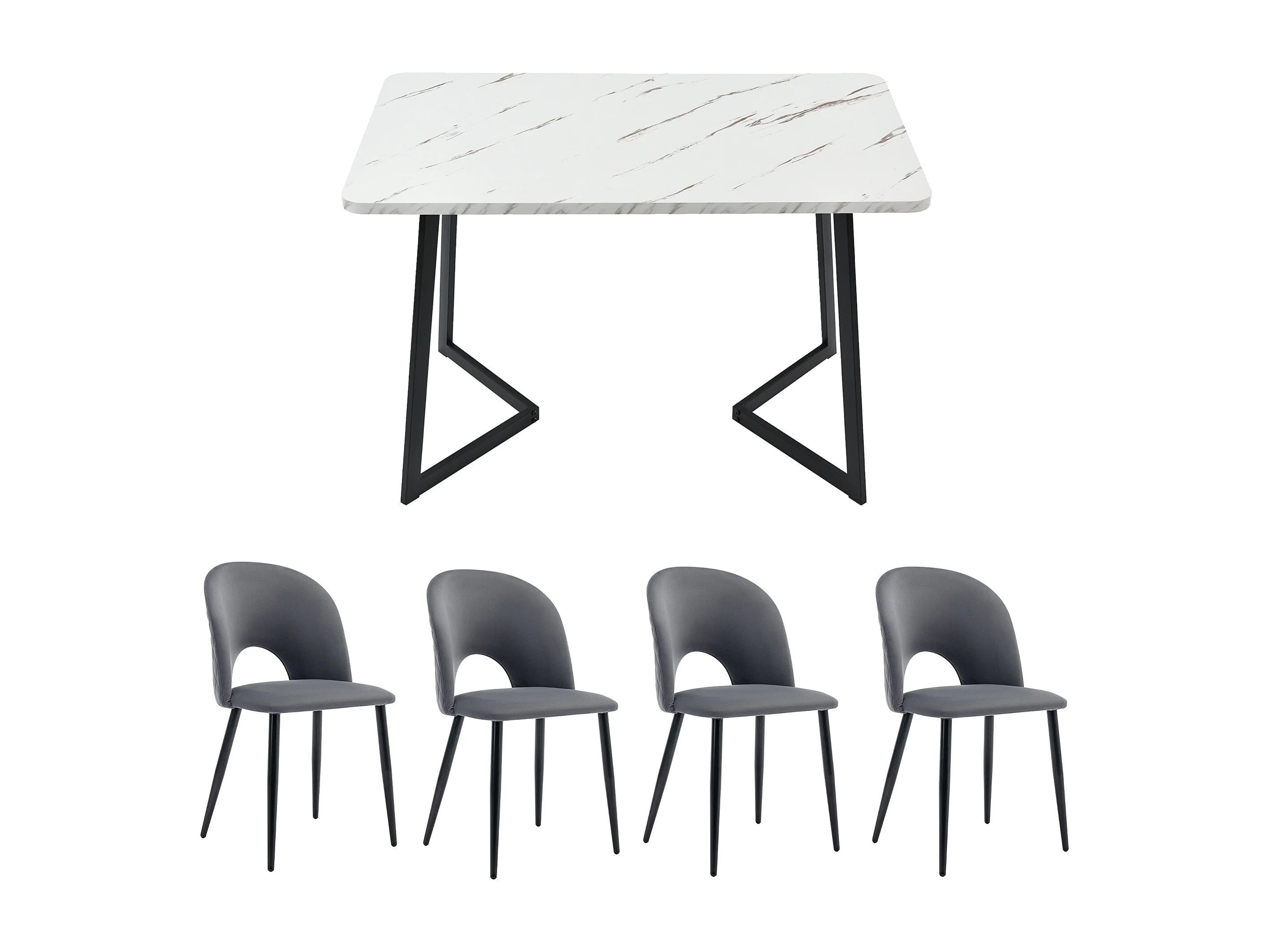Set da pranzo da 5 pezzi, tavolo 140x80x75 cm con 4 sedie in velluto grigio, gambe in metallo nero, tavolo in MDF bianco