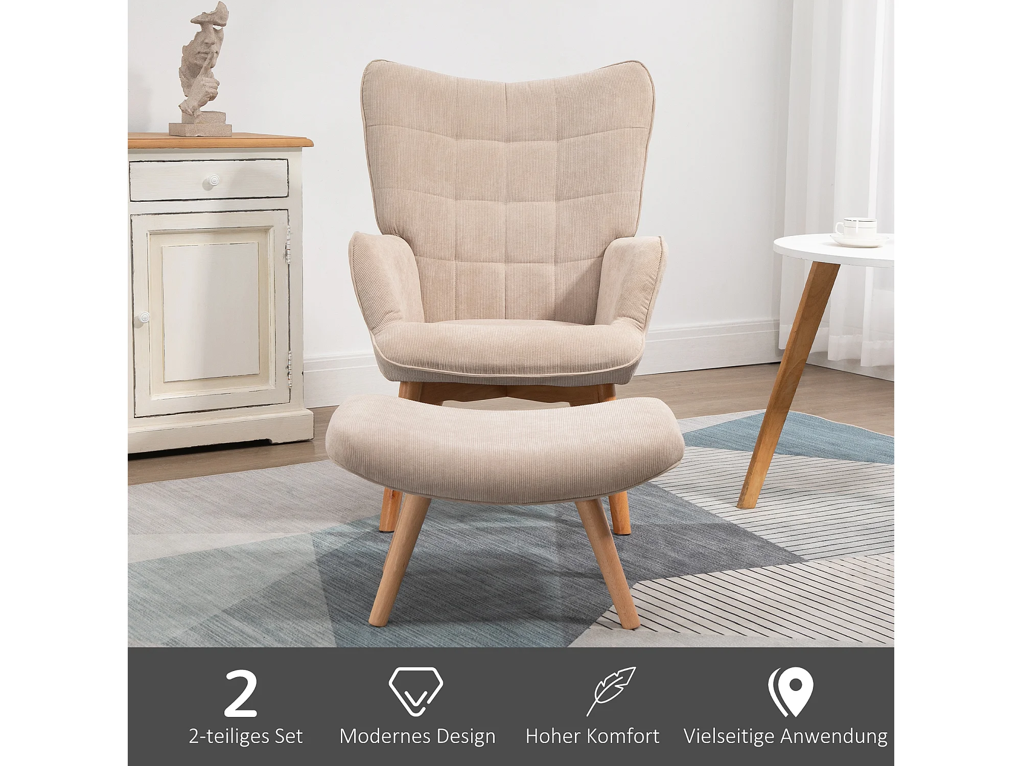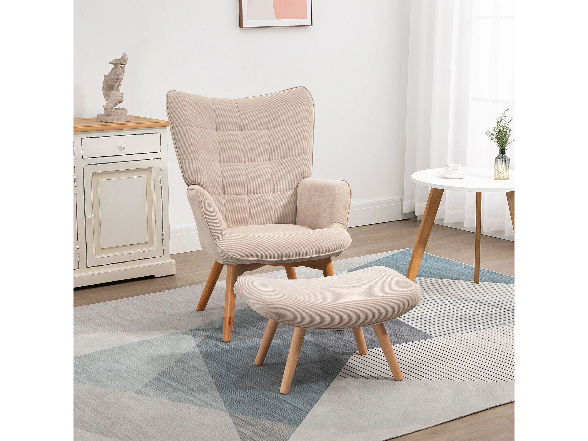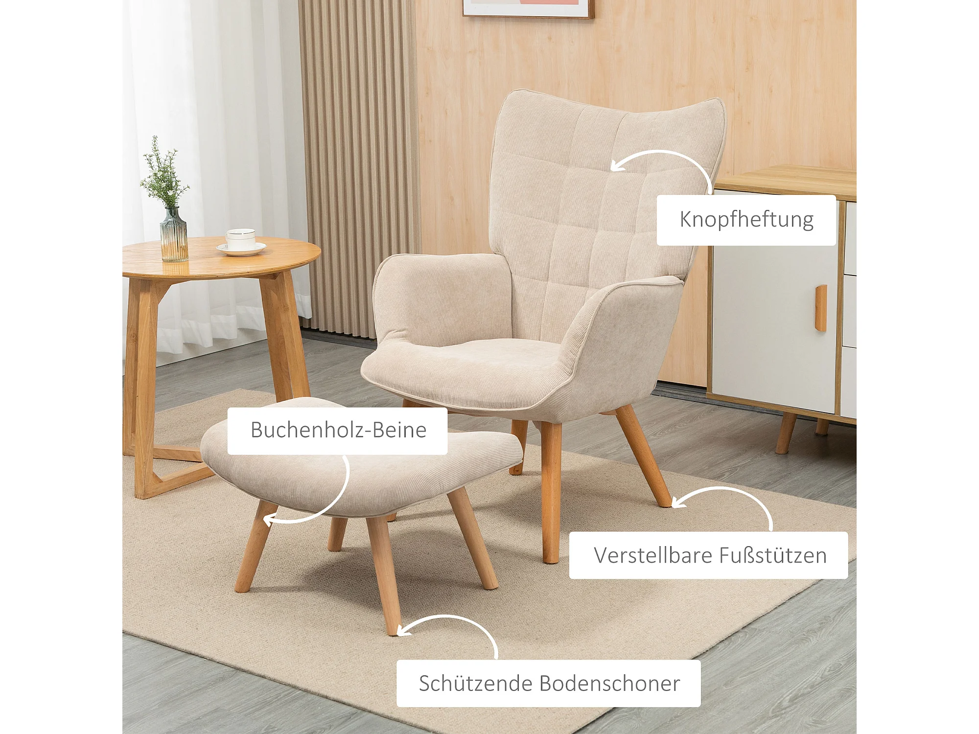 Fauteuil oreille avec repose-pieds velours côtelé lounge fauteuil salon accoudoirs beige 72x80x101 cm
