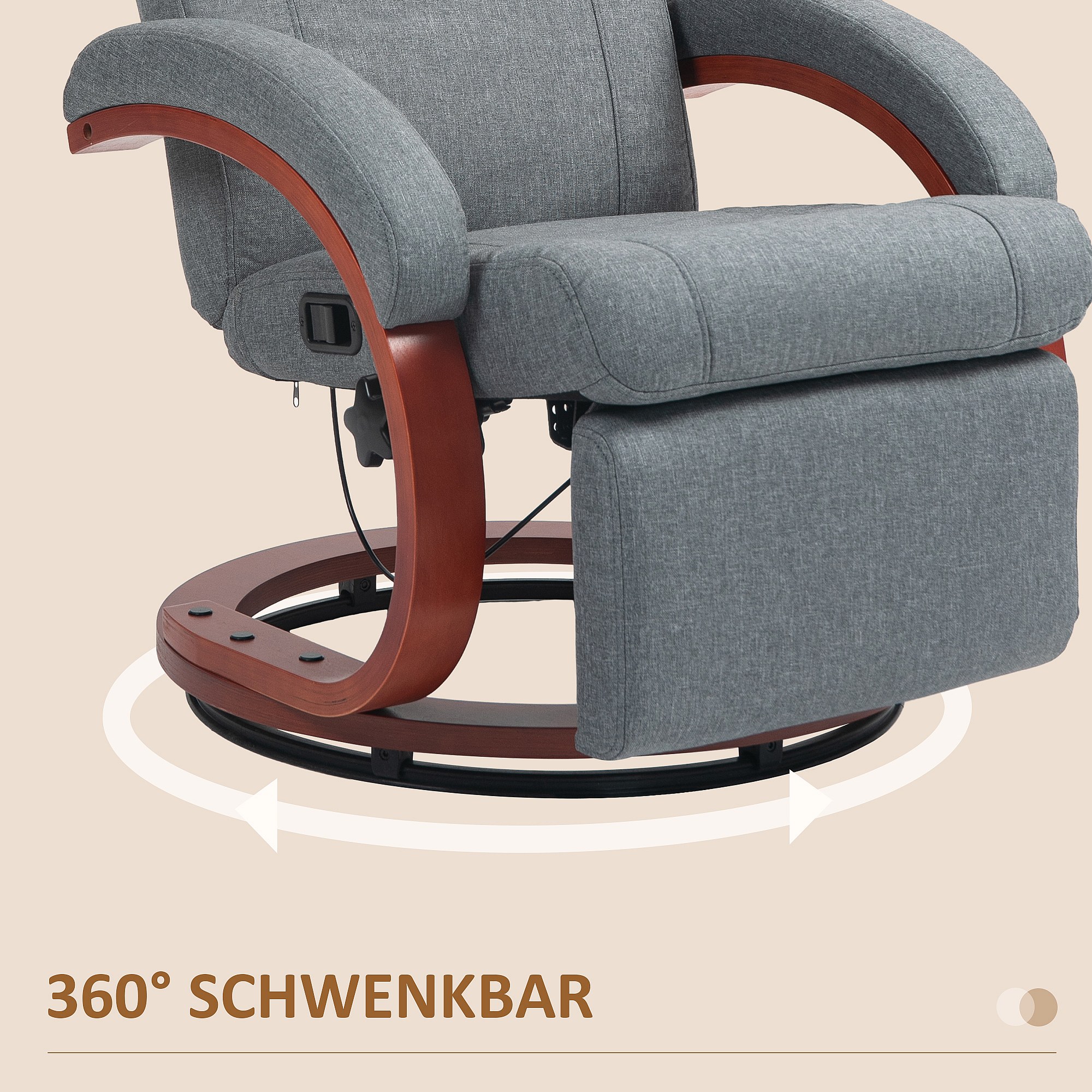 Fauteuil relax TV pivotant avec repose-pieds et accoudoirs bois, tissu gris, 68x86x100 cm