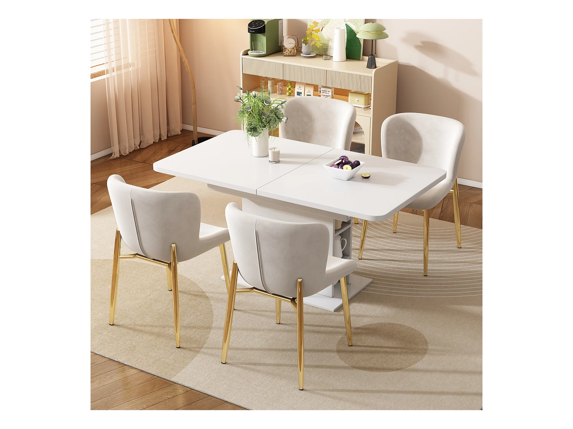 Set di 6 sedie da pranzo in velluto, gambe in legno massello, cuscino spesso, con piedini regolabili, colore beige