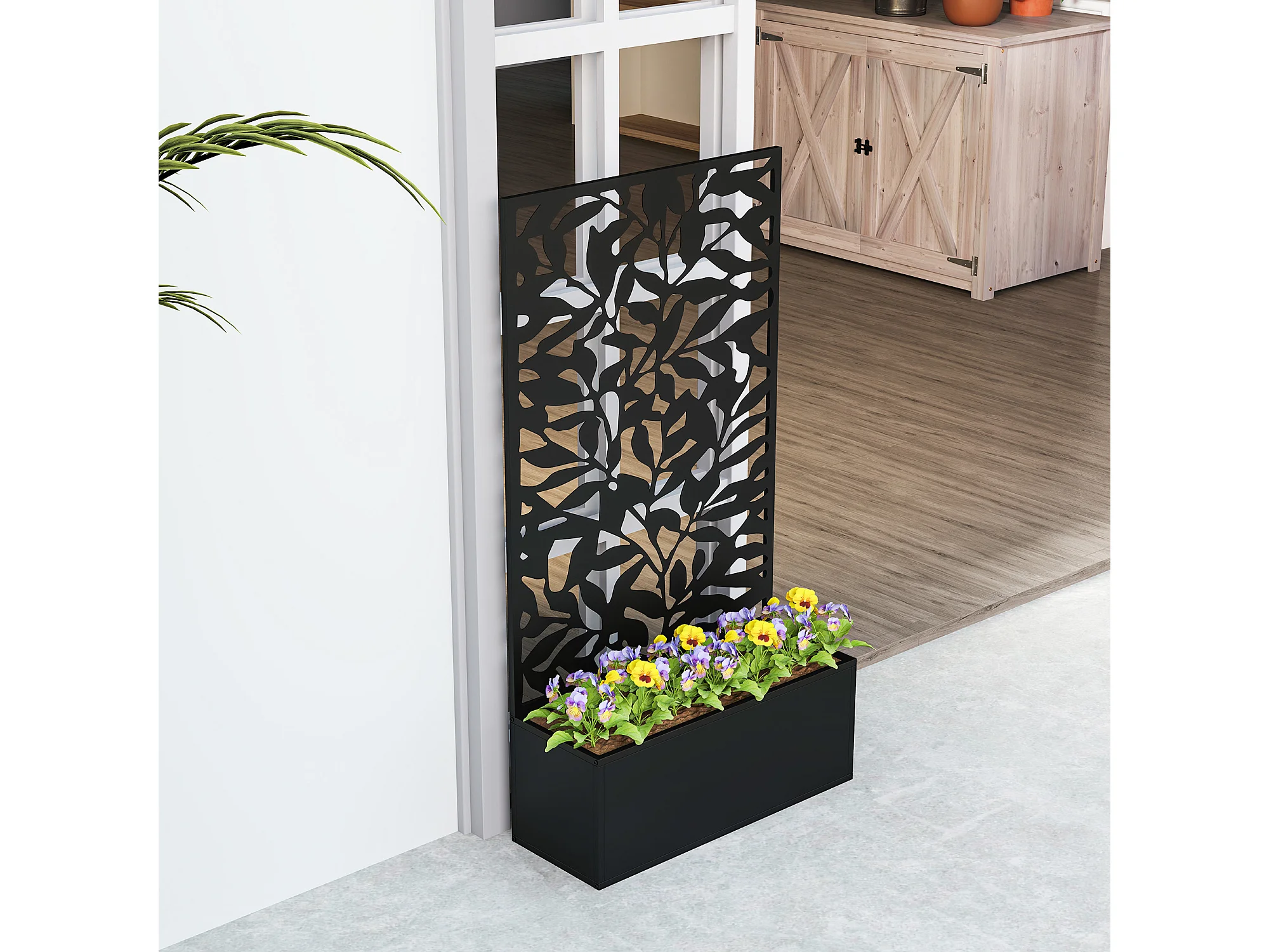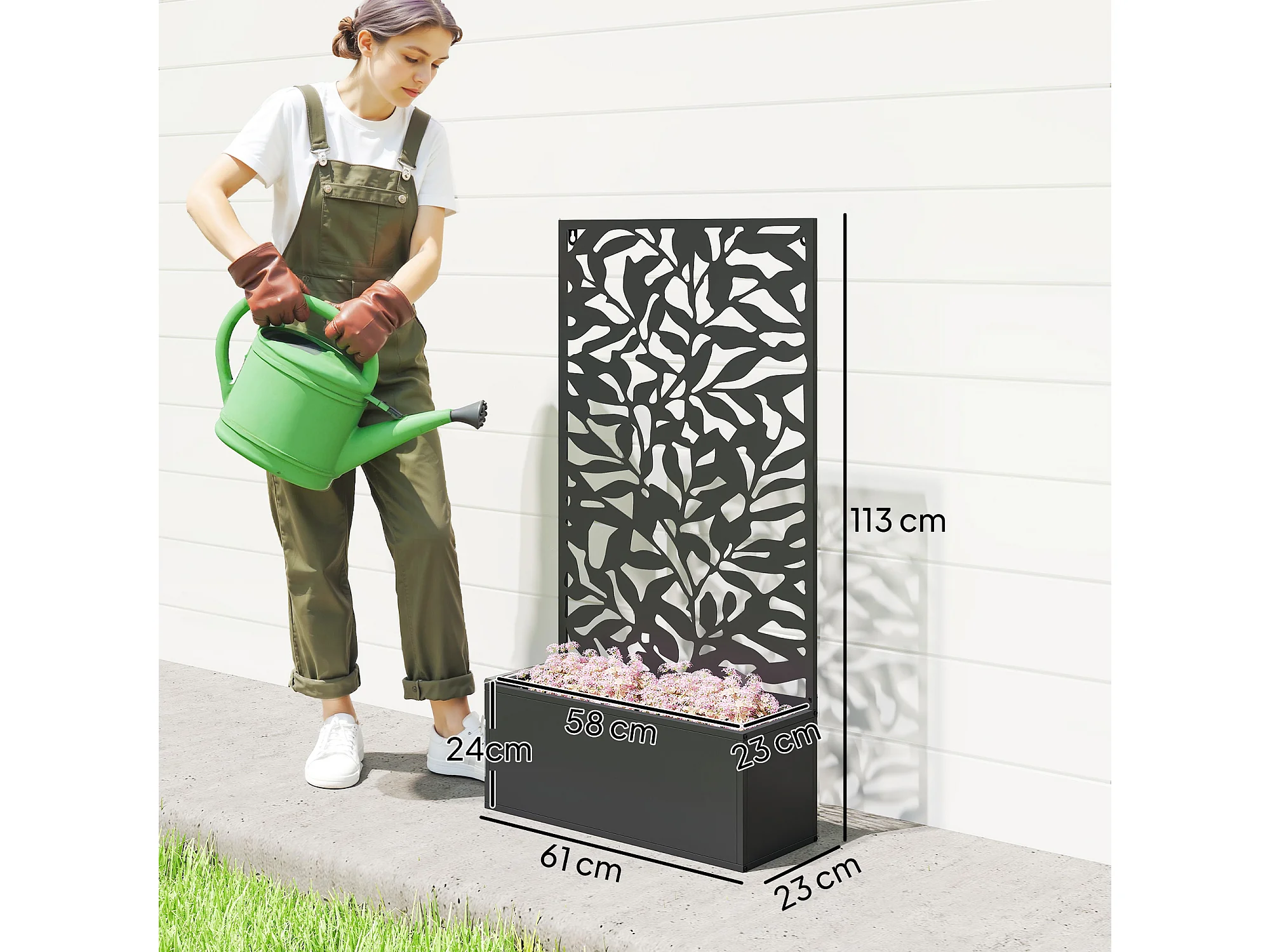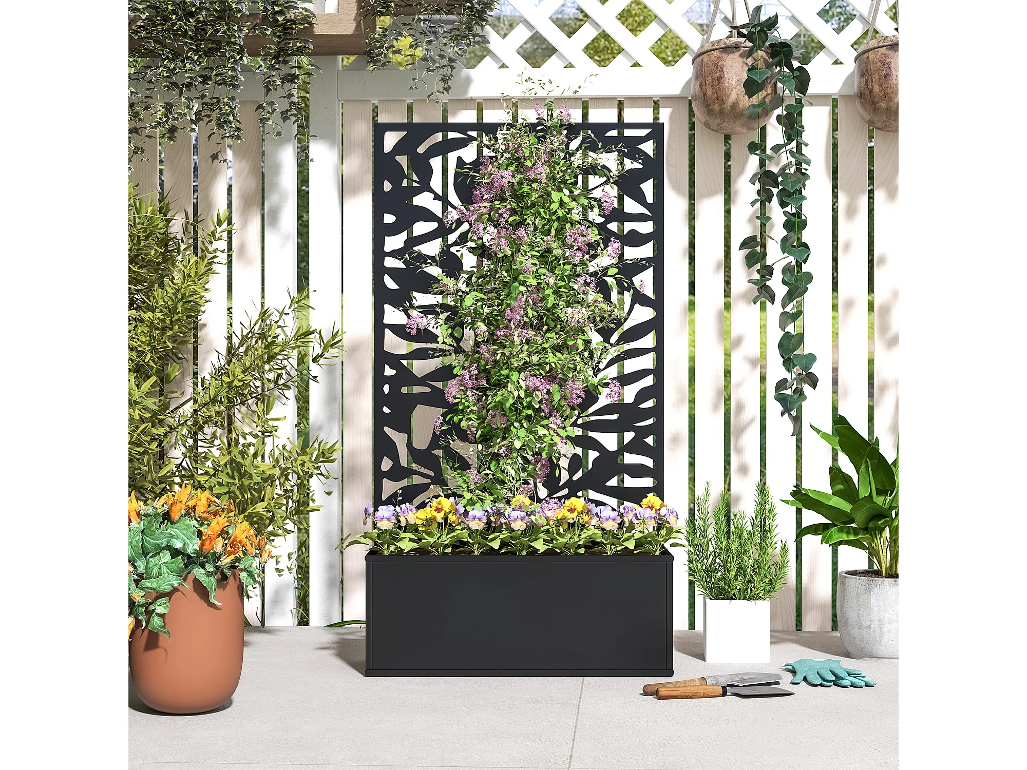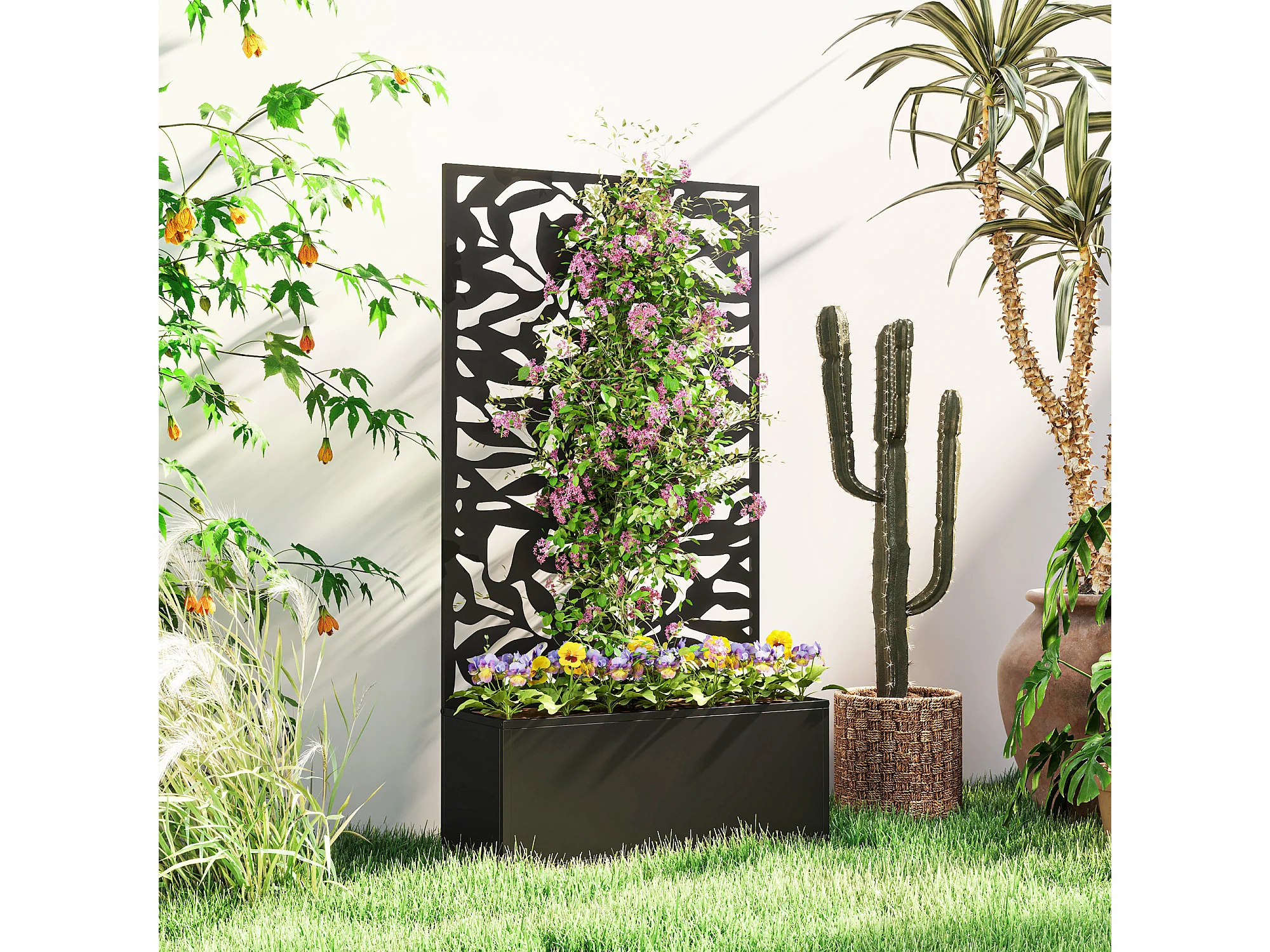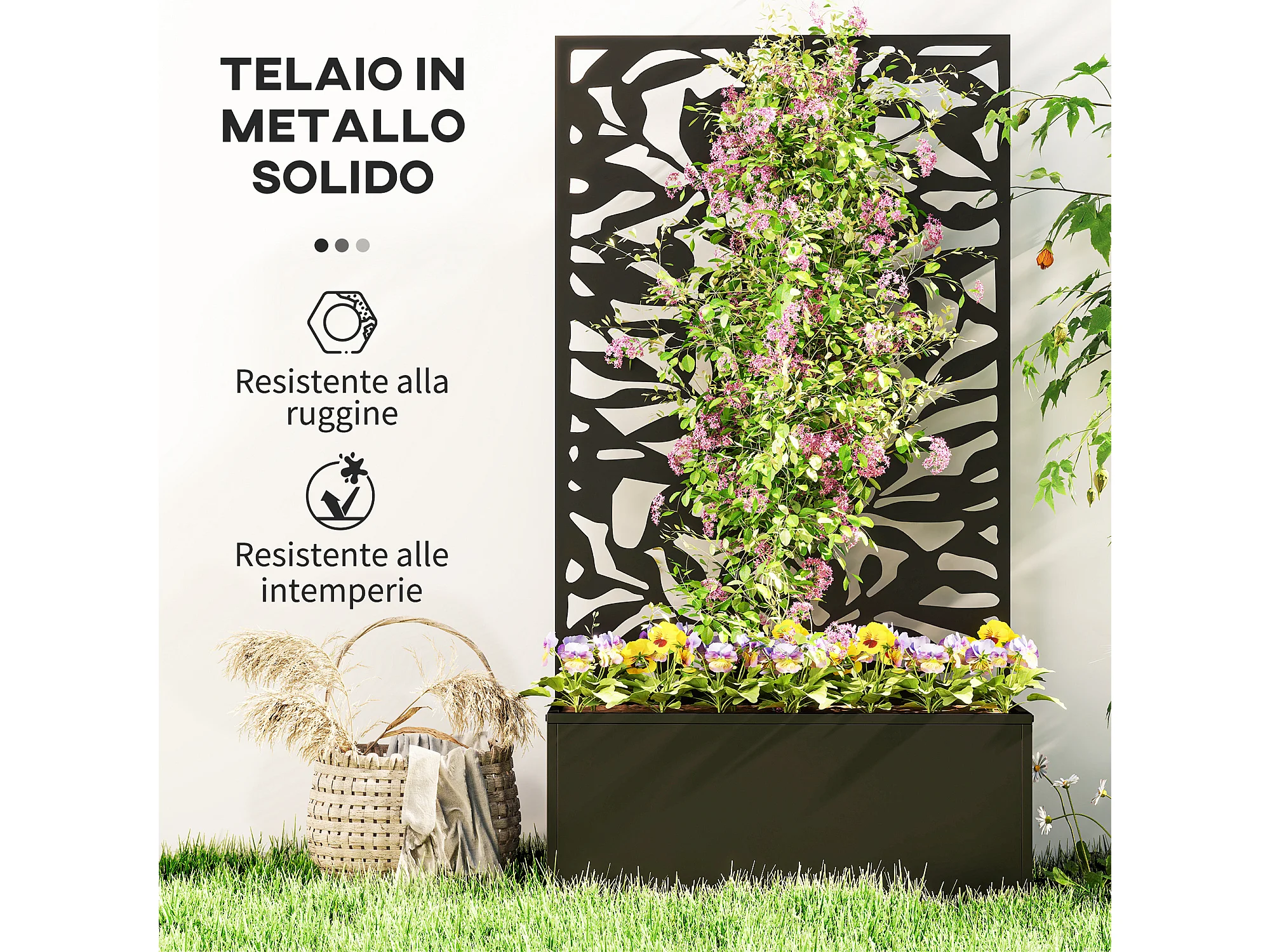 Fioriera rialzata con spalliera decorativa in metallo nero