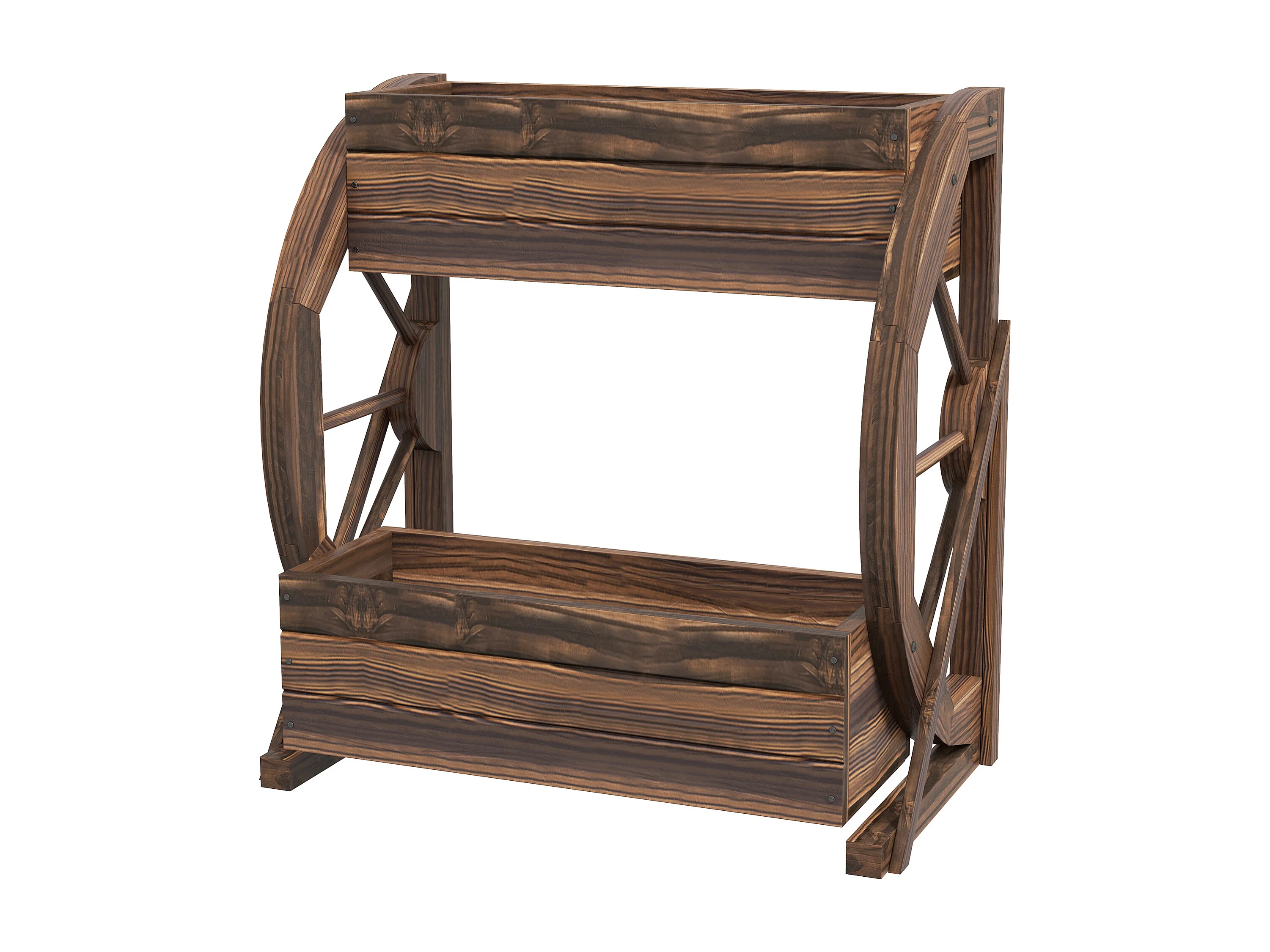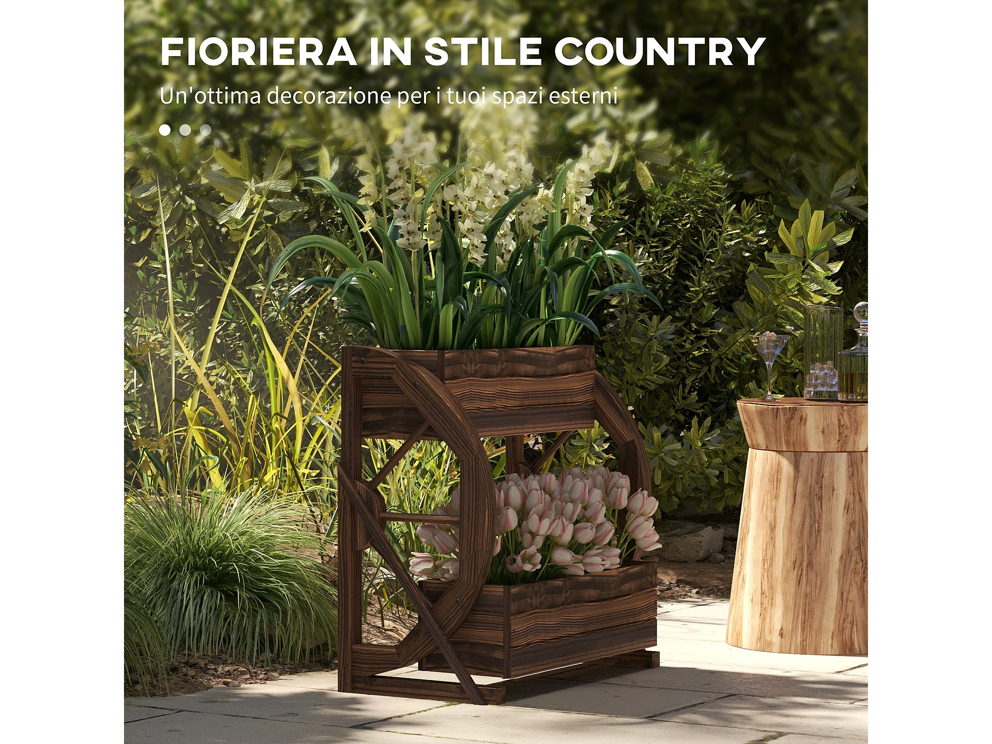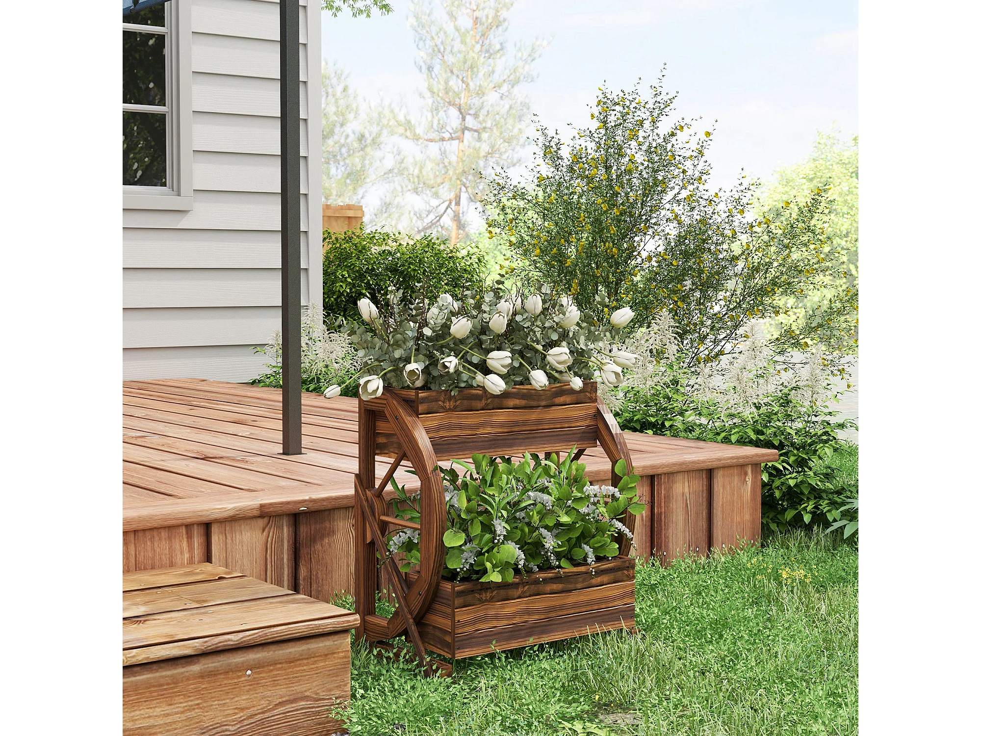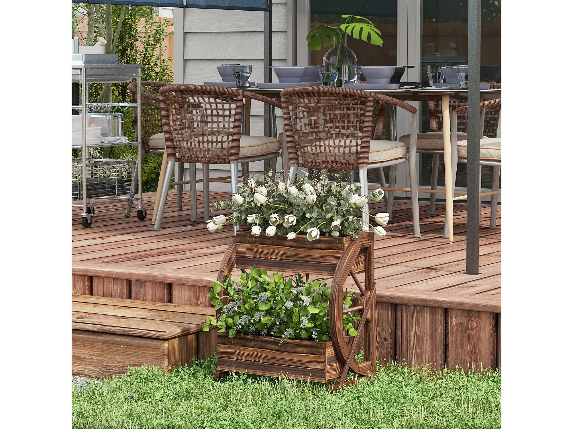 Fioriera da giardino a 2 livelli e 2 vasi con ruote di carro in legno
