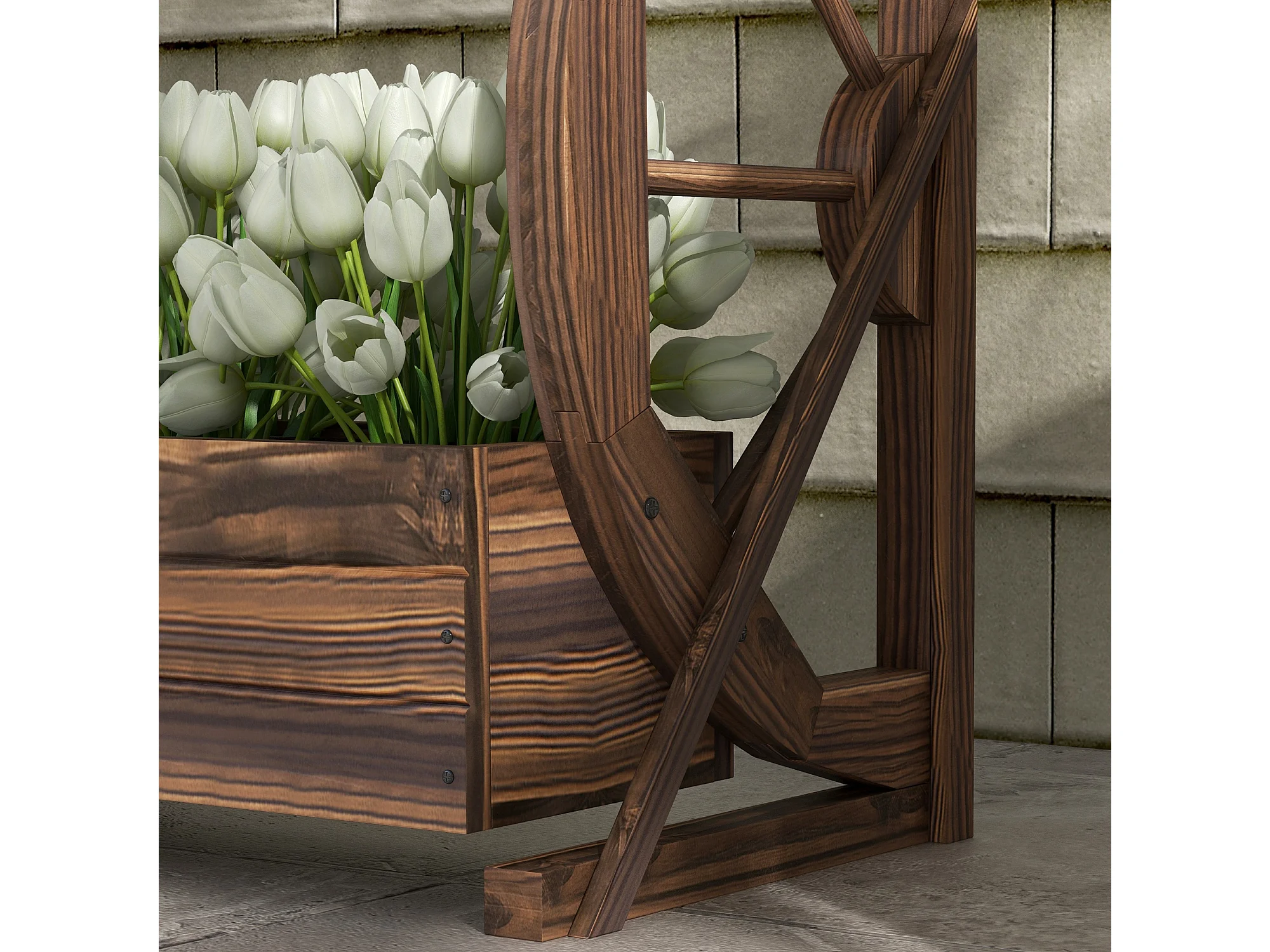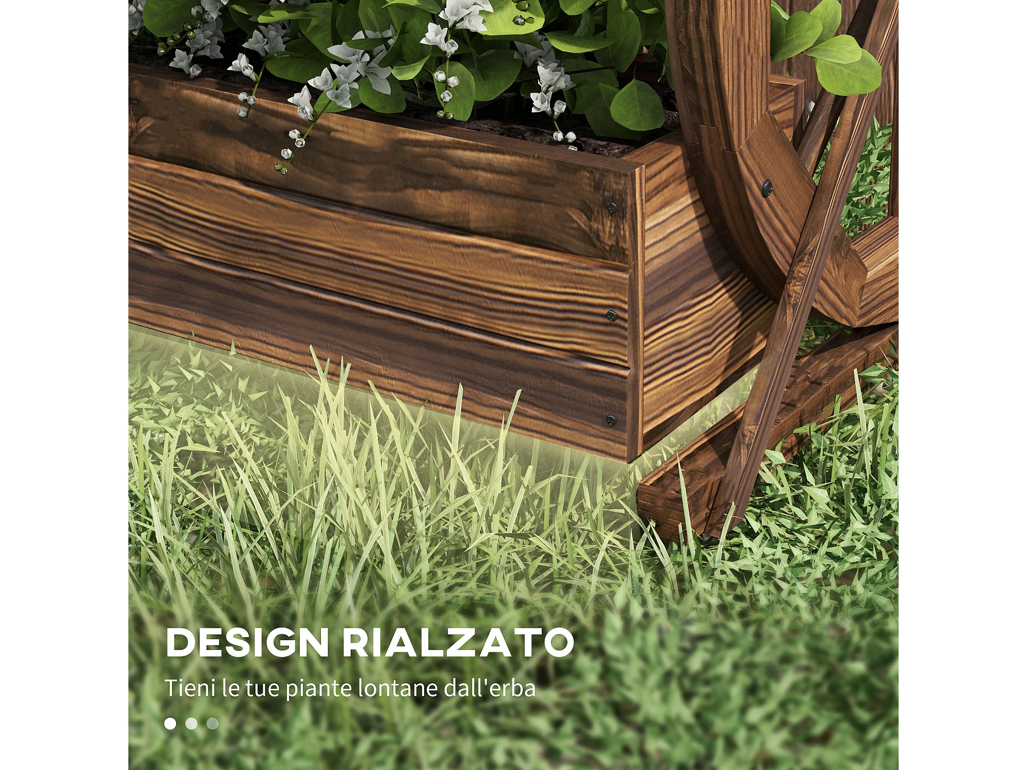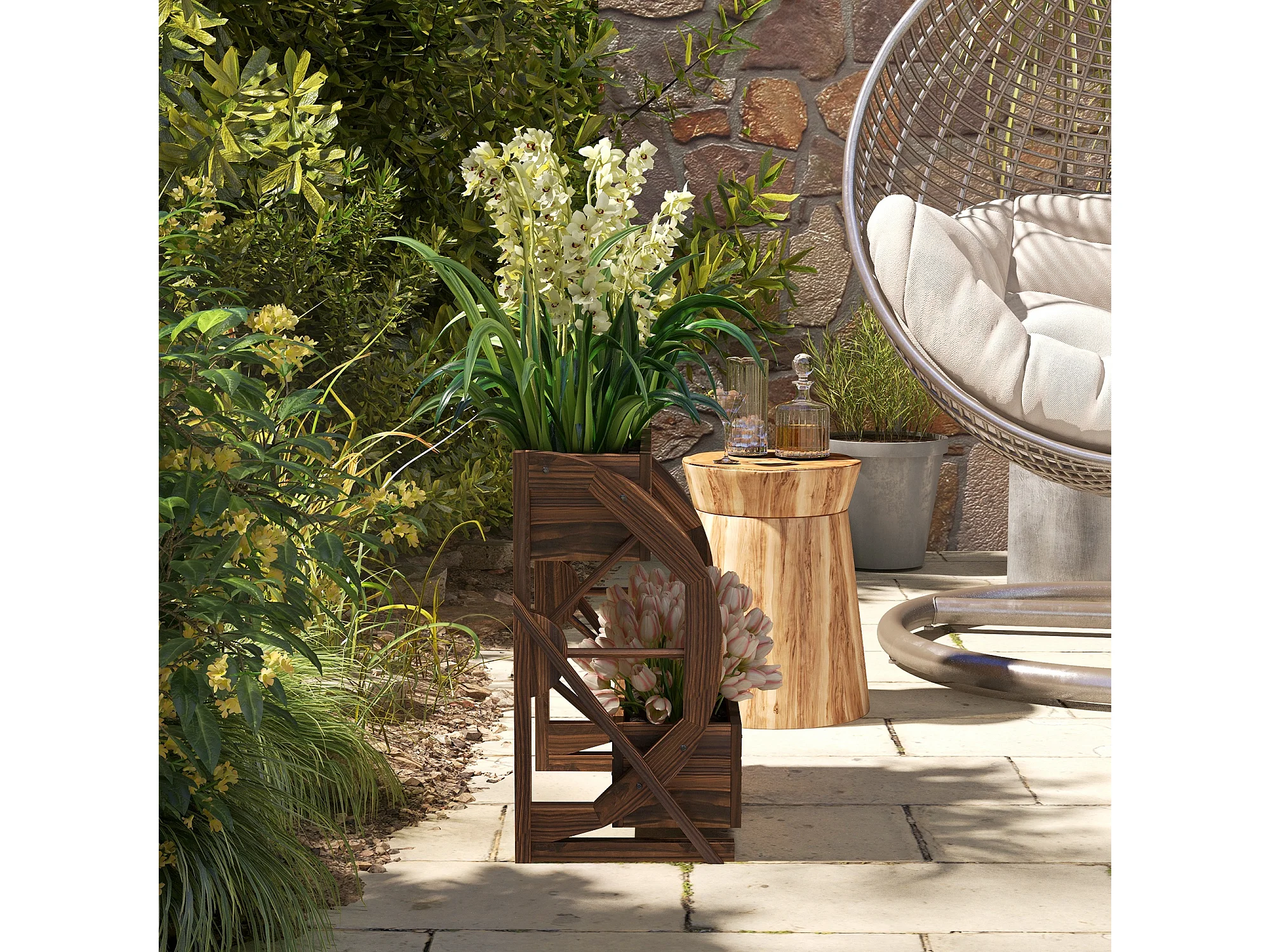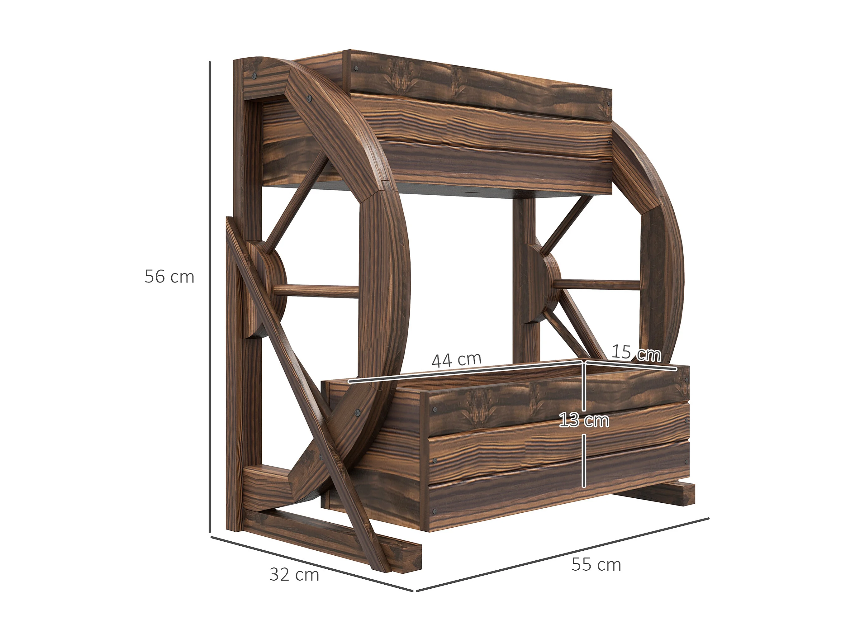 Fioriera da giardino a 2 livelli e 2 vasi con ruote di carro in legno