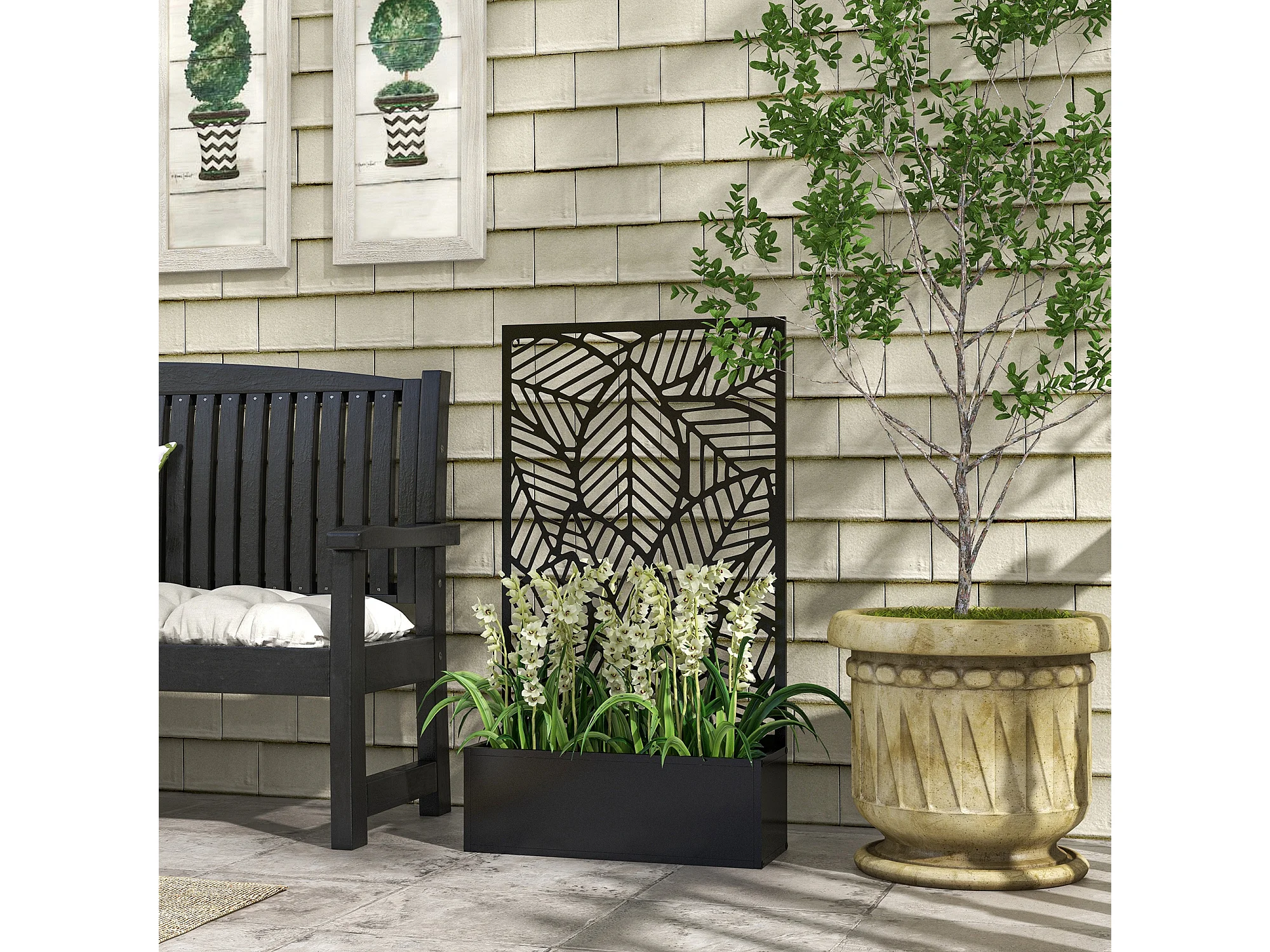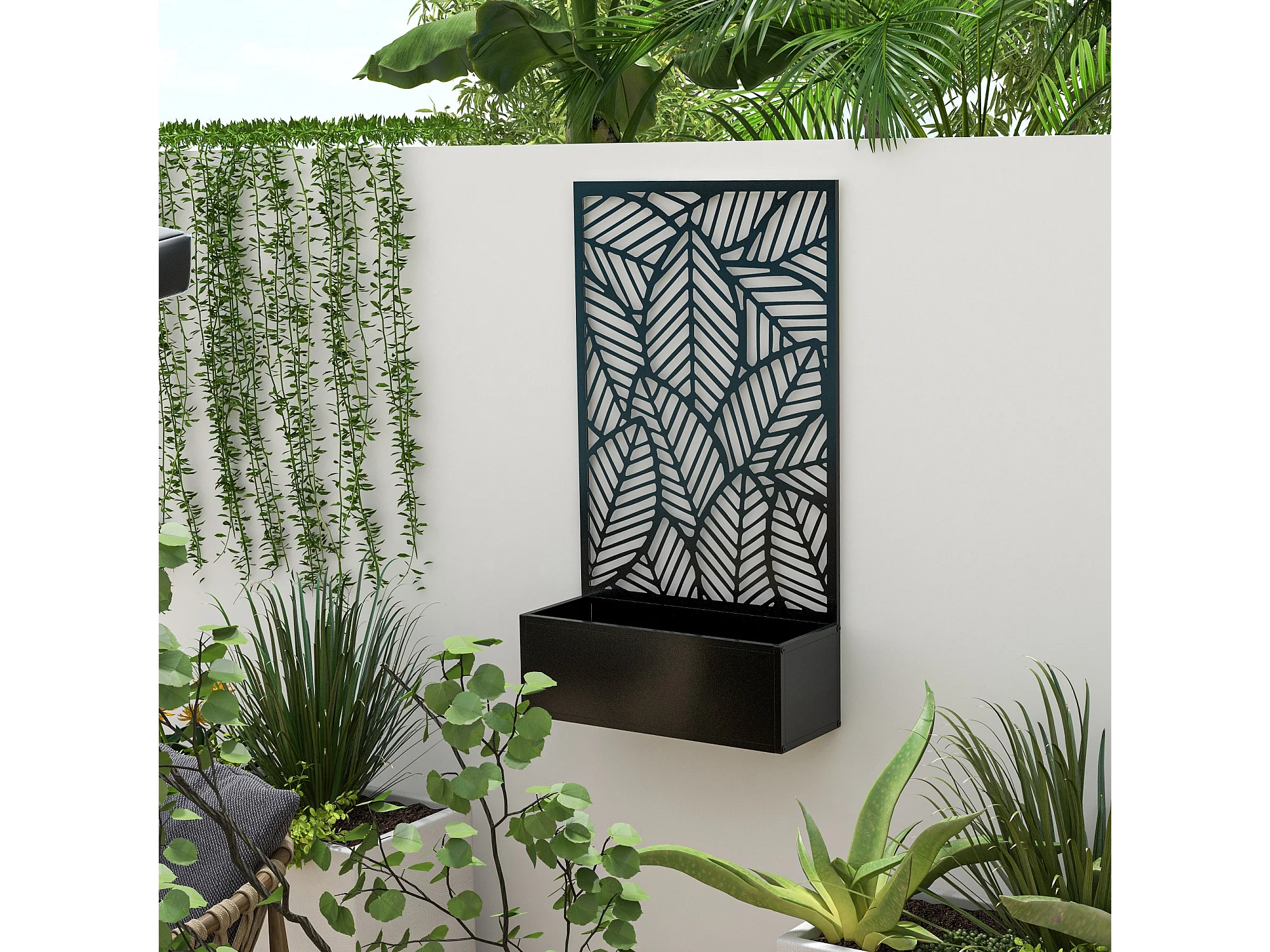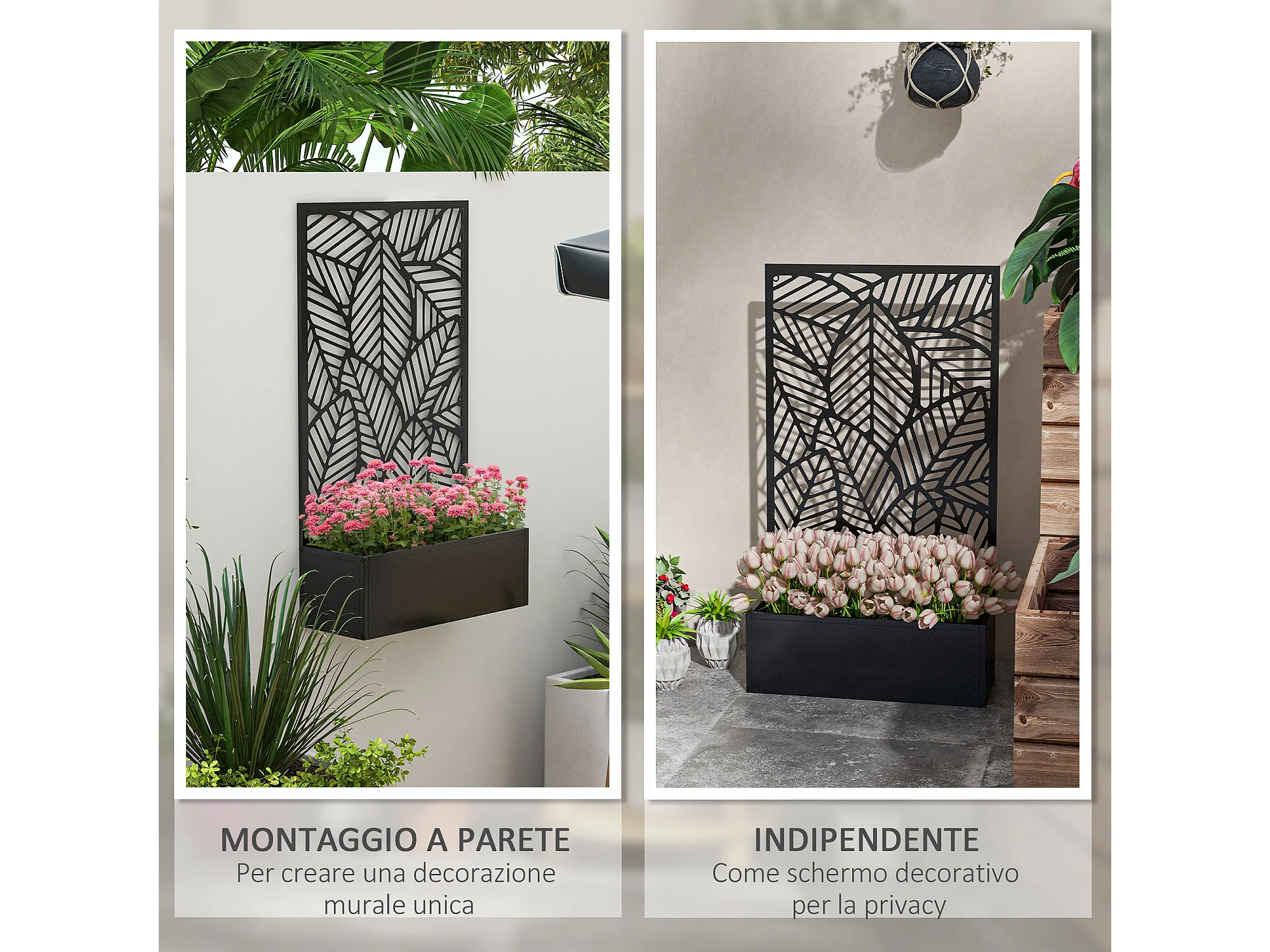 Fioriera rialzata con spalliera decorativa in metallo nero