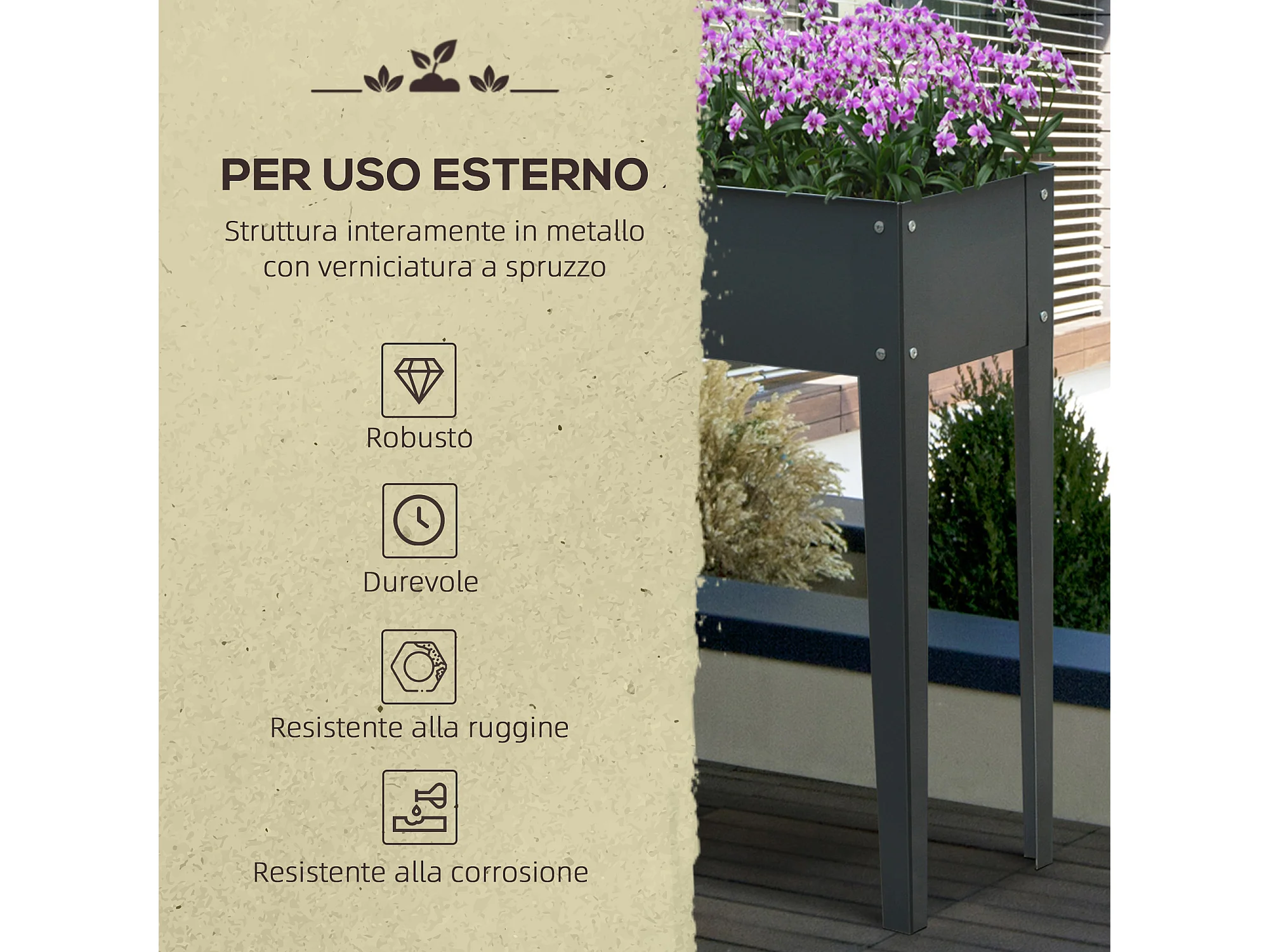 Letto da giardino rialzato in acciaio verniciato a polvere 100x100x36cm grigio