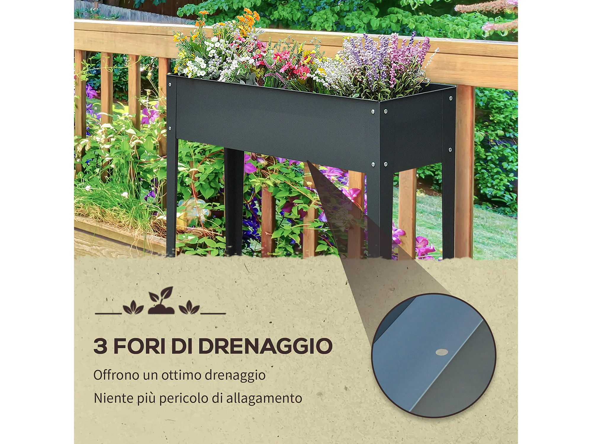 Fioriera rialzata in metallo con 3 fori di drenaggio grigio