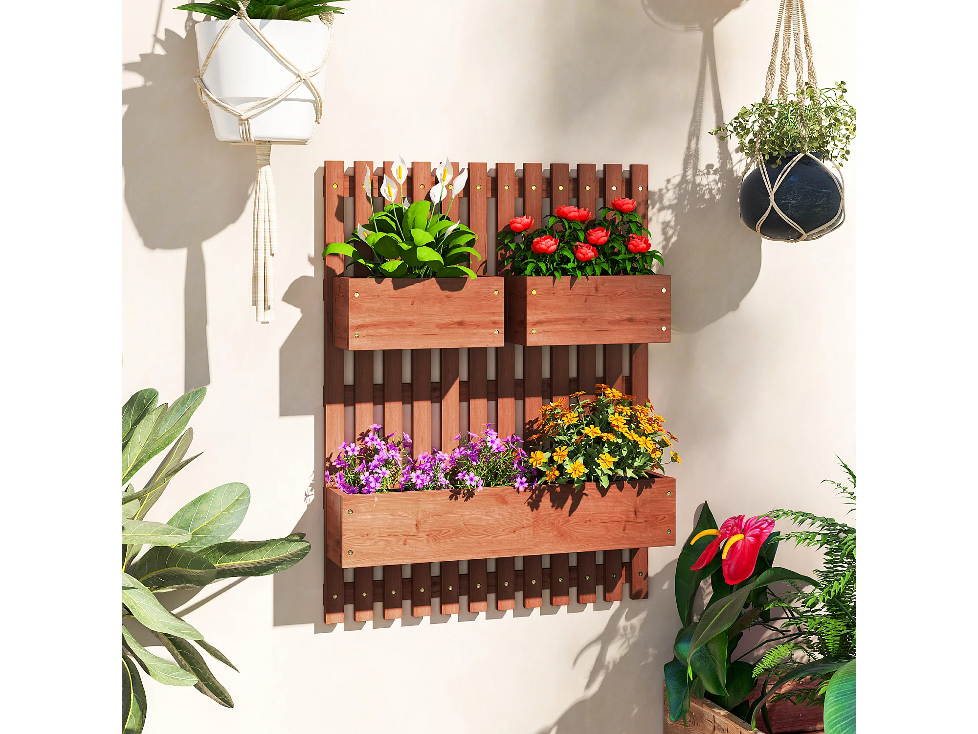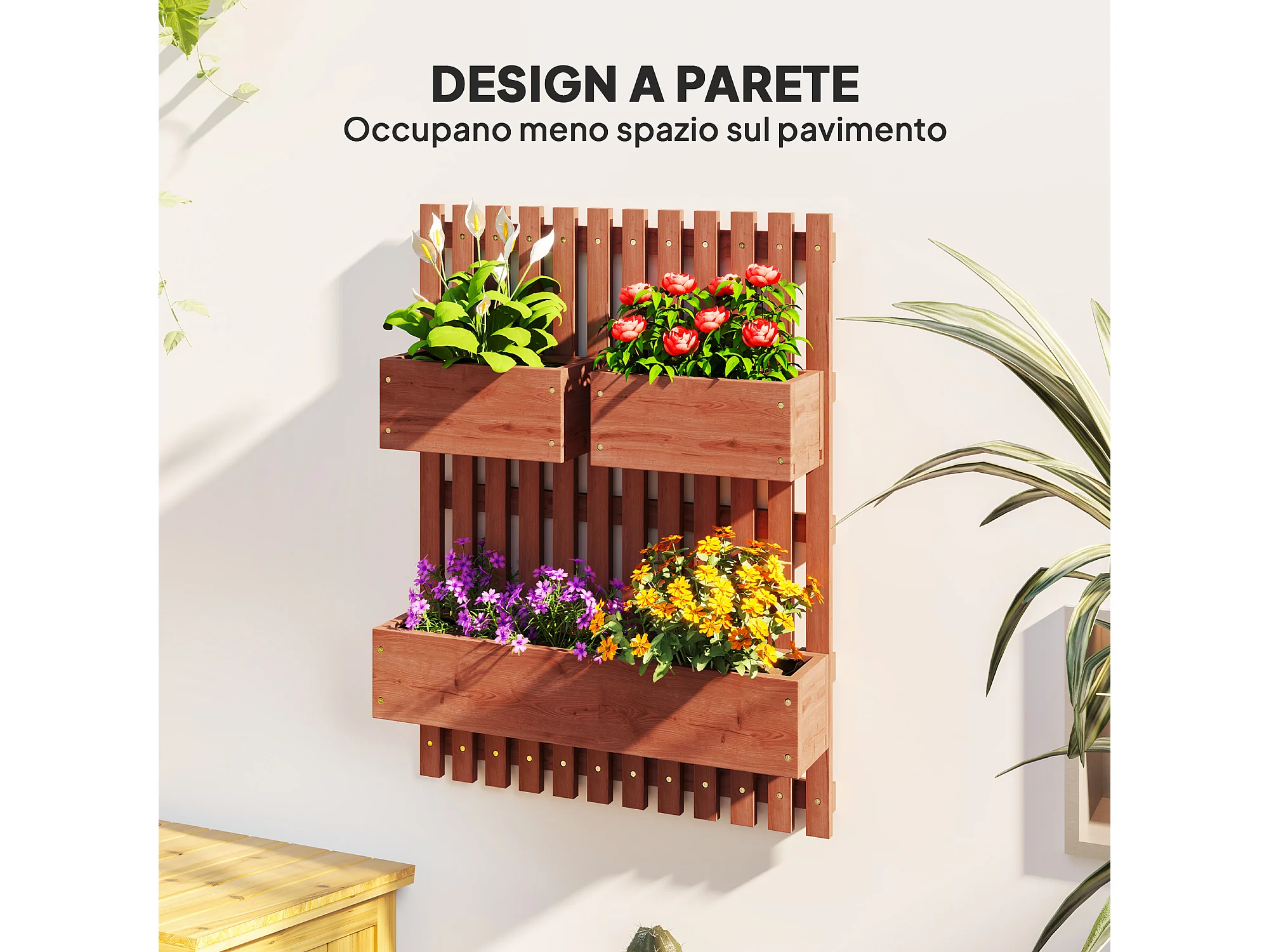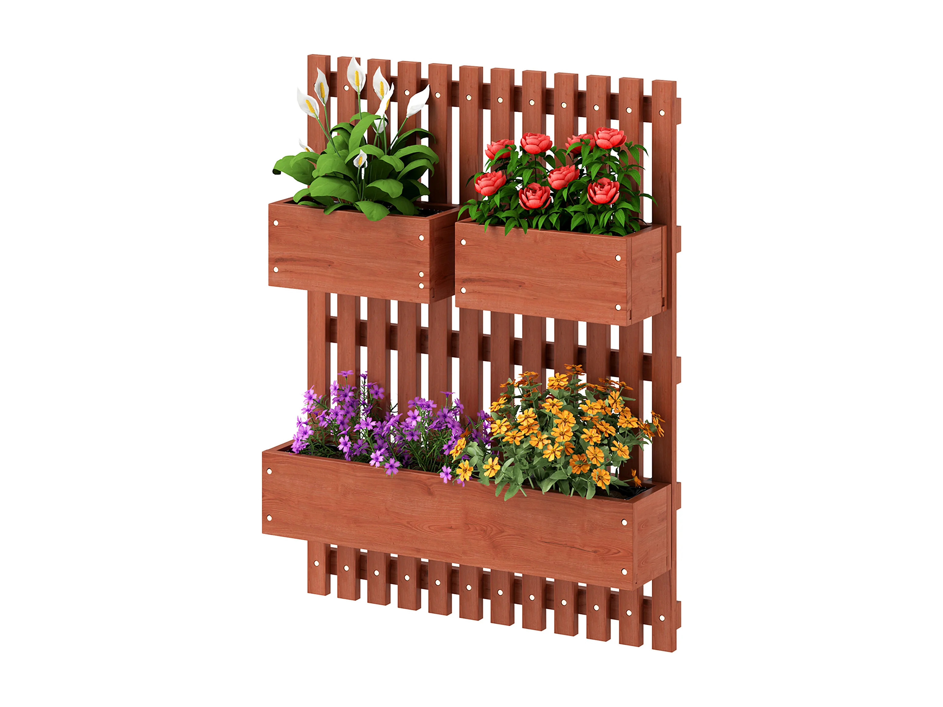 Fioriera verticale a doghe con 3 vasi rimovibili in legno marrone
