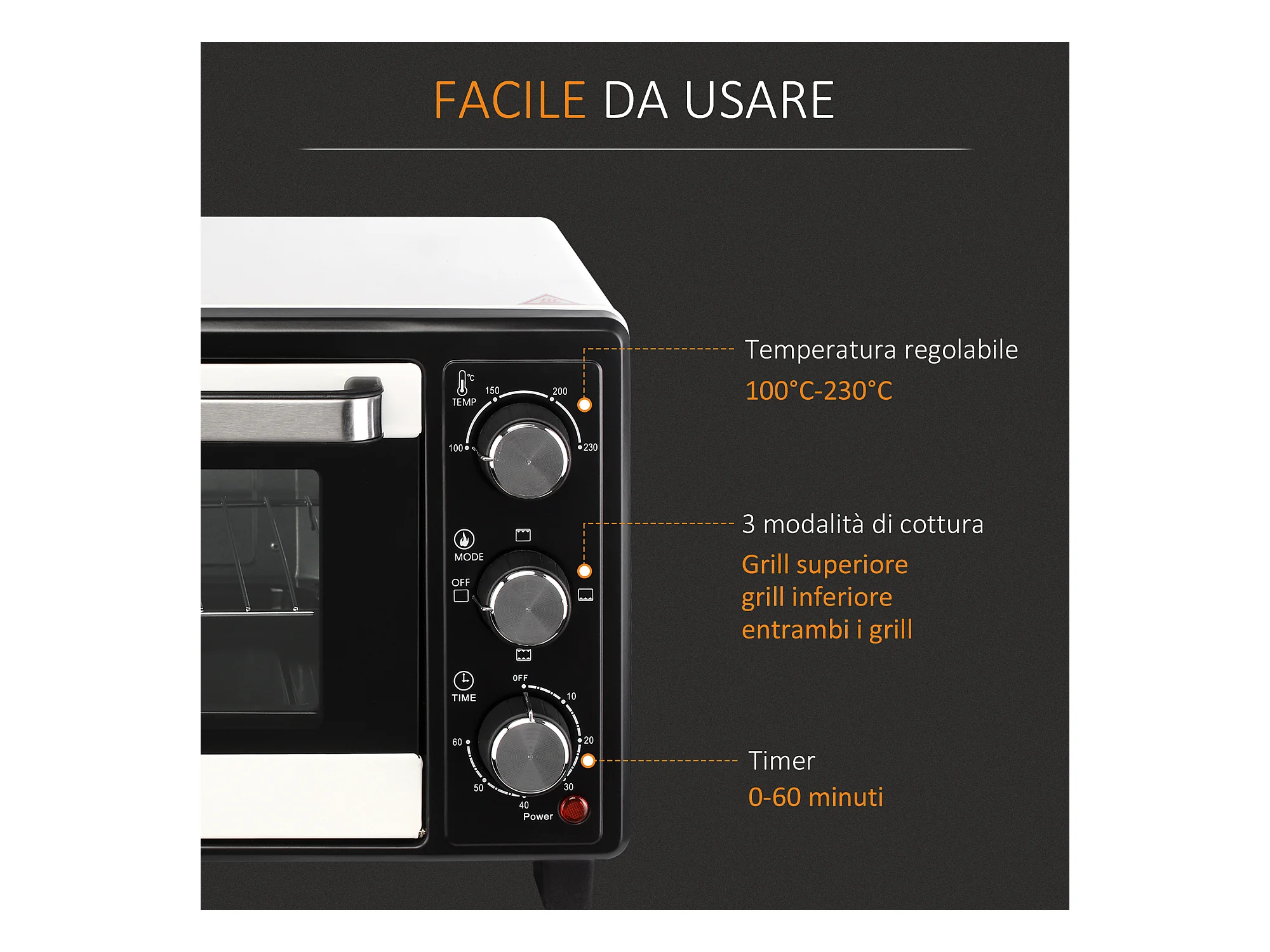 Fornetto mini da 21 litri con funzione girarrosto, 3 modalità di cottura, acciaio inox e vetro, 100°C-230°C, (46x38,5x29cm)