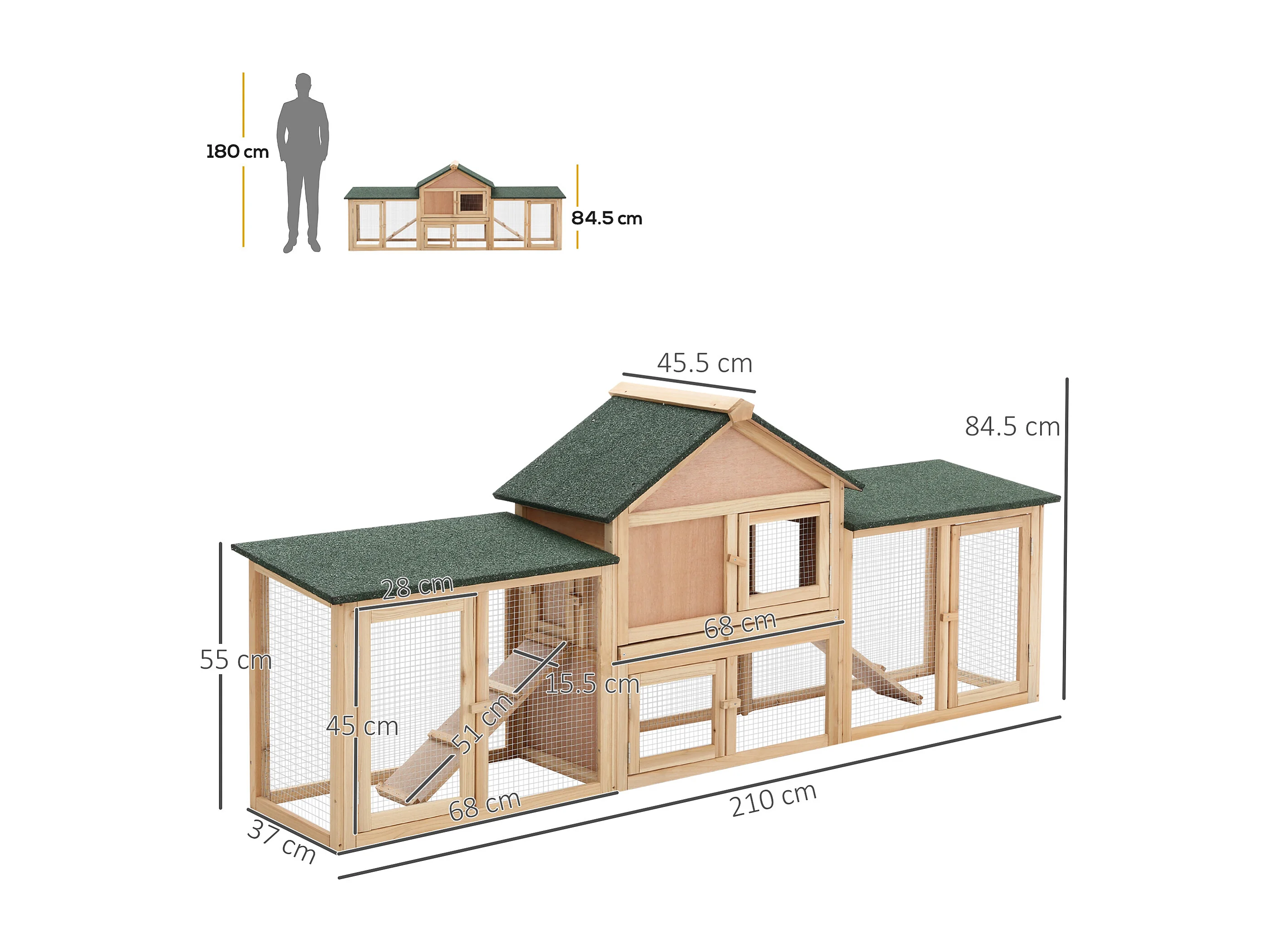 Gabbia per conigli conigliera recintata con rampe tetto impermeabile e vassoio estraibile 210 x 45.5 x 84.5 cm