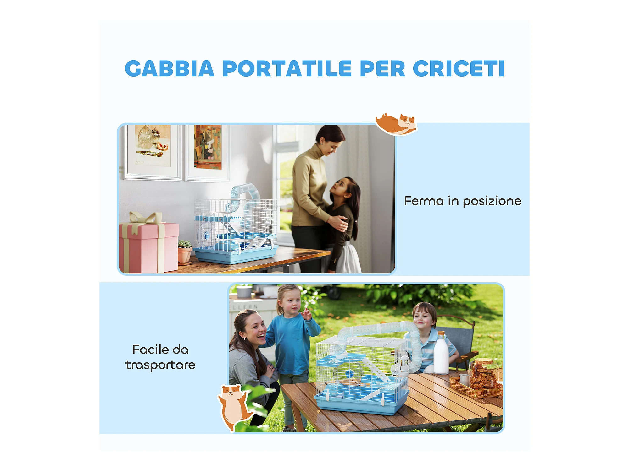 Gabbia per criceti 3 piani con casetta, ruota, ciotola e tubi, azzurro