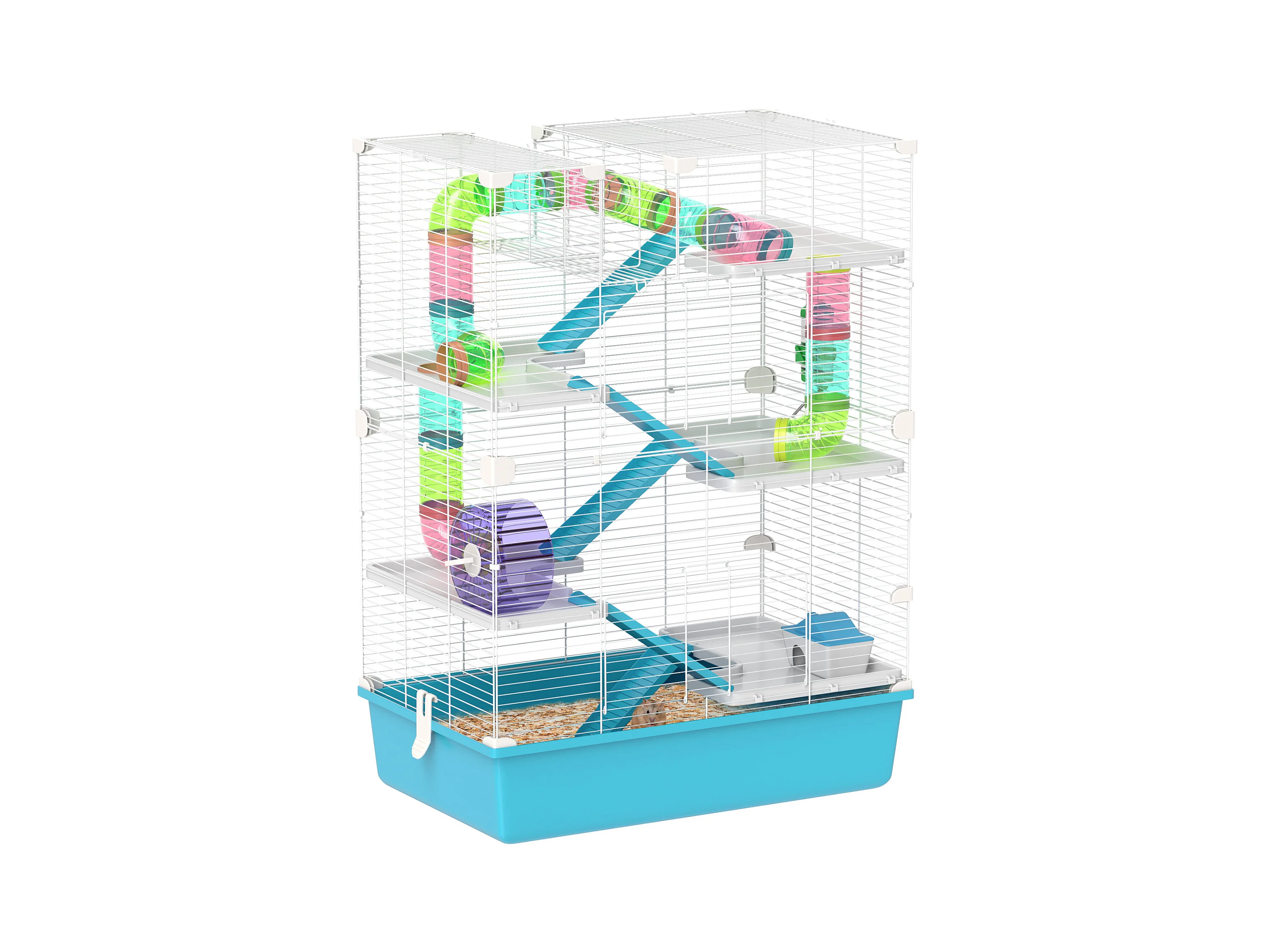 Gabbia per criceti 5 livelli con tubi casetta e ruota azzurra e bianca