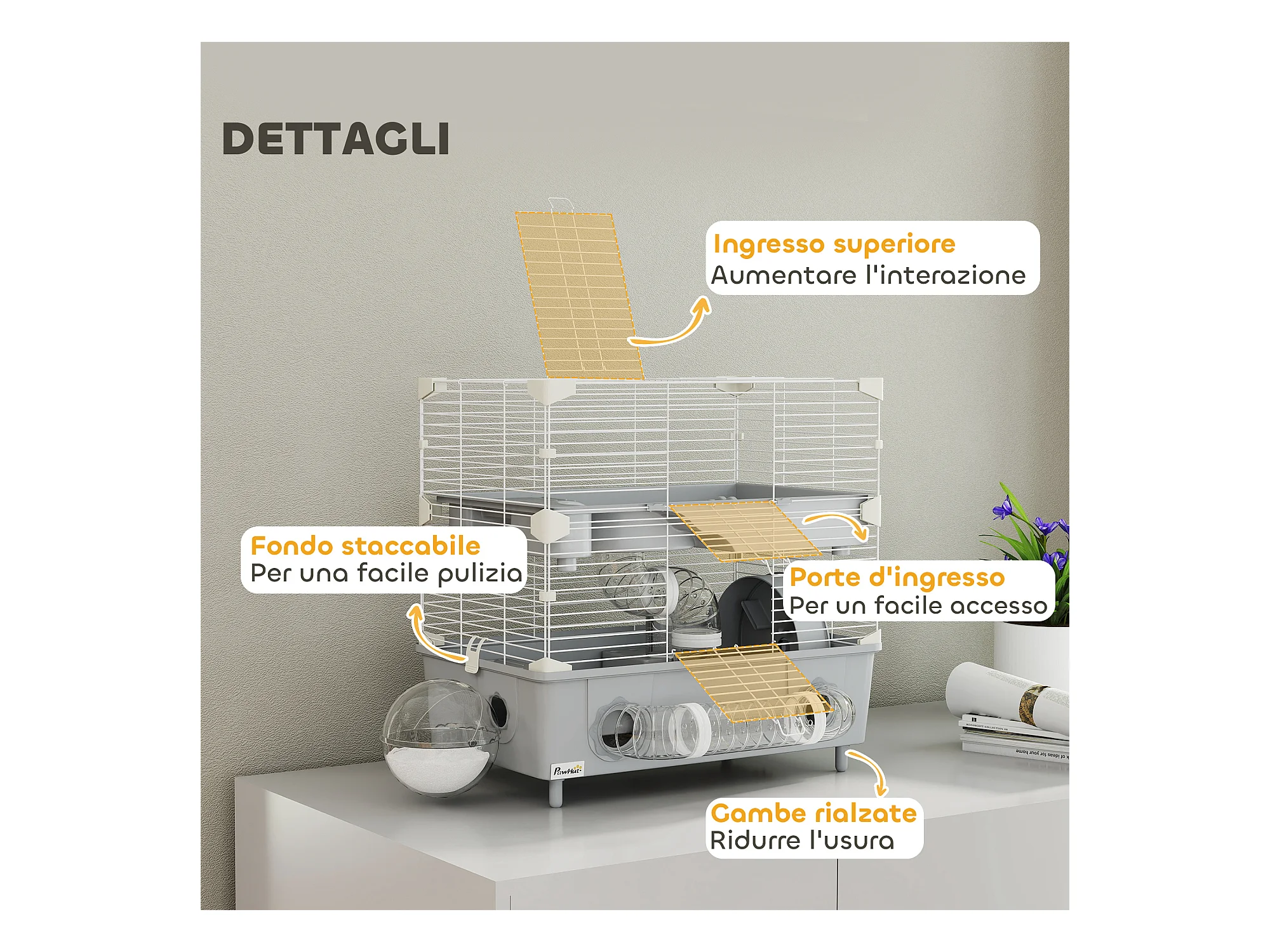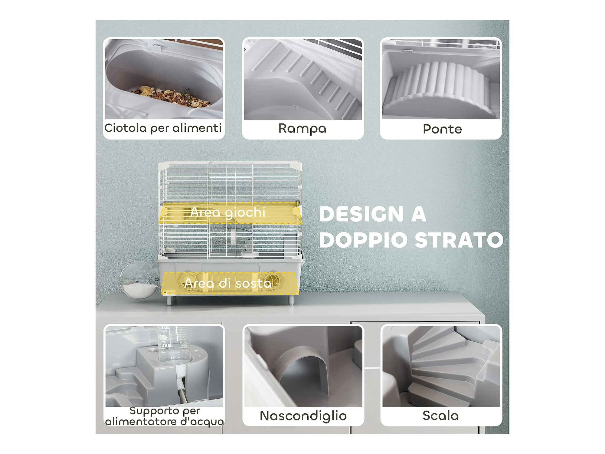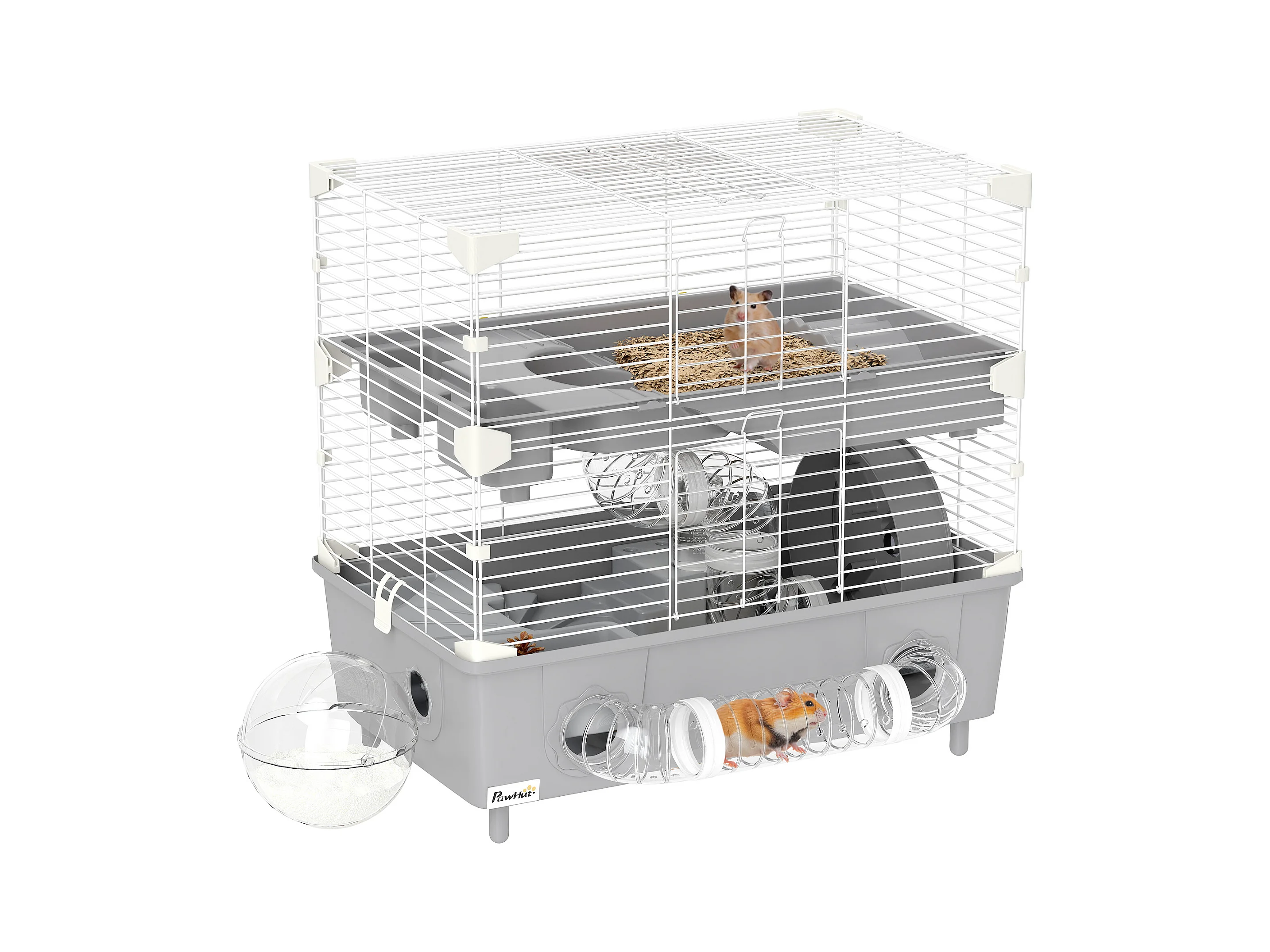Gabbia per criceti a 2 livelli e 3 porte con ruota e tubi grigio e bianco